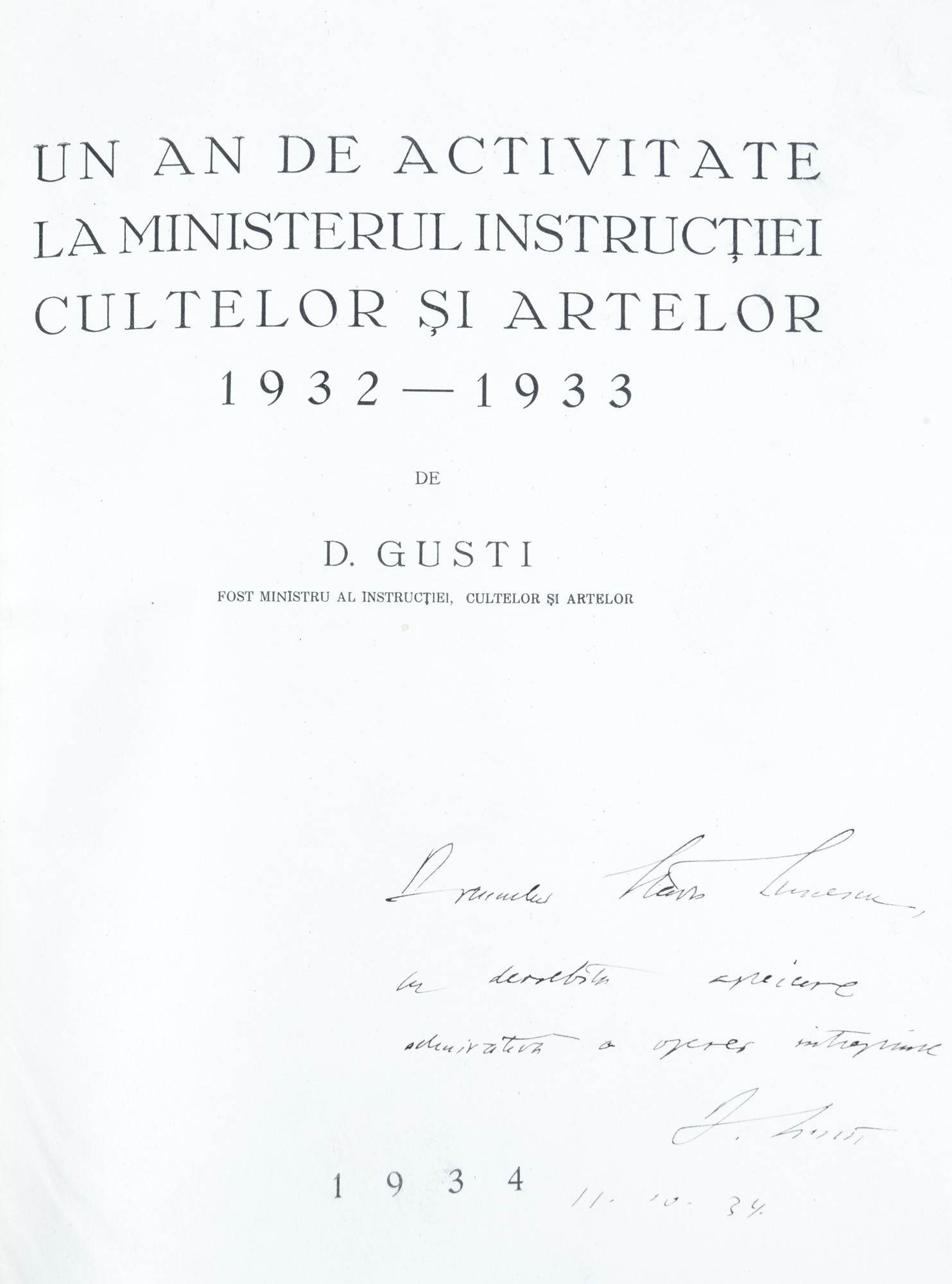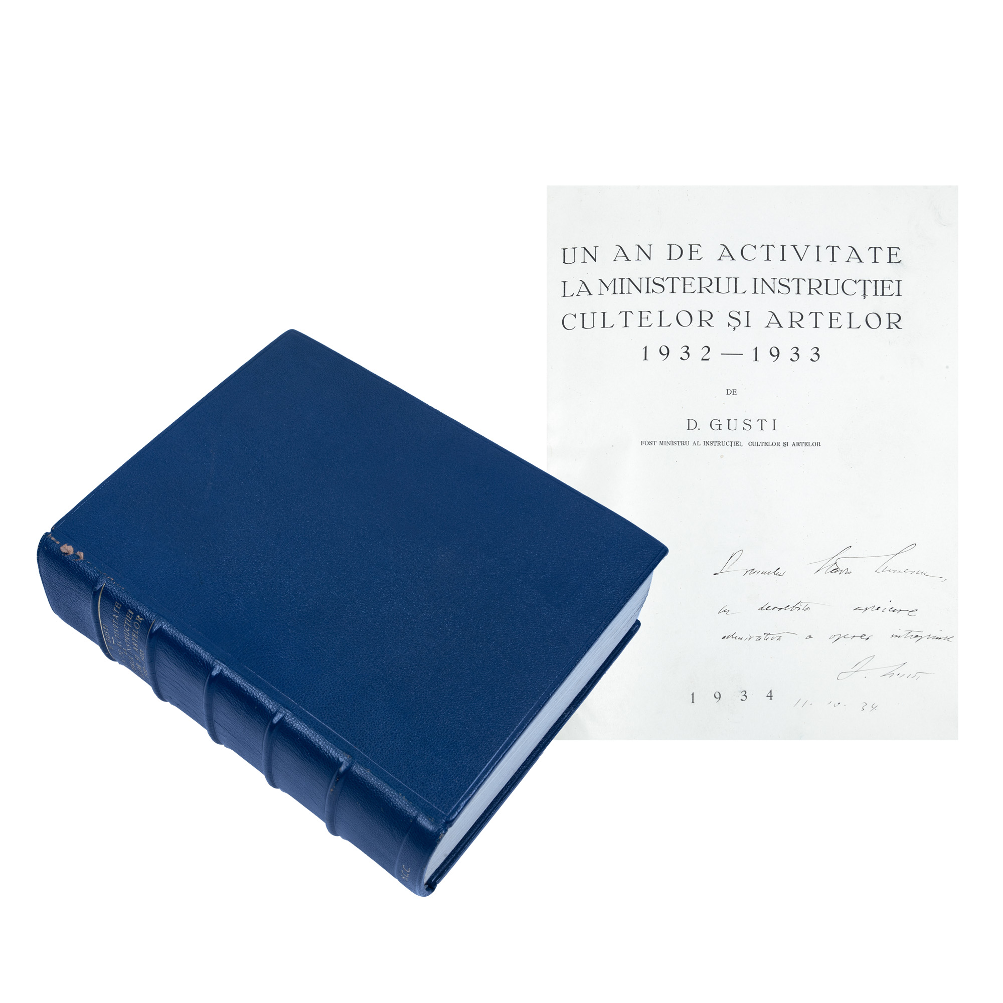 71. ”Un an de activitate la Ministerul Instrucției Cultelor și Artelor, 1932-1933”, de Dimitrie Gusti, București, 1934, exemplar bibliofil, cu dedicația și semnătura olografă a autorului