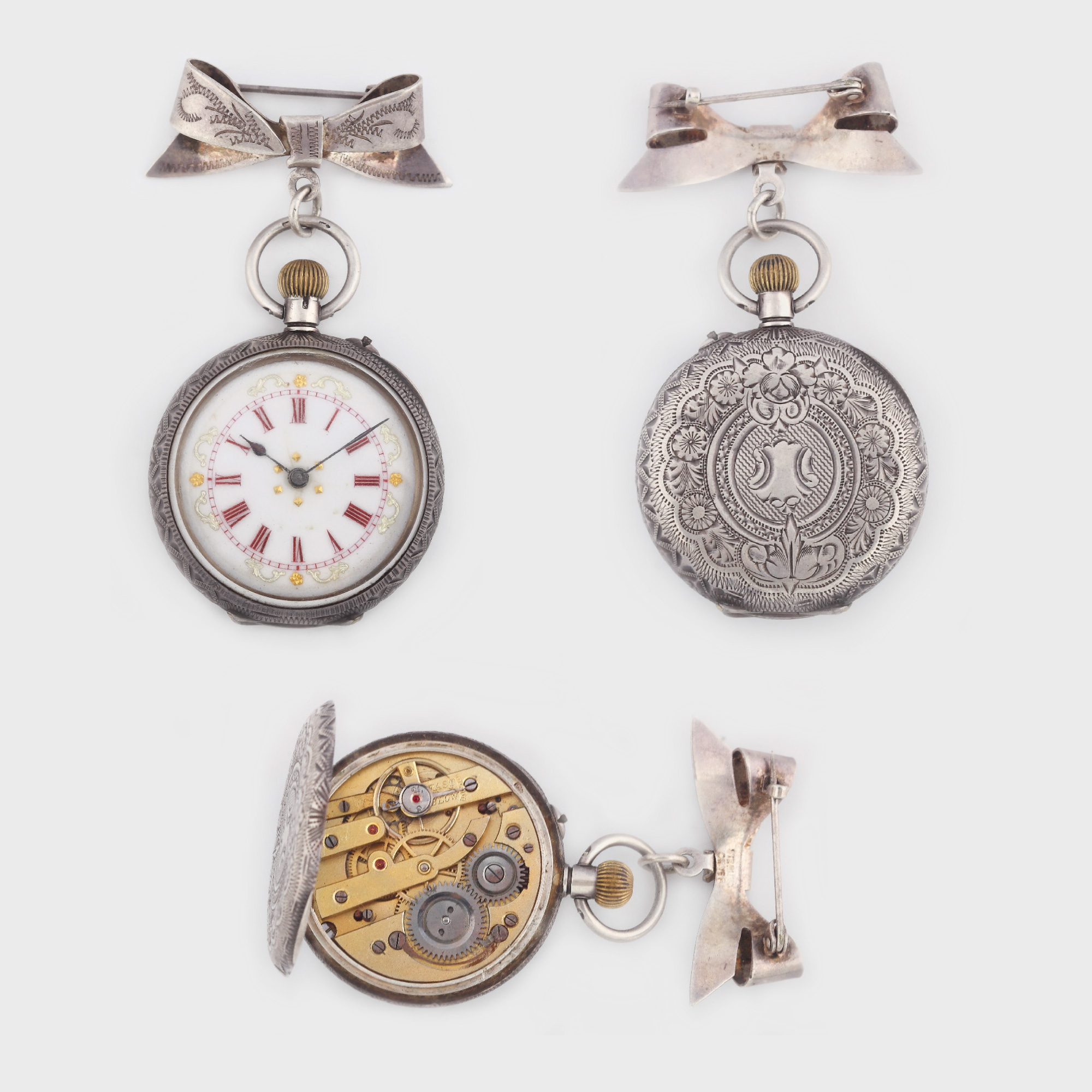 Ceas de damă, de buzunar, cu broşă în formă de fundiţă, cadran cu cifre romane. Mecanism cu întoarcere manuală, carcasă din argint, gravată cu motive florale.