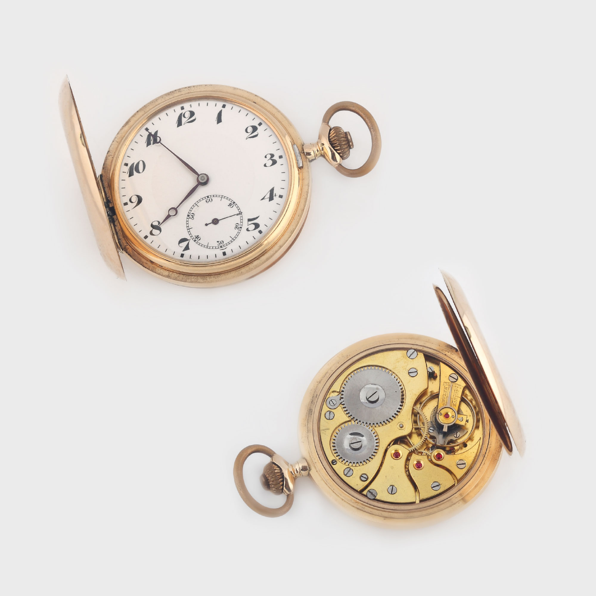 Ceas de buzunar, din aur, cu trei capace, cadran cu litere arabe şi secundar la ora 6, carcasă inscripţionată "JHH", mecanism cu întoarcere manuală, stare foarte bună de conservare.