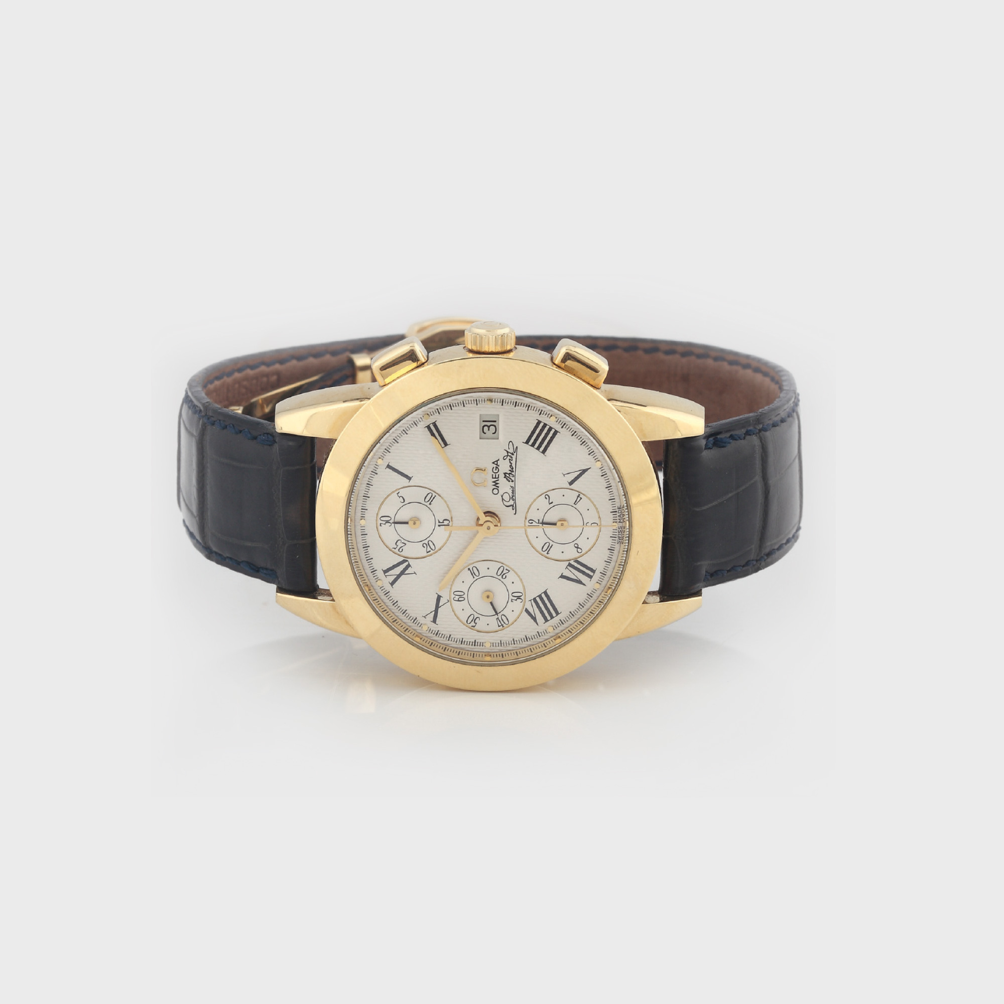 Ceas de mână, bărbătesc, Omega Louis Brandt, mecanism automatic chronograph, dată la ora 3. Cadran realizat în tehnica guilloche, mecanism vizibil pe spatele ceasului, curea din piele de crocodil, închizătoare din aur tip deployant. "Louis Brandt" desemnează o colecţie deosebită a brandului Omega, ceasurile inscripţionate astfel fiind extrem de rare.