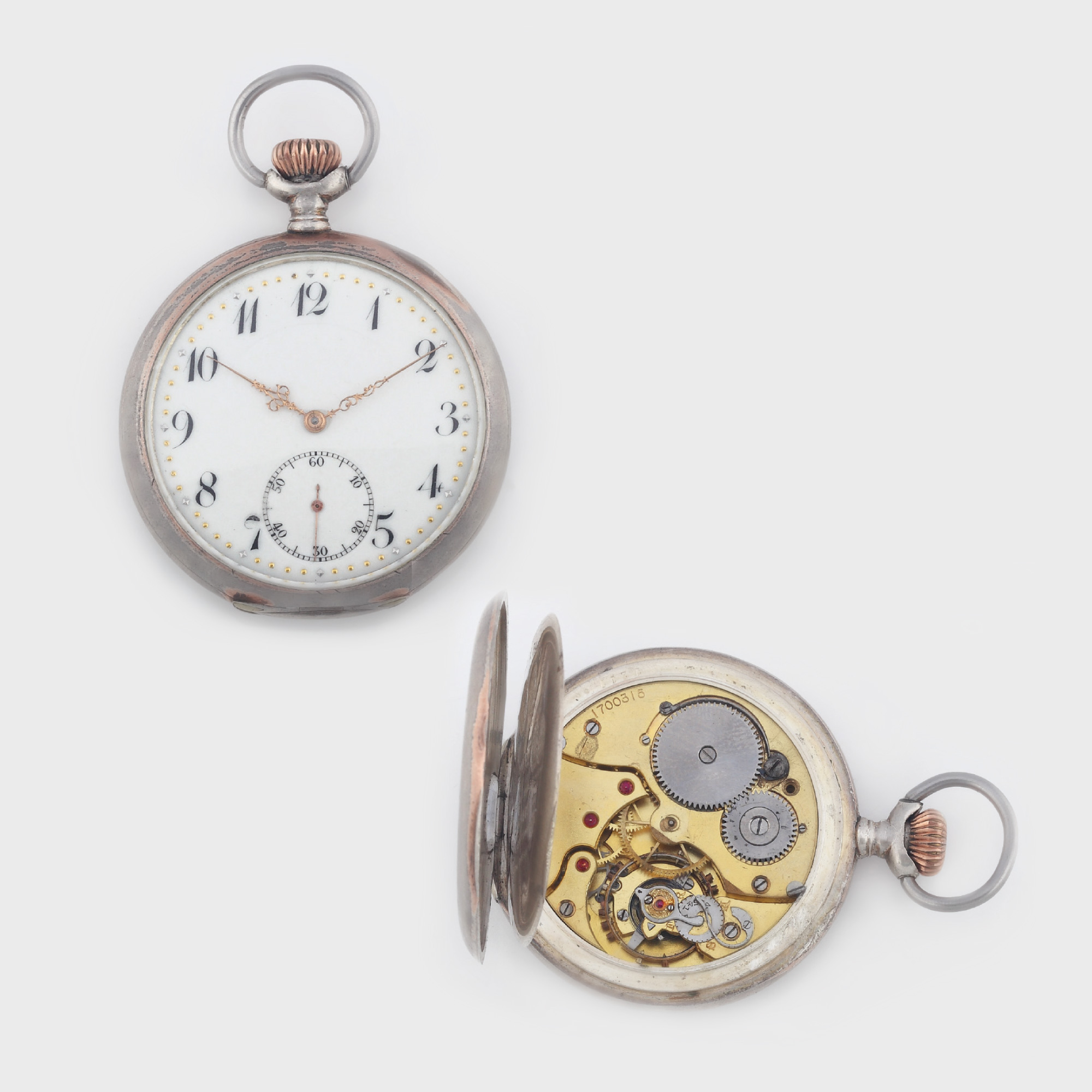 Ceas de buzunar, din argint 800, cu două capace, marca Zenith. Capac inscripţionat "Grand Prix Paris 1900" şi "Medaille d'Or Geneve 1946", mecanism cu întoarcere manuală şi dublu platou, având spiral Breguet. Serie mecanism 1700315, serie carcasă 2669699.