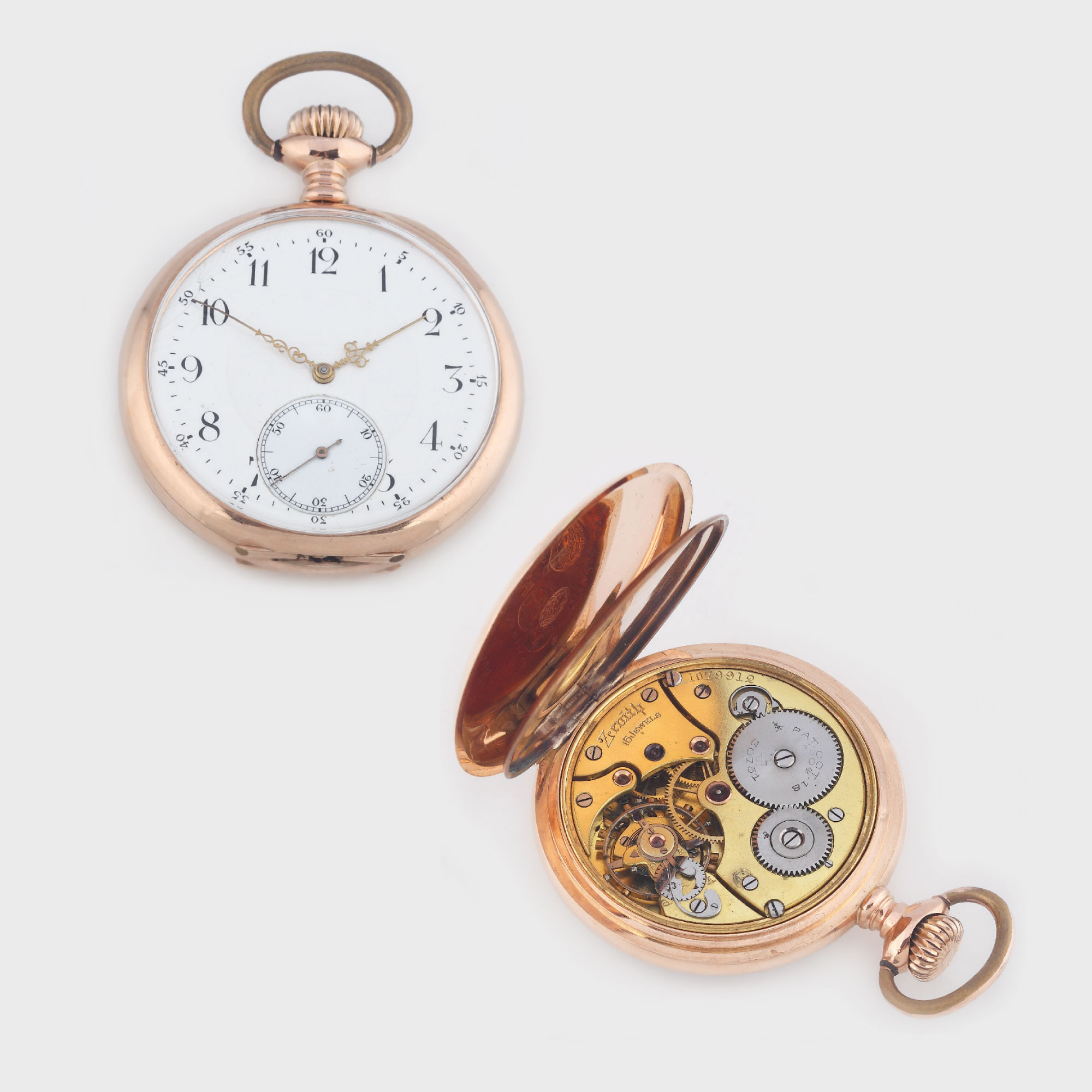 Ceas de buzunar, bărbătesc, din aur 14 k, cu două capace, marca Zenith. Capac inscripţionat "Grand Prix Paris 1900", mecanism cu armare manuală, 15 rubine şi spiral Breguet.