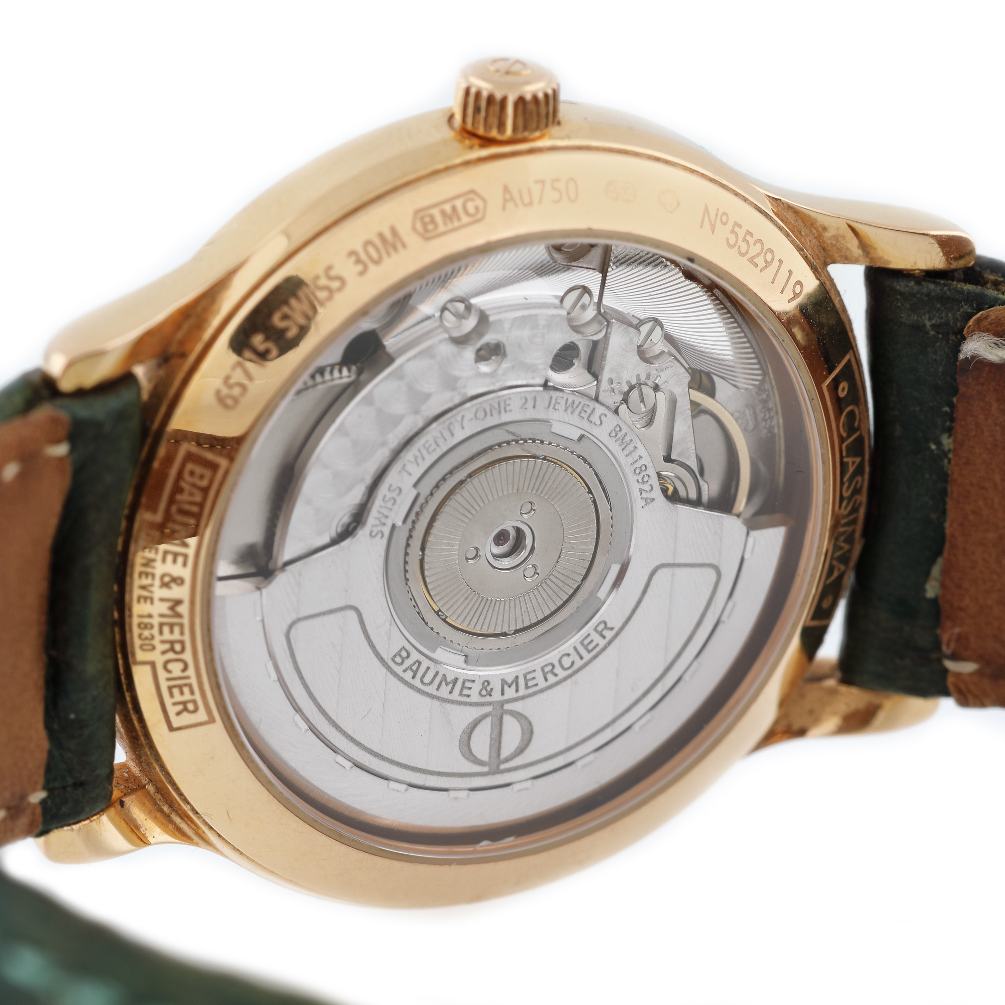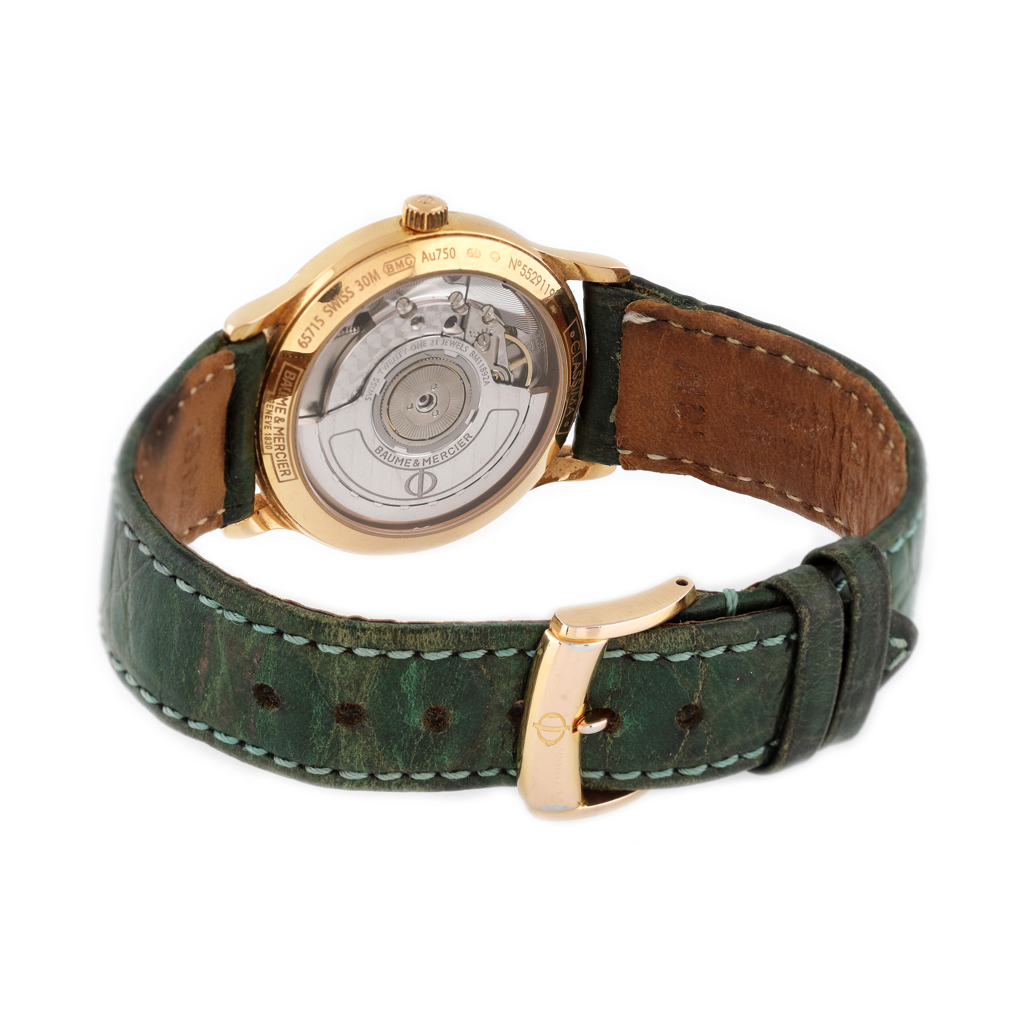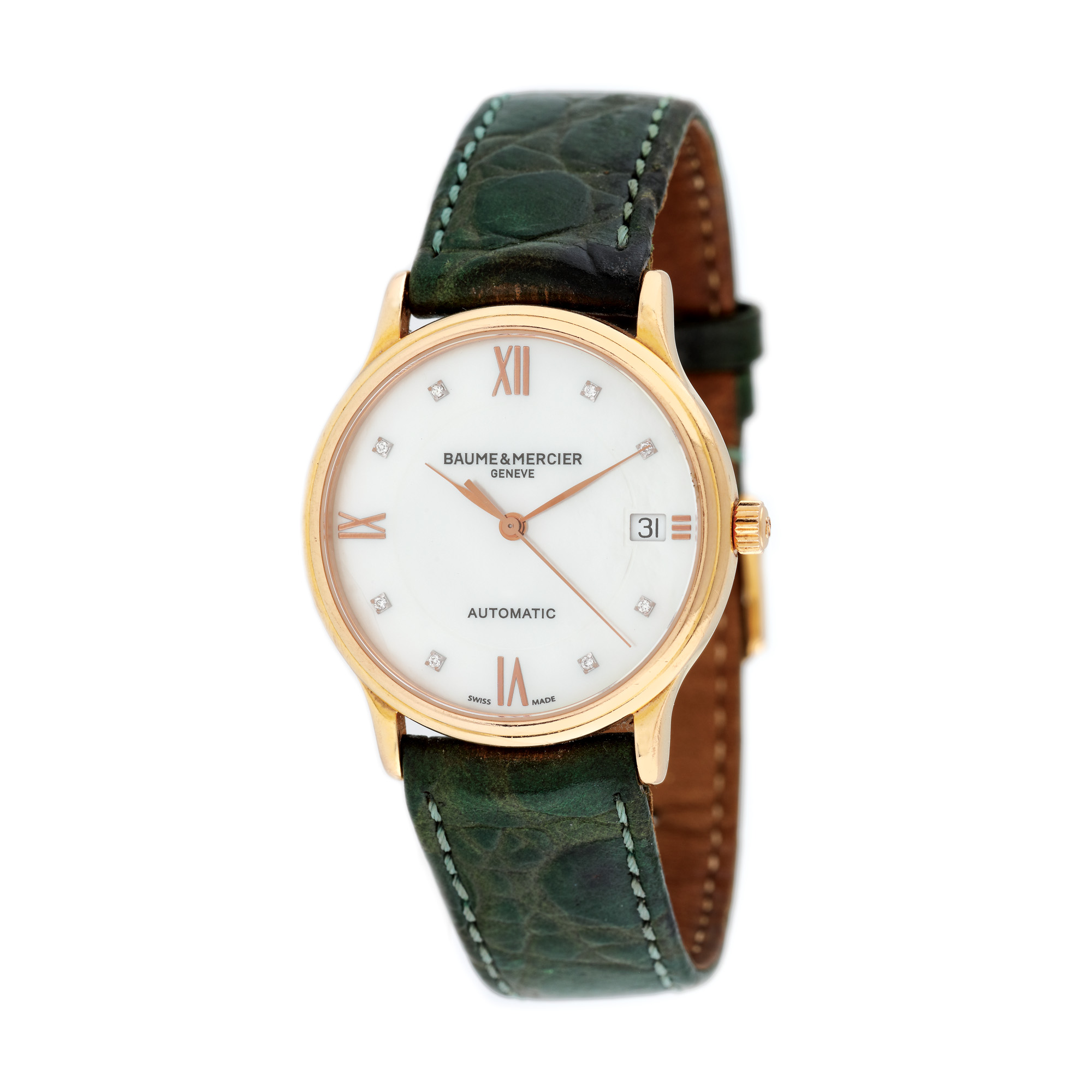 Ceas Baume Mercier, din aur roz, ornat cu sidef și diamante, de mână, de damă, referință 10077, mecanism automatic cu rezervă de timp de 42 h, vitrat anterior. Cadran din sidef în care dial-ul cuprinde numerale romane aurii alături de diamante și dată în dreptul orei 3. Ceasul prezintă curea din piele de aligator, de culoare verde.