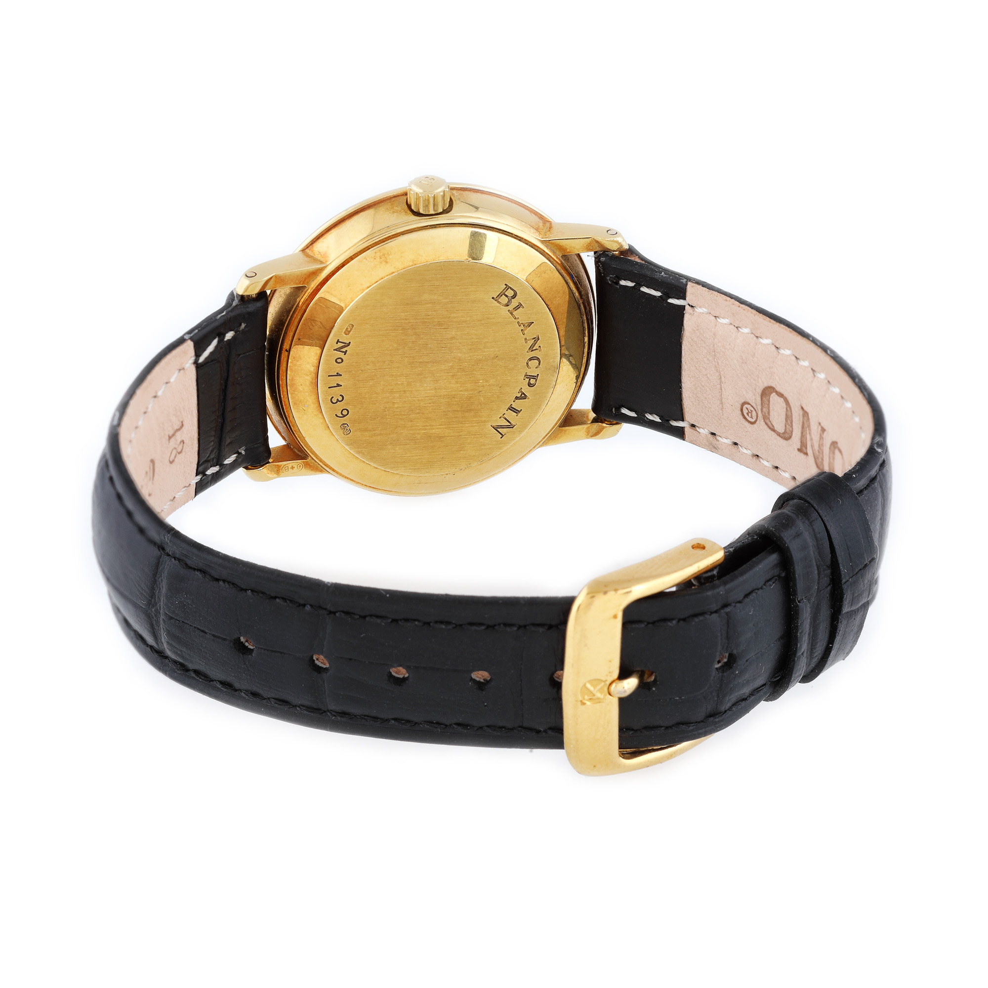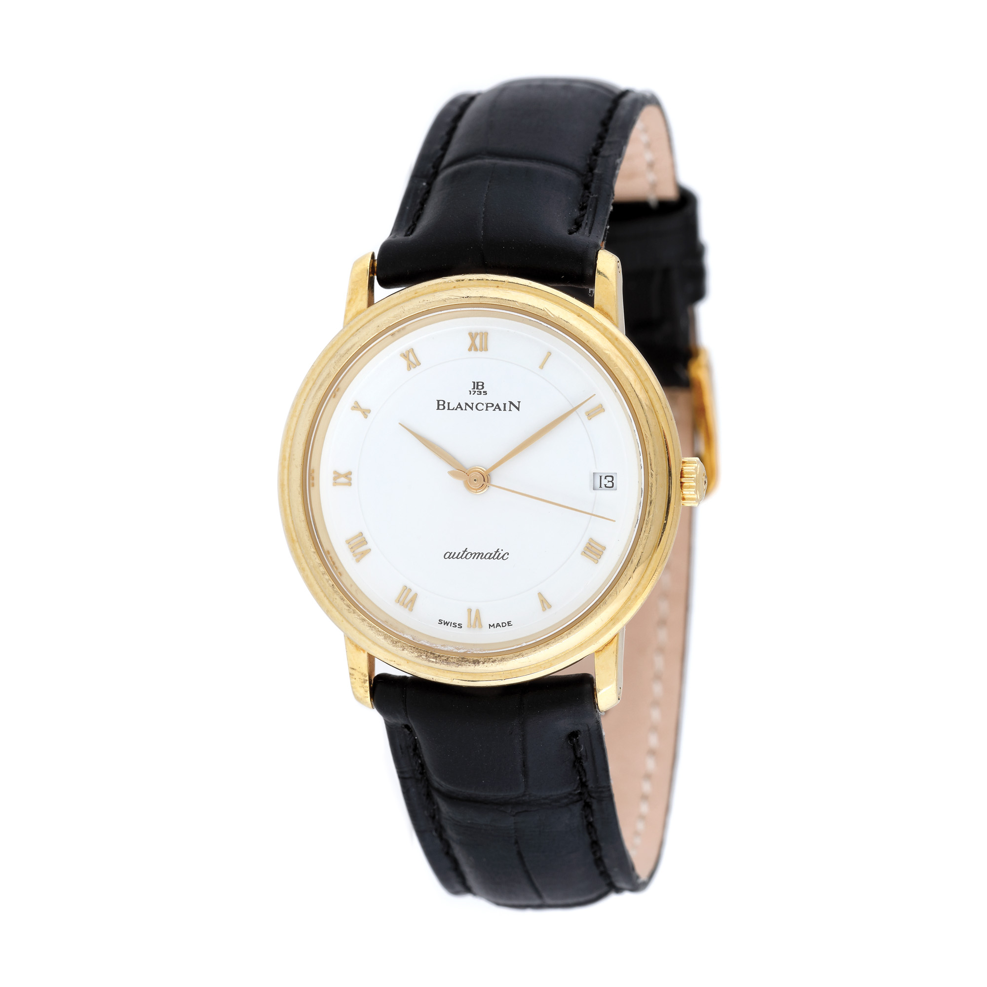Ceas Blancpain Villeret Ultra Slim, din aur, de mână, unisex, referință 1151-1418-55, mecanism automatic. Cadran de culoare alb, cu numerale romane și dată în dreptul orei 3. Curea și cataramă adăugate aftermarket.