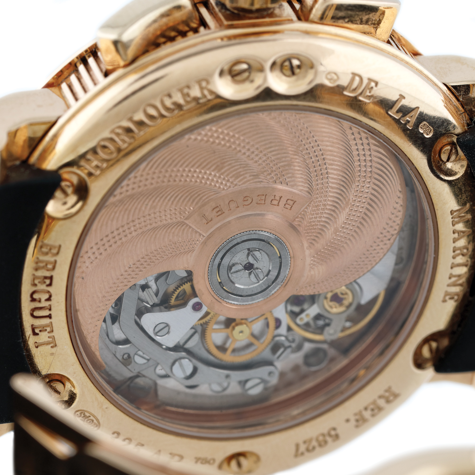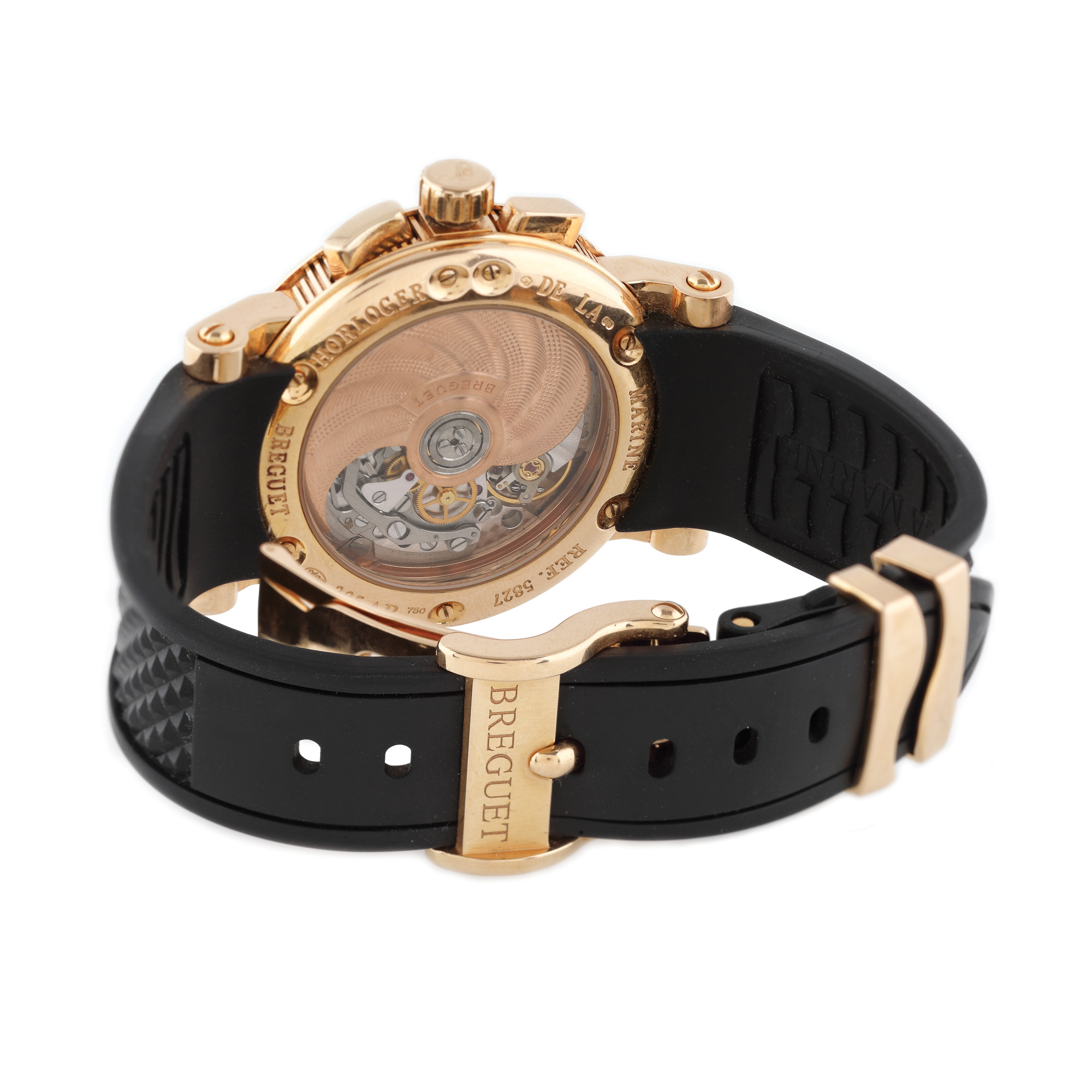 Ceas Breguet Marine Chronograph, din aur roz, de mână, bărbătesc, referință 5827br/z2/5zu, mecanism automatic, anterior vitrat. Cadran decorat în tehnica guilloché, cu numerale romane, două registre și dată în dreptul orei 6. Curea din cauciuc și sistem de închidere din aur roz, tip deployant, originale. Ceasul vine însoțit de actele de proveniență.