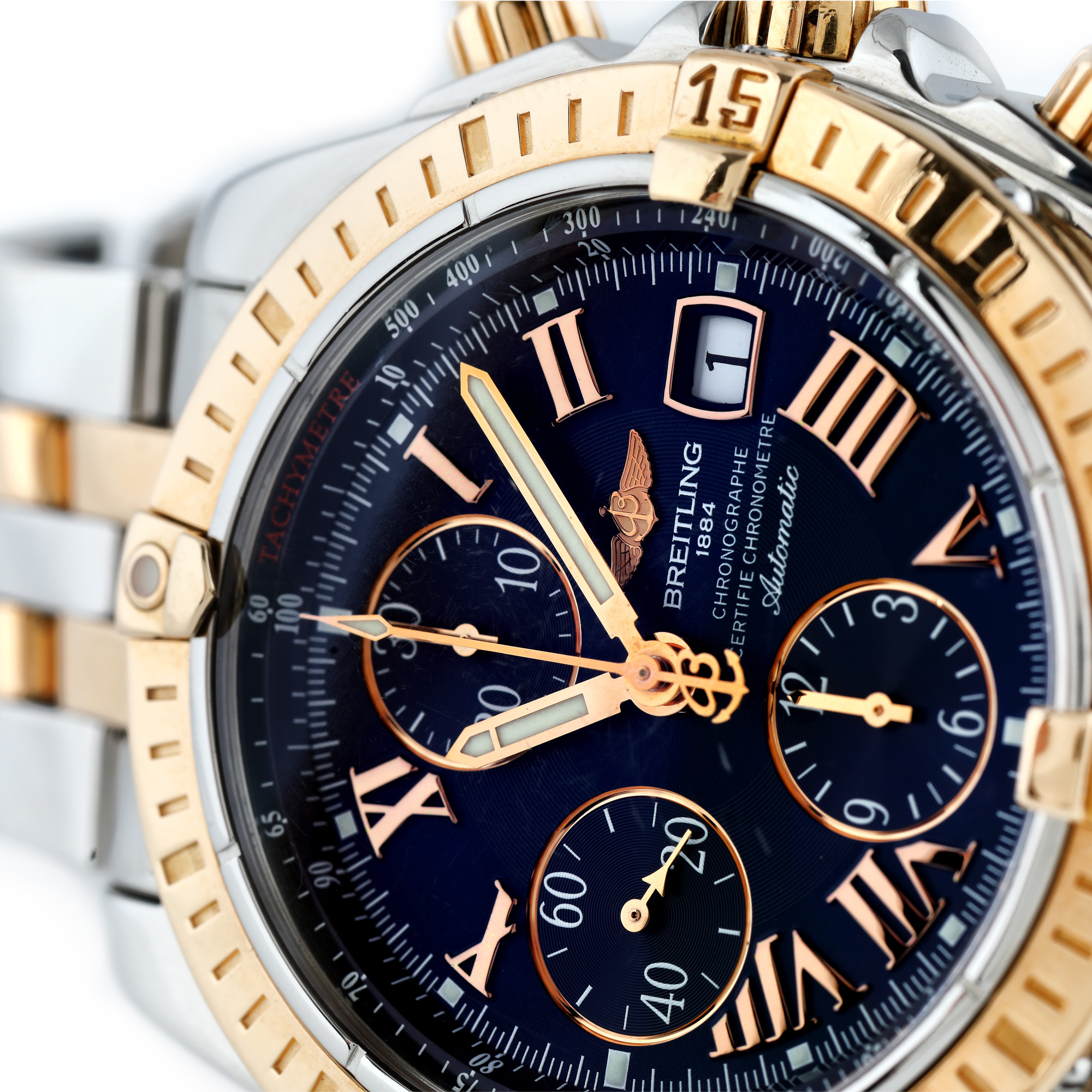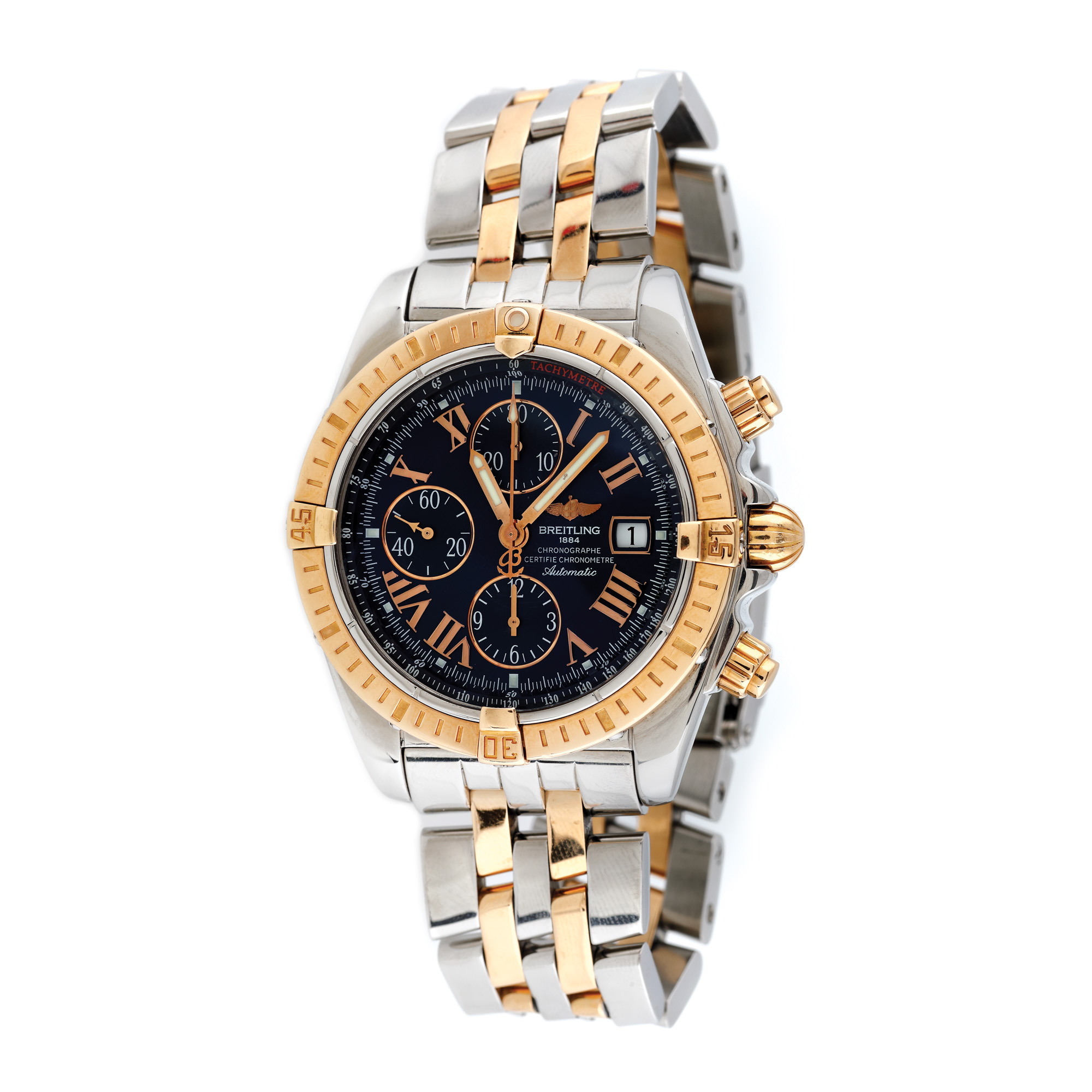 Ceas Breitling Chronomat Evolution, din aur roz și oțel, de mână, bărbătesc, referința C13356, mecanism automatic. Cadran de culoare bleumarin, numerale romane, trei registre, dată în dreptul orei 3 și bezel rotativ unidirecțional. Brățară din aur roz și oțel, cu sistem de închidere tip deployant, originale. Ceasul vine însoțit de actele de proveniență.