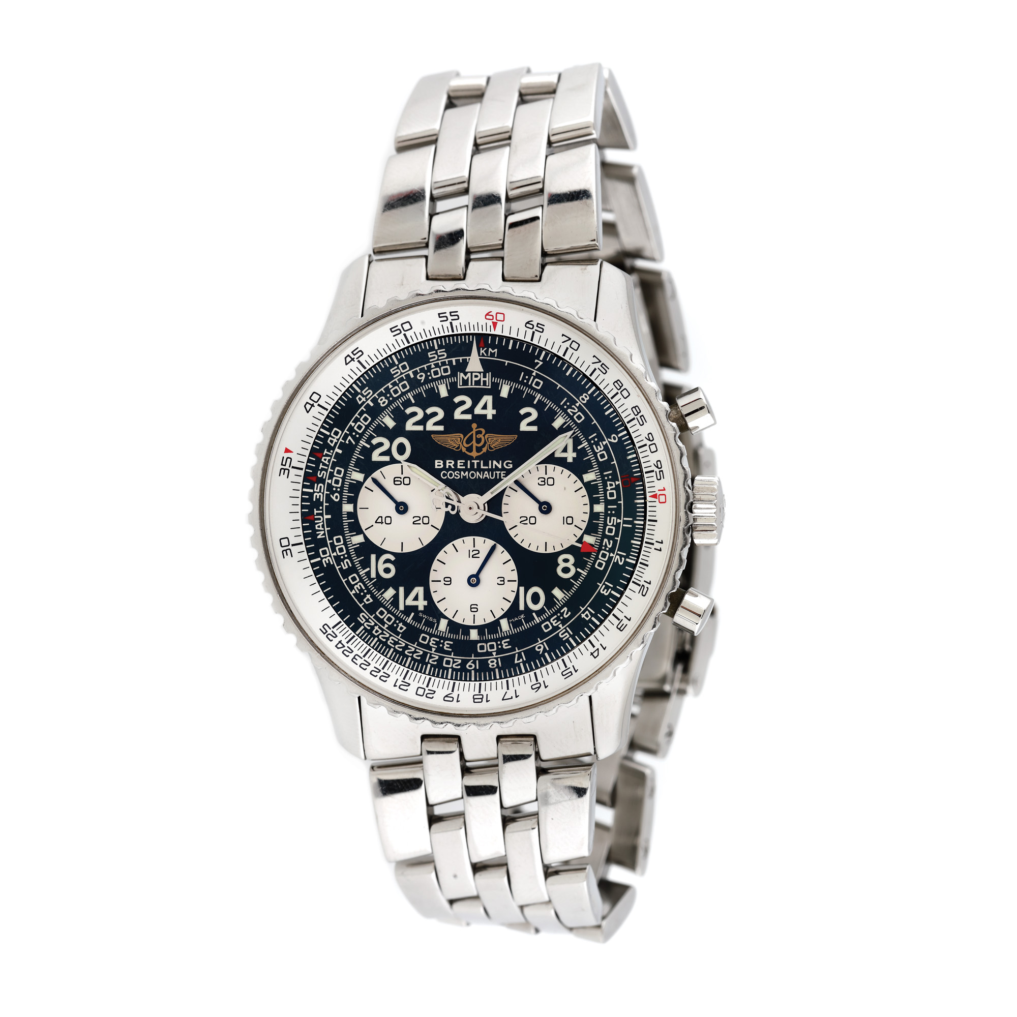 Ceas Breitling Navitimer Cosmonaute, de mână, bărbătesc, referință A12022, mecanism manual. Cadran de culoare bleumarin, cu numerale arabe și trei registre. Brățară cu închizătoare tip deployant, originală. Ceasul vine însoțit de actele de proveniență.