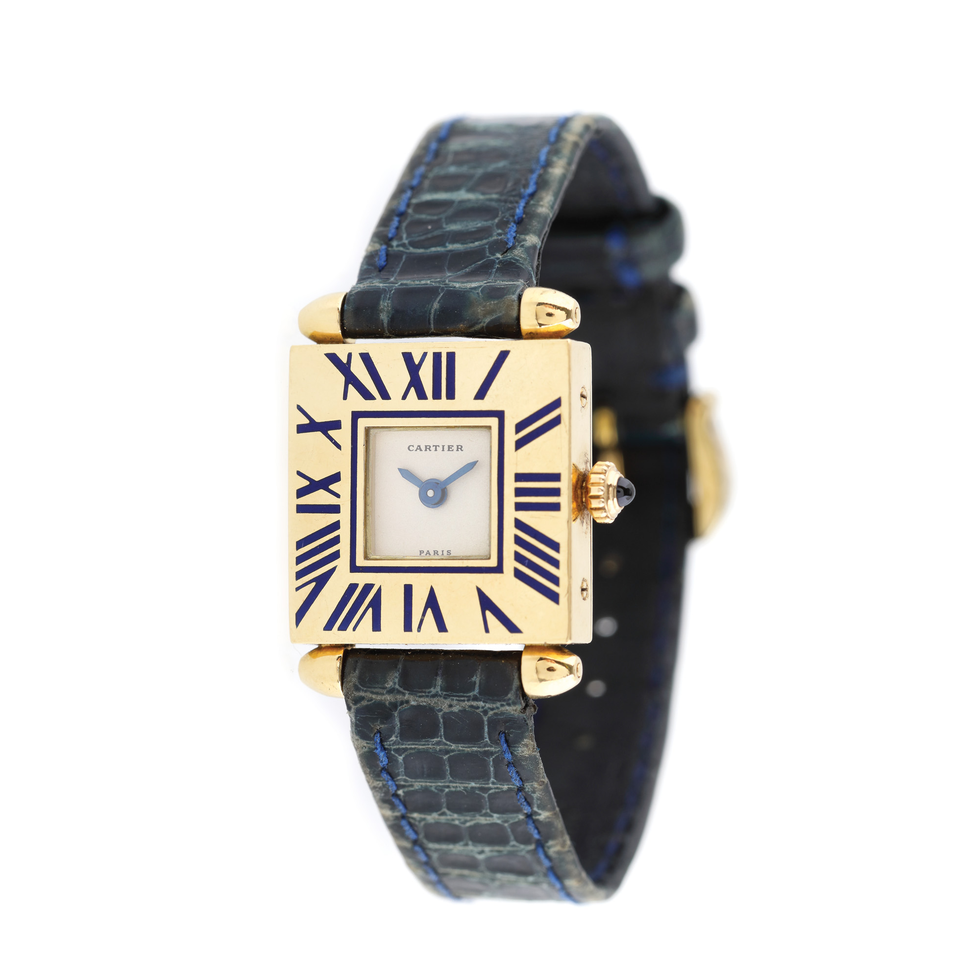Ceas Cartier Quadrant, din aur, de mână, de damă, mecanism quartz. Cadran de culoare alb, cu numerale romane gravate pe bezel. Curea din piele de aligator, de culoare bleumarin și cataramă, originale.