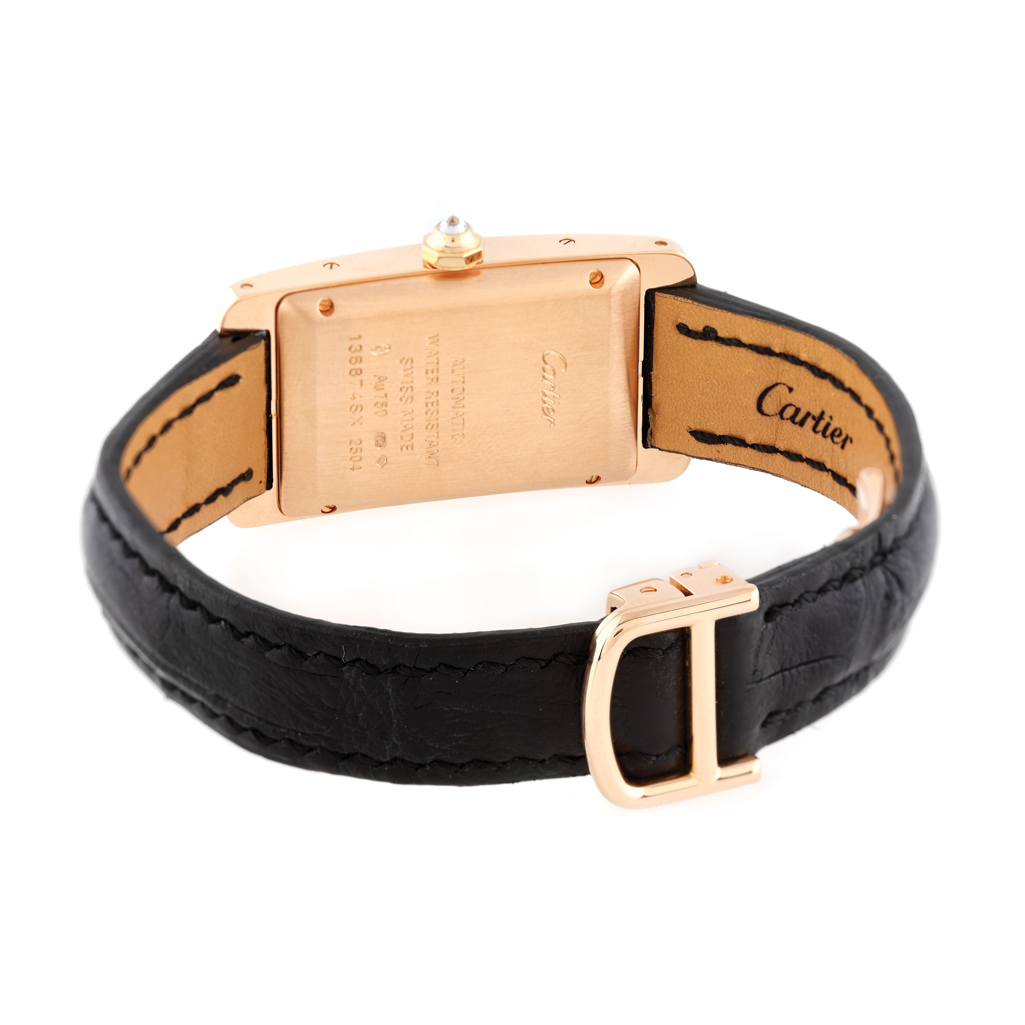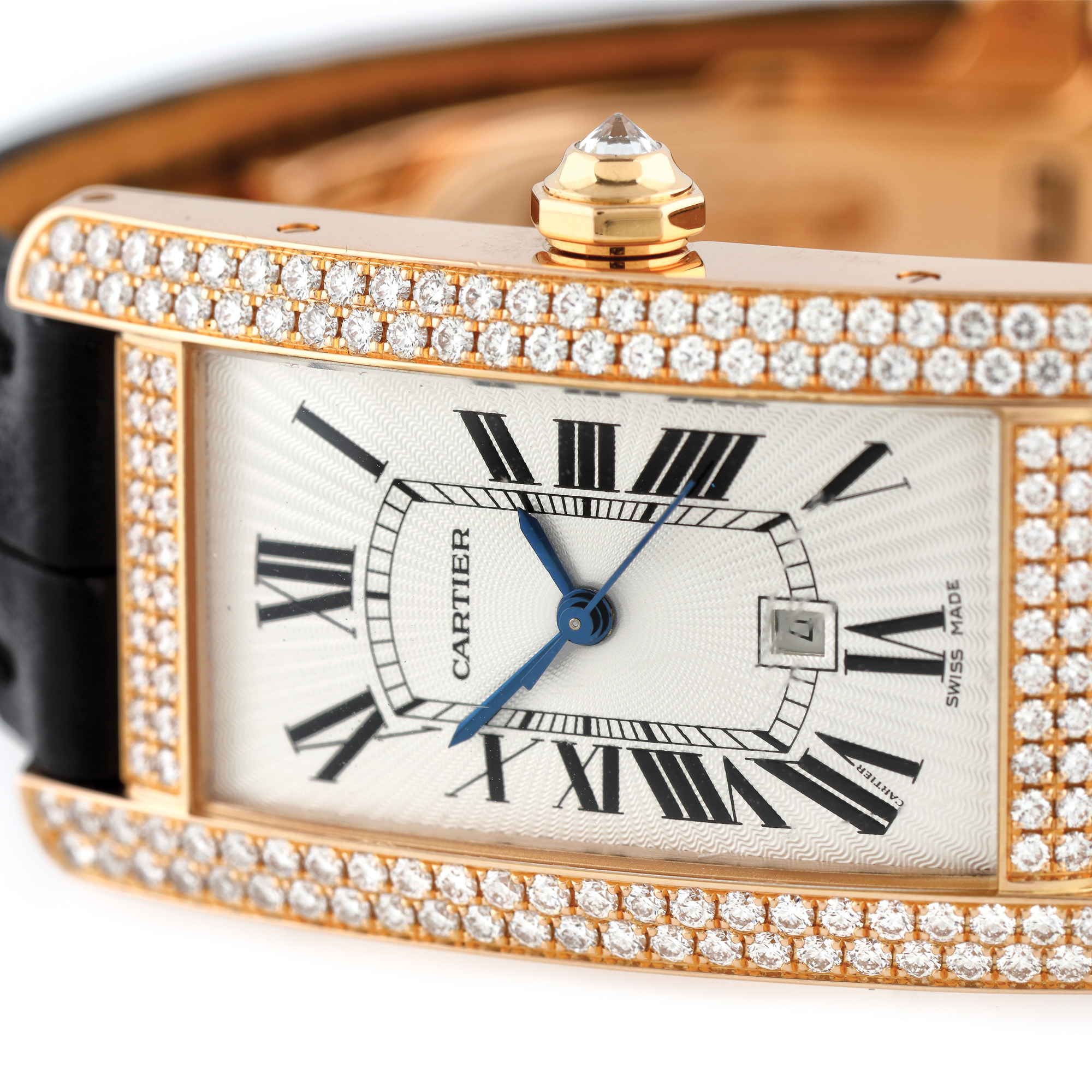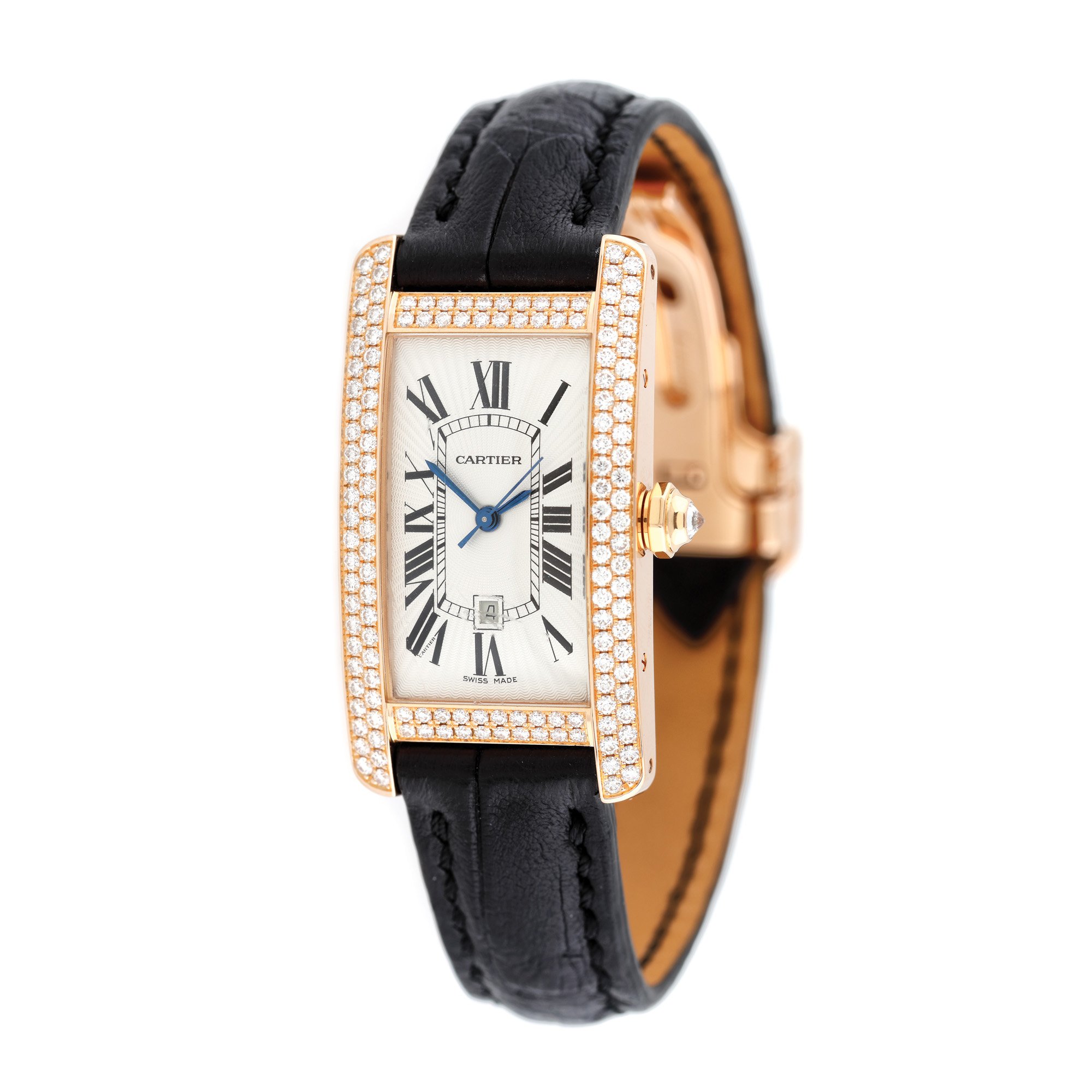 Ceas Cartier Tank Américaine din aur roz, de mână, de damă, referință WB704751, mecanism automatic. Carcasă elongată din aur roz, pavată cu diamante, coroană pe care este montat un diamant, cadran argintiu flinqué cu numerale romane și dată în dreptul orei 6. Curea neagră din piele de aligator, având cataramă tip deployant din aur roz. Ceasul vine însoțit de actele de proveniență și de cutia originală.