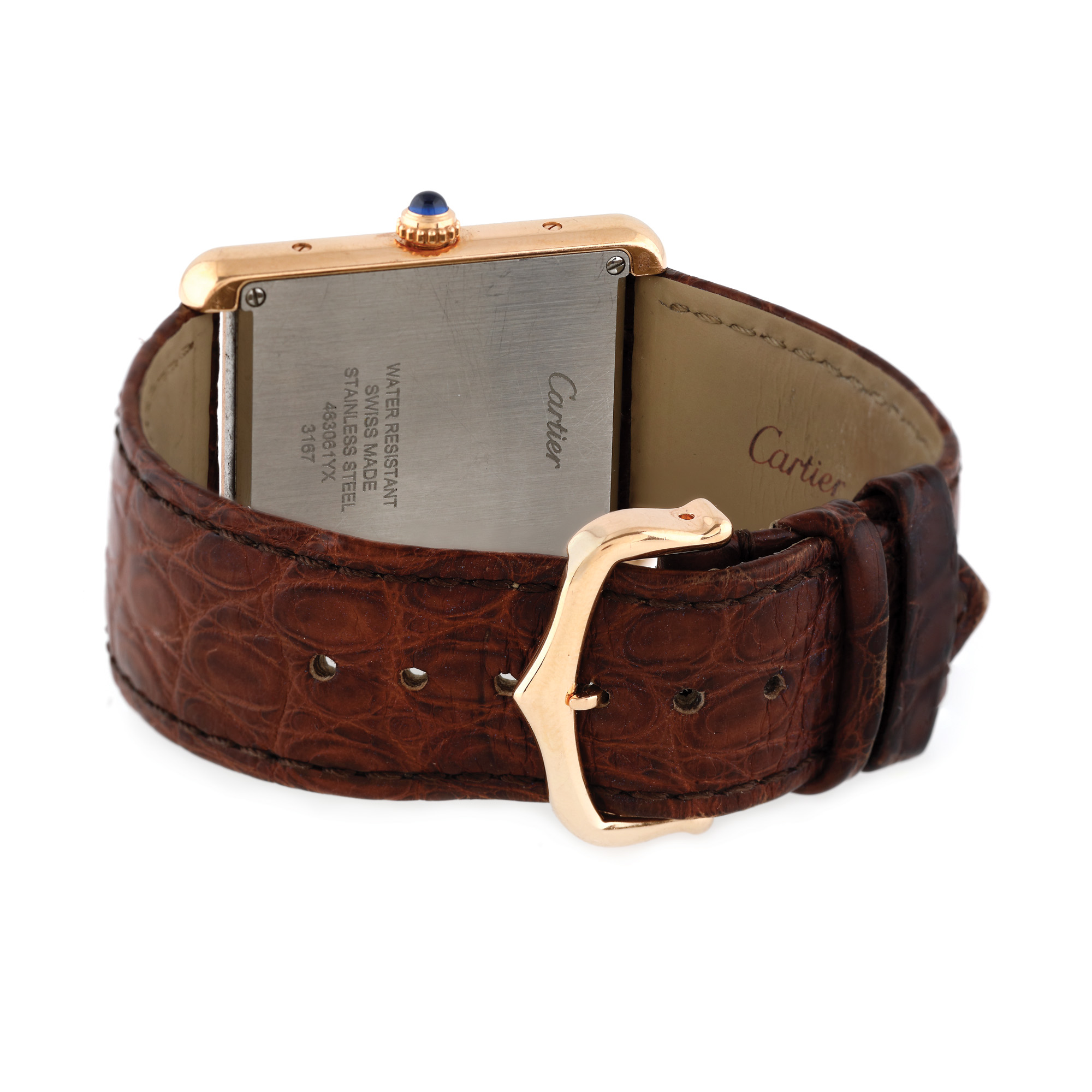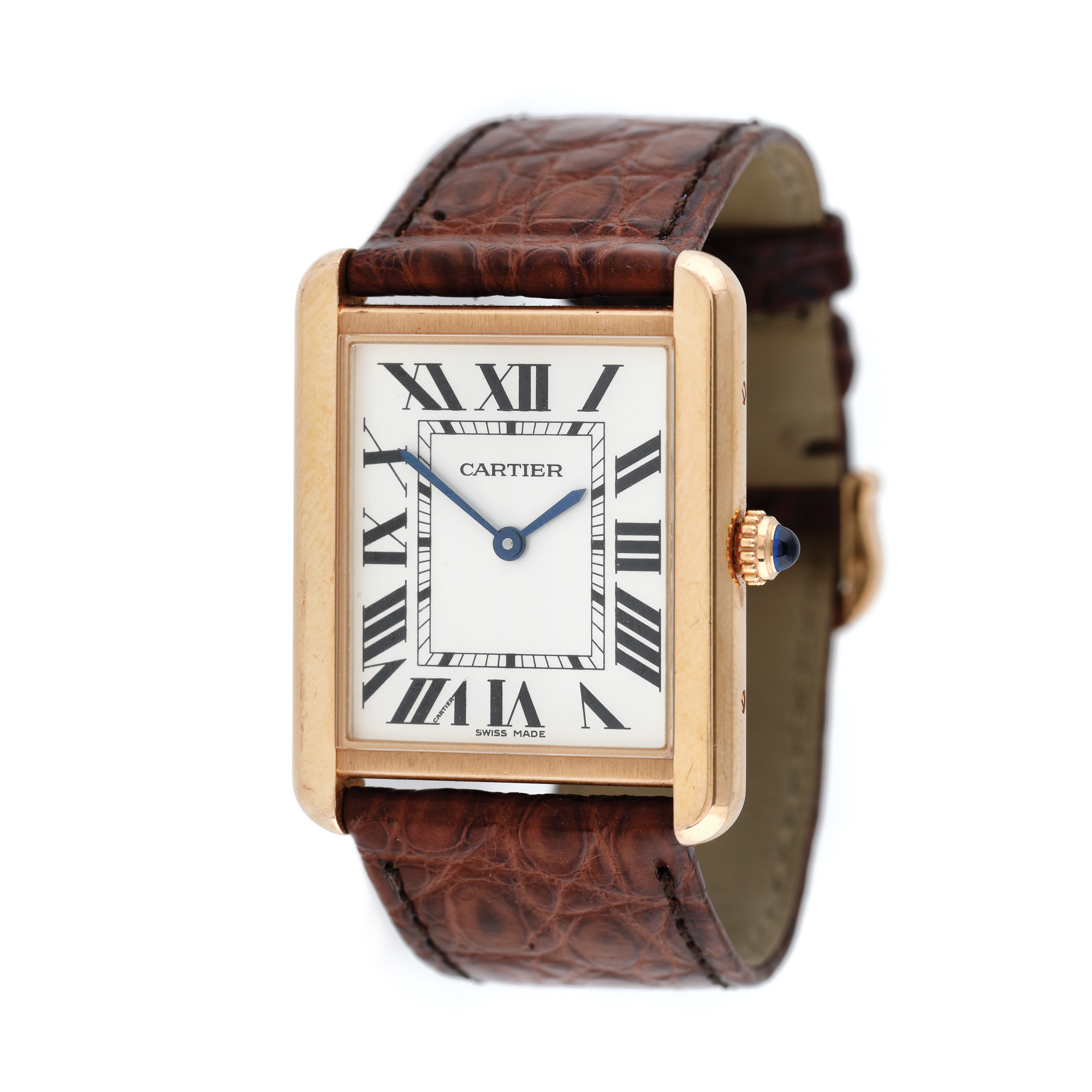 Ceas Cartier Tank Solo, din aur și oțel, de mână, de damă, referință W5200002, mecanism quartz. Cadran de culoare crem și numerale romane. Curea din piele de crocodil, de culoare maro și cataramă din aur roz, originale. Ceasul vine însoțit de actele de proveniență și de cutia originală.