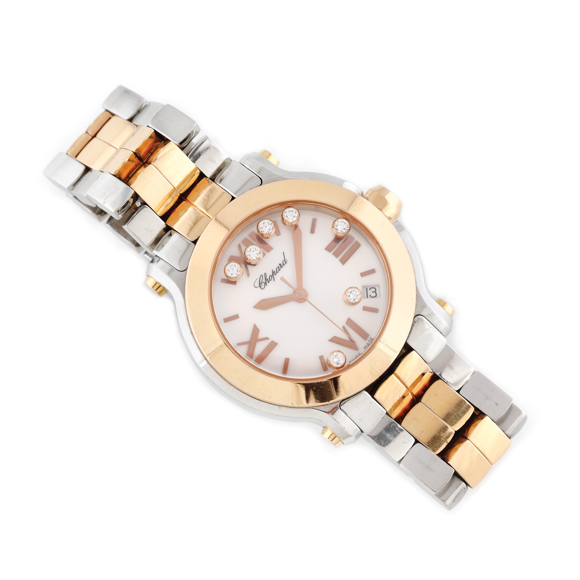 Ceas Chopard Happy Sport din aur și oțel, de mână, de damă, ornat cu șapte diamante mobile, referință 8475, mecanism automatic. Cadran de culoare crem, cu numerale romane și dată între orele 4-5. Brățară din oțel și aur roz și sistem de închidere tip deployant, originale. Ceasul vine însoțit de actele de proveniență.