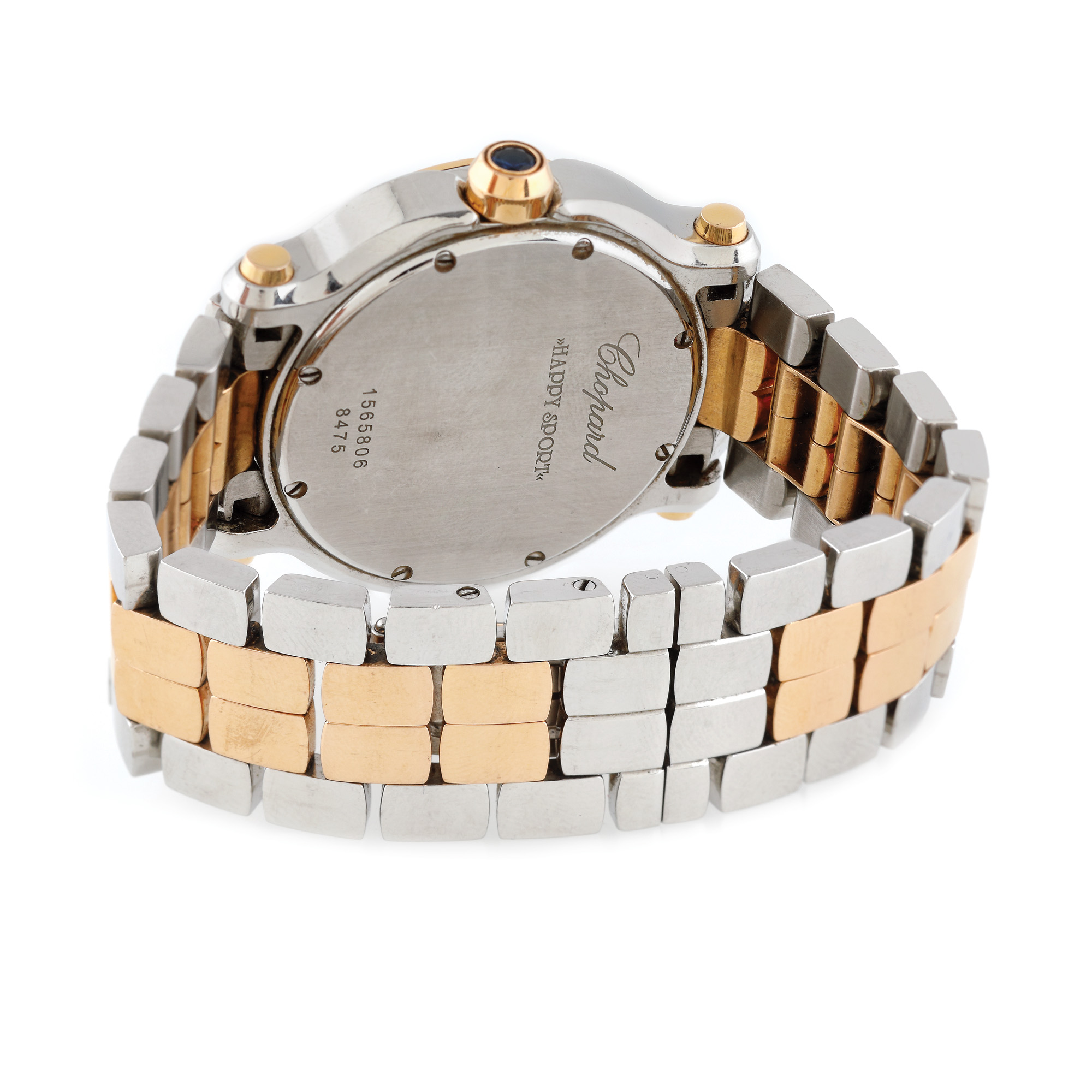 107. Ceas Chopard Happy Sport din aur și oțel, de mână, de damă, ornat cu diamante mobile, vine însoțit de actele de proveniență