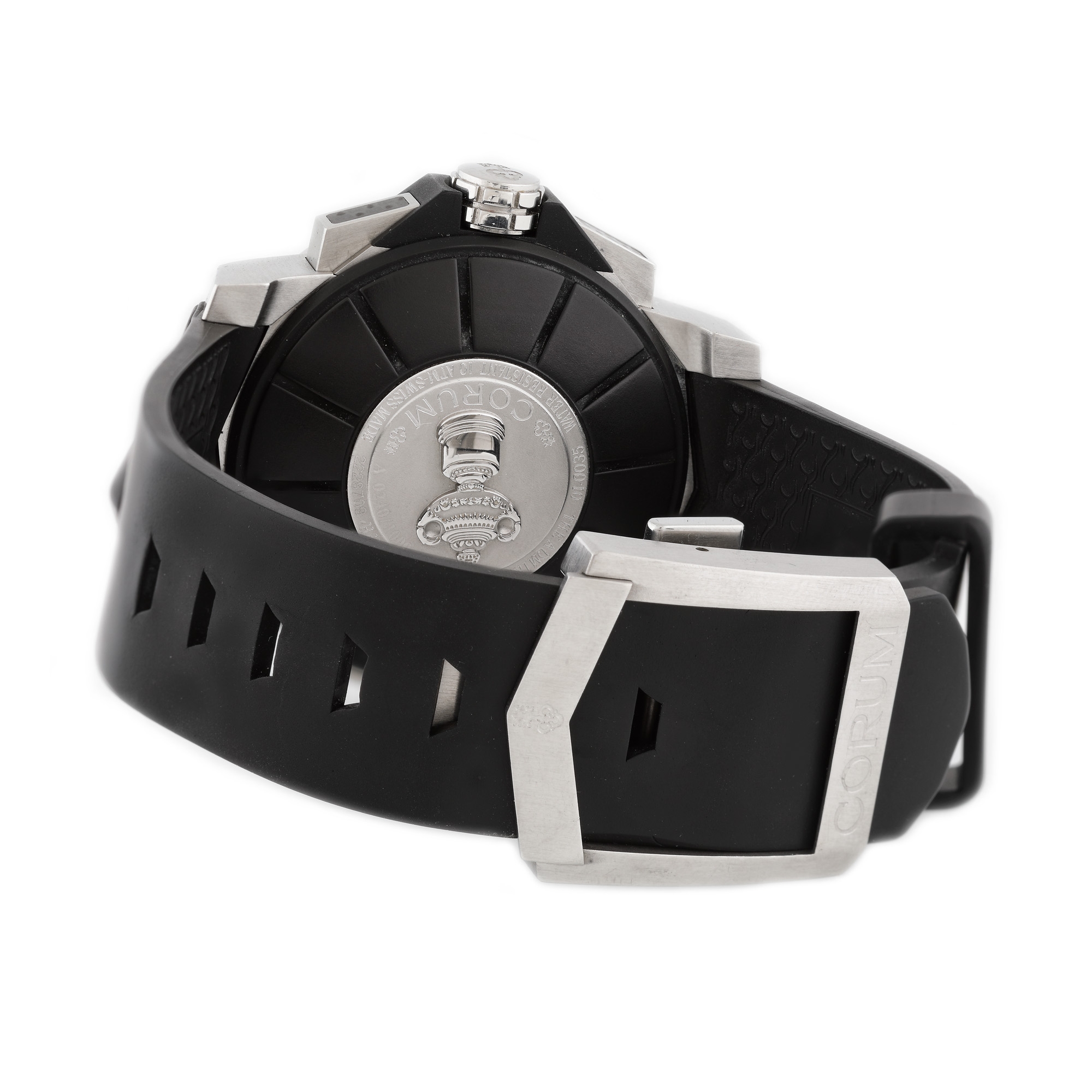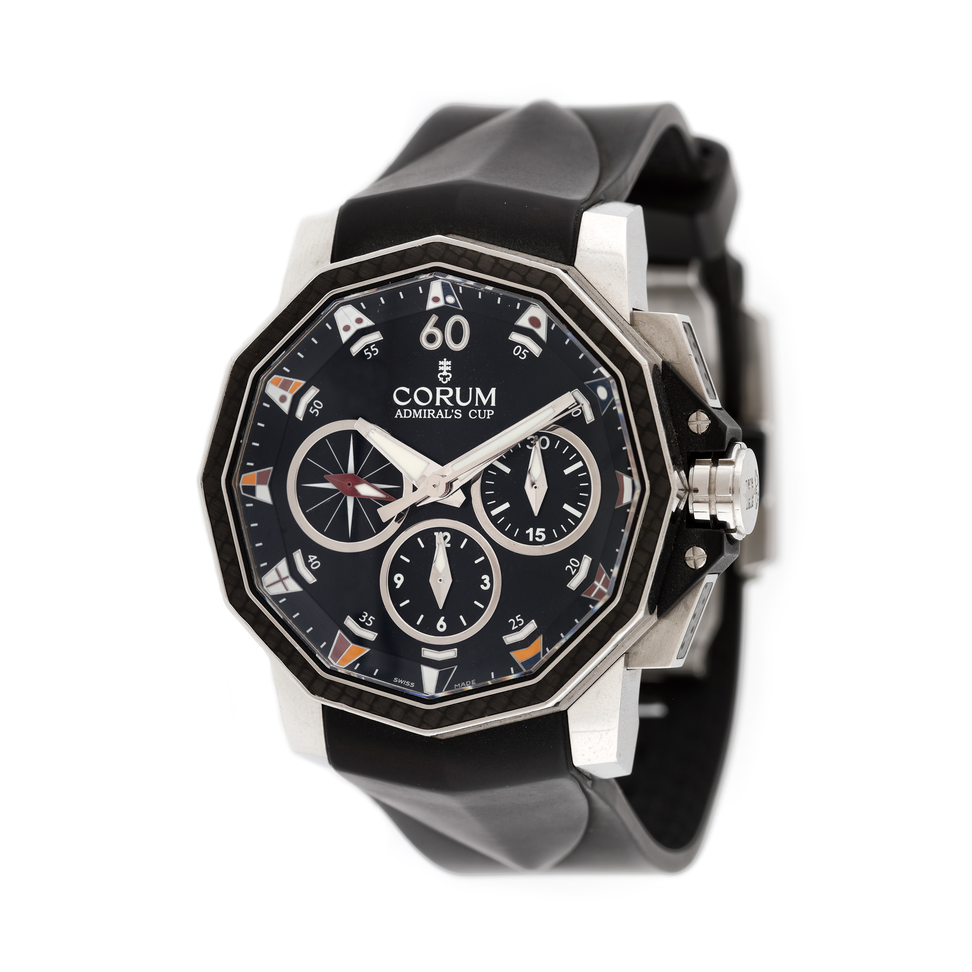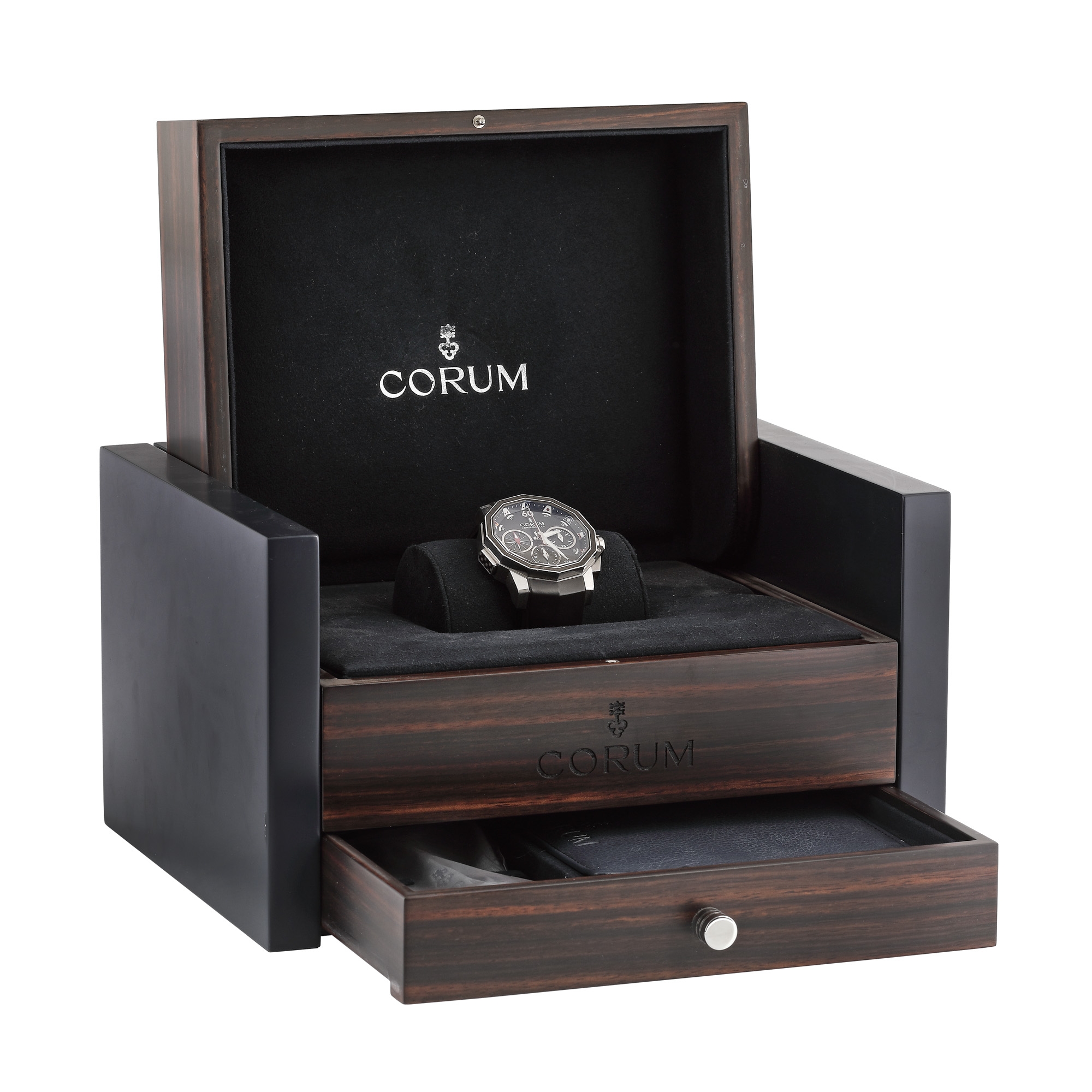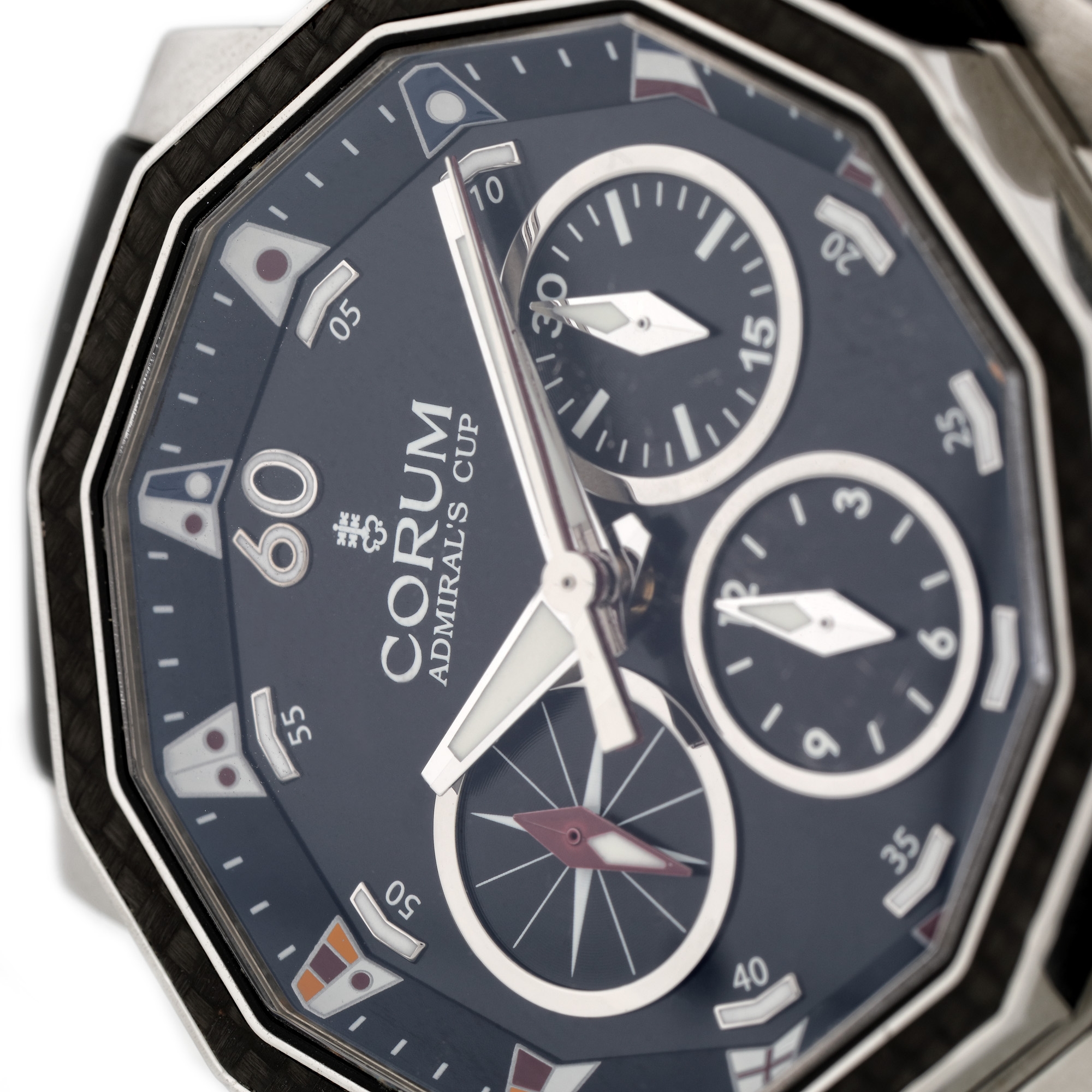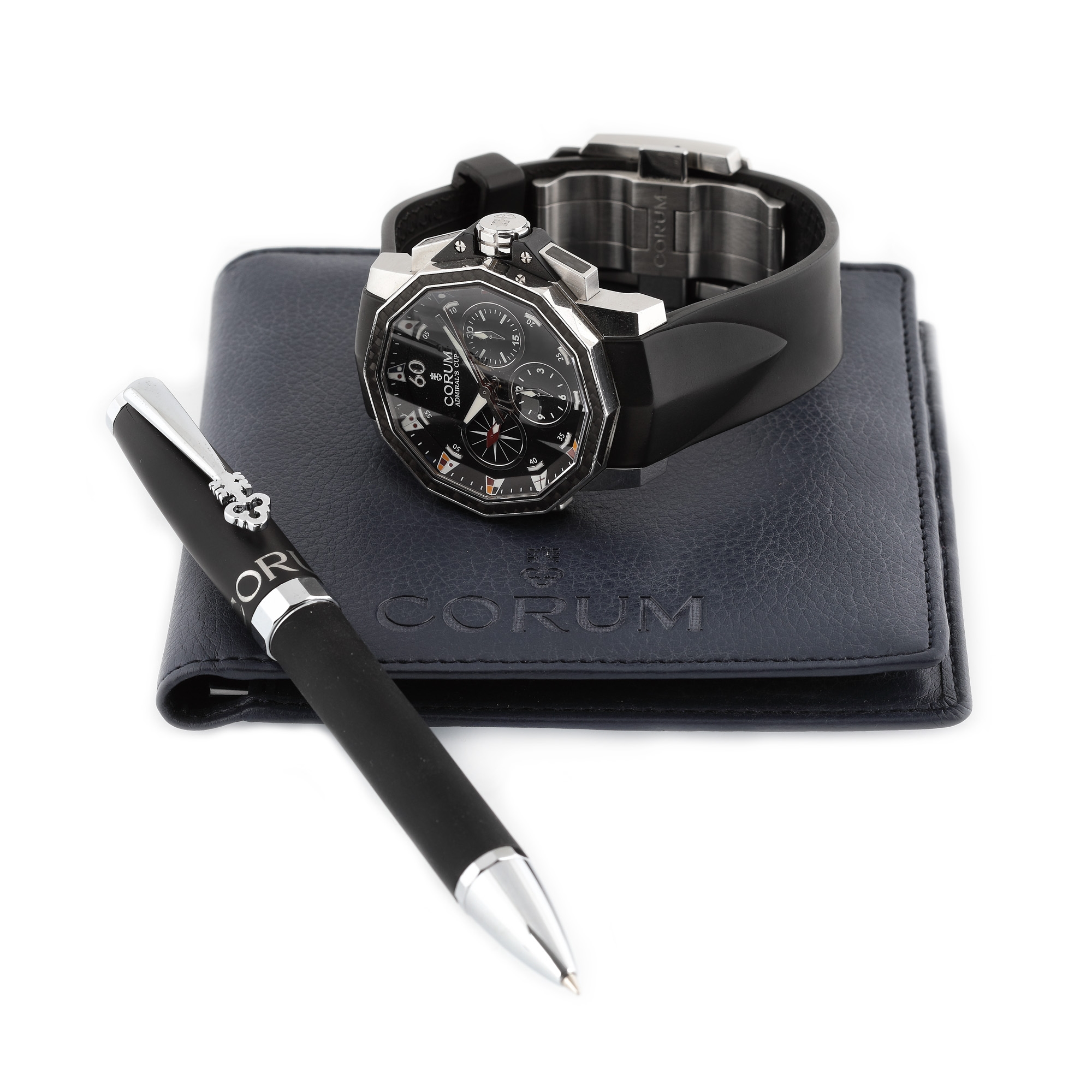Ceas Corum Admiral's Cup Challenge 44 Split Seconds, de mână, bărbătesc, referință 01.0035. Cadran de culoare neagră, bezel și butoane cu inserții de carbon, mecanism chronograph și split seconds, automatic, curea neagră de cauciuc și închizătoare tip deployant, în cutie originală.
