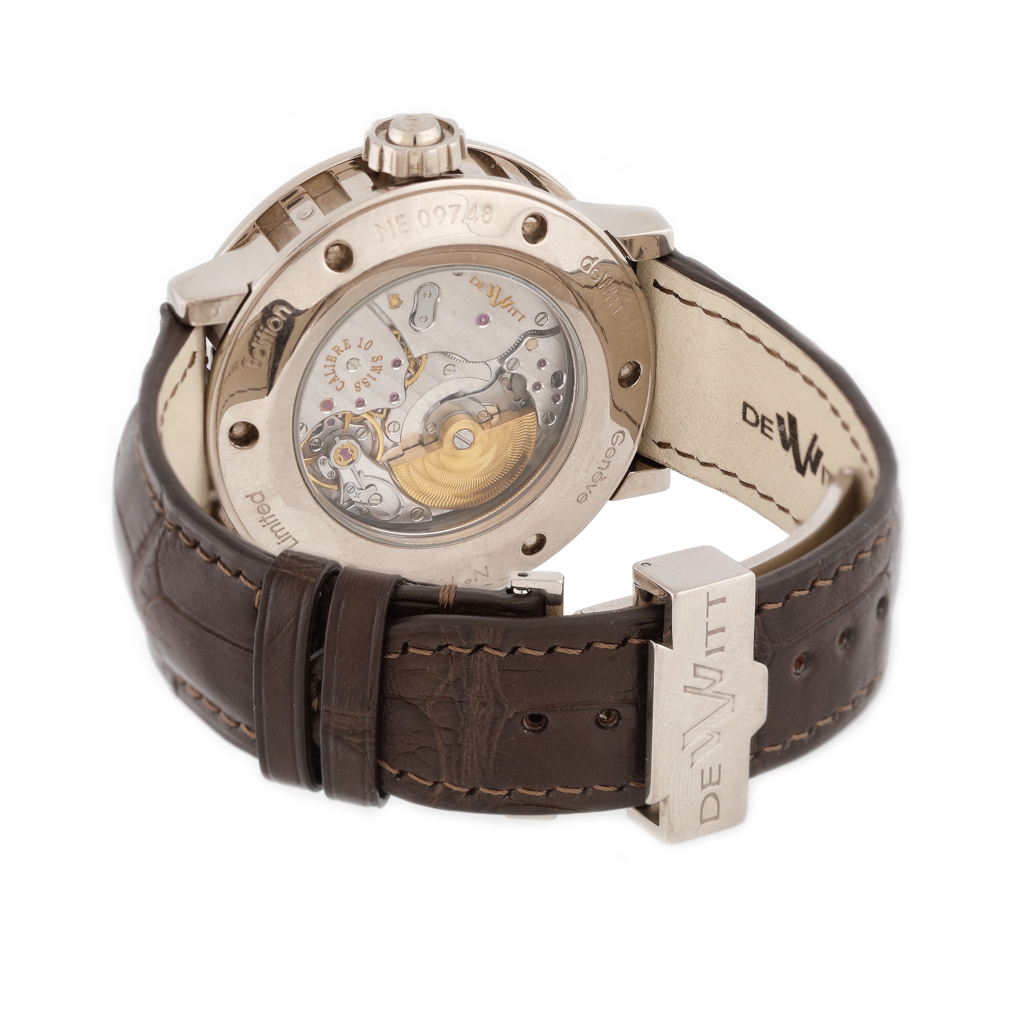 Ceas Dewitt Academia, din aur alb, de mână, bărbătesc, ediție limitată 19/50, referință NE097.48, mecanism autoamtic, anterior vitrat. Cadran de culoare arămie, parțial decorat în tehnica guilloché, cu numerale arabe și patru registre. Curea din piele de aligator, de culoare neagră și sistem de închidere tip deployant, originale. Înființat în 2003 de către contele Jérôme de Witt, descendent direct al regilor și împăraților europeni, printre care și împăratul Napoleon I, DeWitt are rădăcini într-o moștenire istorică autentică. Compania își demonstrează pasiunea pentru Fine Watchmaking într-un spirit inovator, în continuă evoluție. La doi ani de la înființare, DeWitt a înregistrat primul său brevet pentru Tourbillon Différentiel, care a câștigat premiul pentru inovație la Grand Prix d’Horlogerie de Genève. Brandul și-a extins colecția de Tourbillons cu invenții celebre precum Academia Tourbillon Force Constante și Academia Tourbillon Force Constante à Chaîne. Modelul unic al carcasei este inspirat de coloanele imperiale. Ceasurile produse de acest brand sunt foarte exclusiviste, produse într-un număr extrem de redus combinând materiale high-tech cu manufactura de orologerie tradițională, fiind totodată una dintre cele patru case de orologerie din Elveția care produc singuri atât mecanismele cât și cadranele ceasurilor.