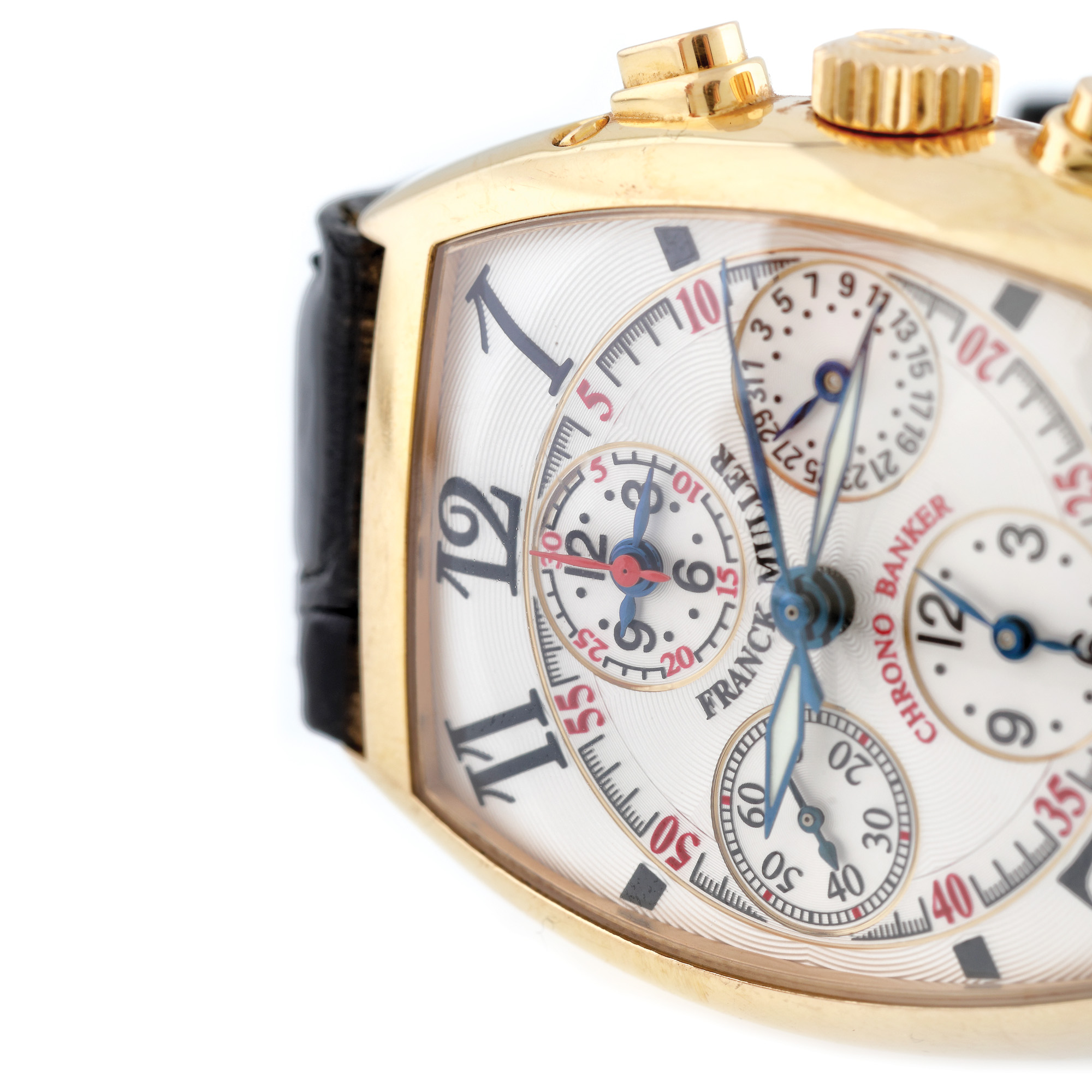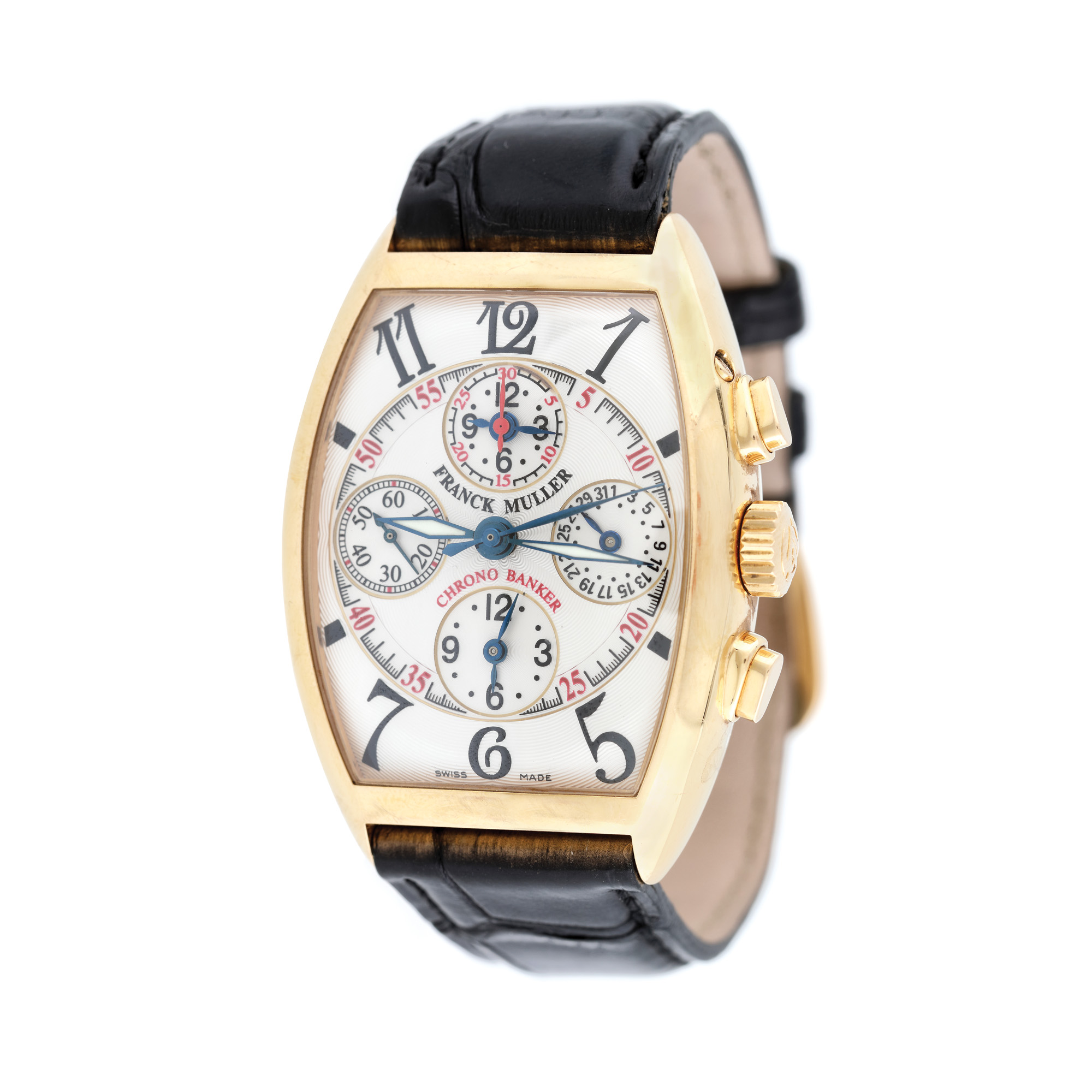 Ceas Franck Muller Chrono Master Banker, din aur roz, de mână, bărbătesc, referință 7850 CC MB, mecanism automatic. Cadran de culoare alb, decorat în tehnica guilloché, cu numerale arabe și patru registre. Curea din piele de aligator, de culoare neagră și cataramă din aur, originale.