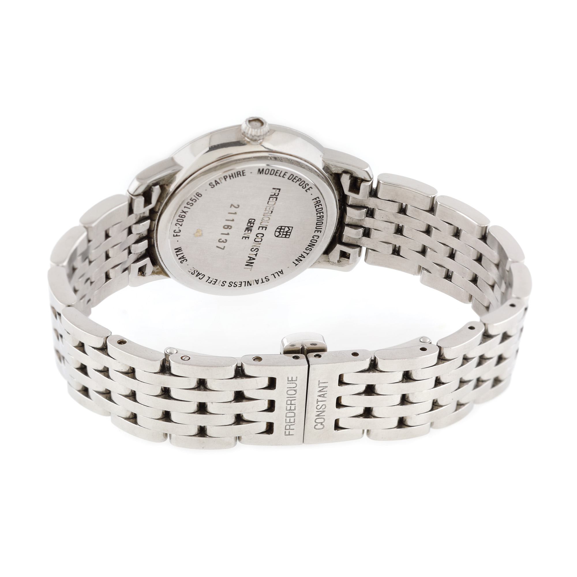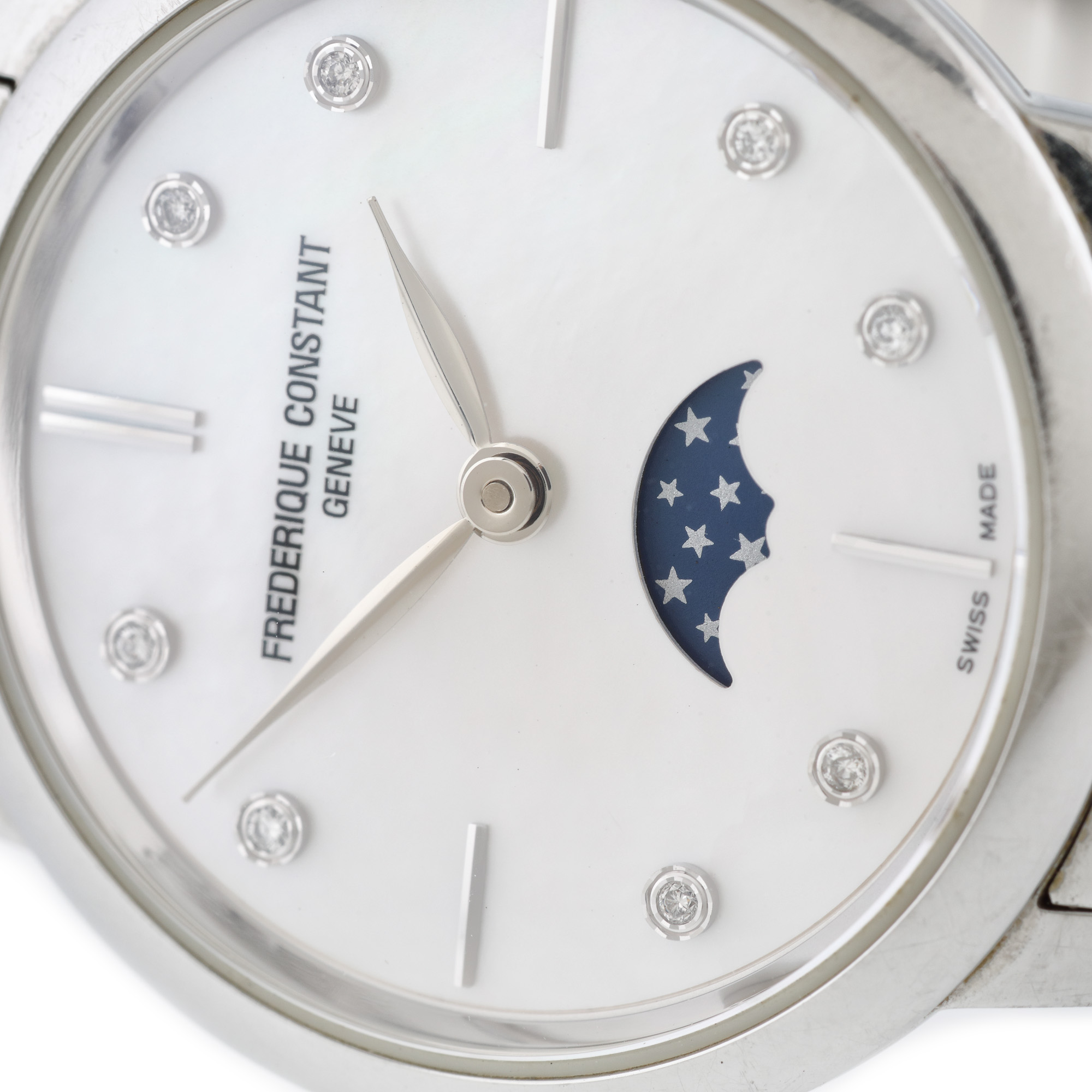 Ceas Frederique Constant Moonphase, de mână, de damă, referință FC-206MPWD1S5/6, mecanism quartz. Cadran din sidef, decorat cu diamante, orar și minutar argintii, registru pentru fazele lunii în dreptul orei 6. Ceasul vine însoțit de actele de proveniență și de cutia originală.