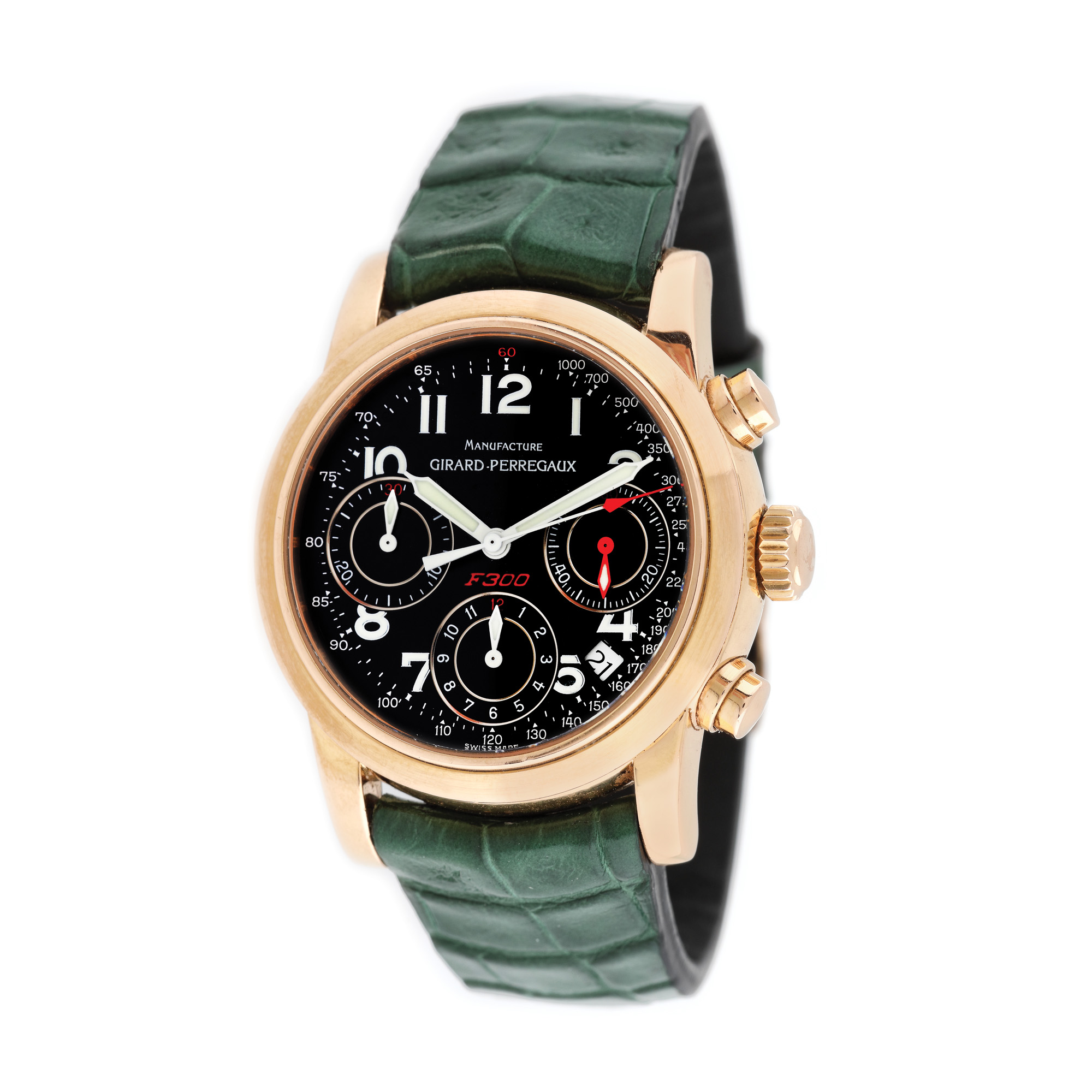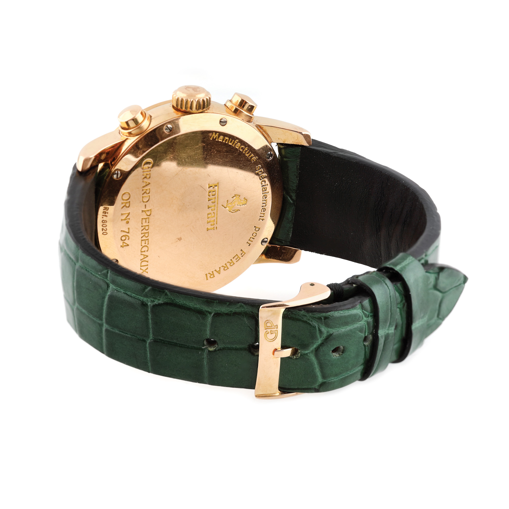 Ceas Girard Perregaux Ferarri, din aur, de mână, bărbătesc, referință 8020, mecanism automatic. Cadran de culoare negru, cu numerale arabe, trei registre și dată între orele 4-5. Curea din piele de crocodil, de culoare verde, adăugată aftermarket și cataramă din aur, originală.