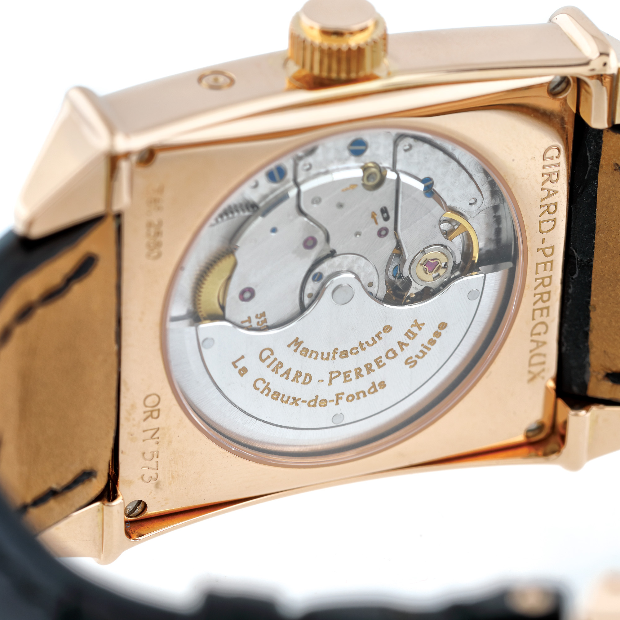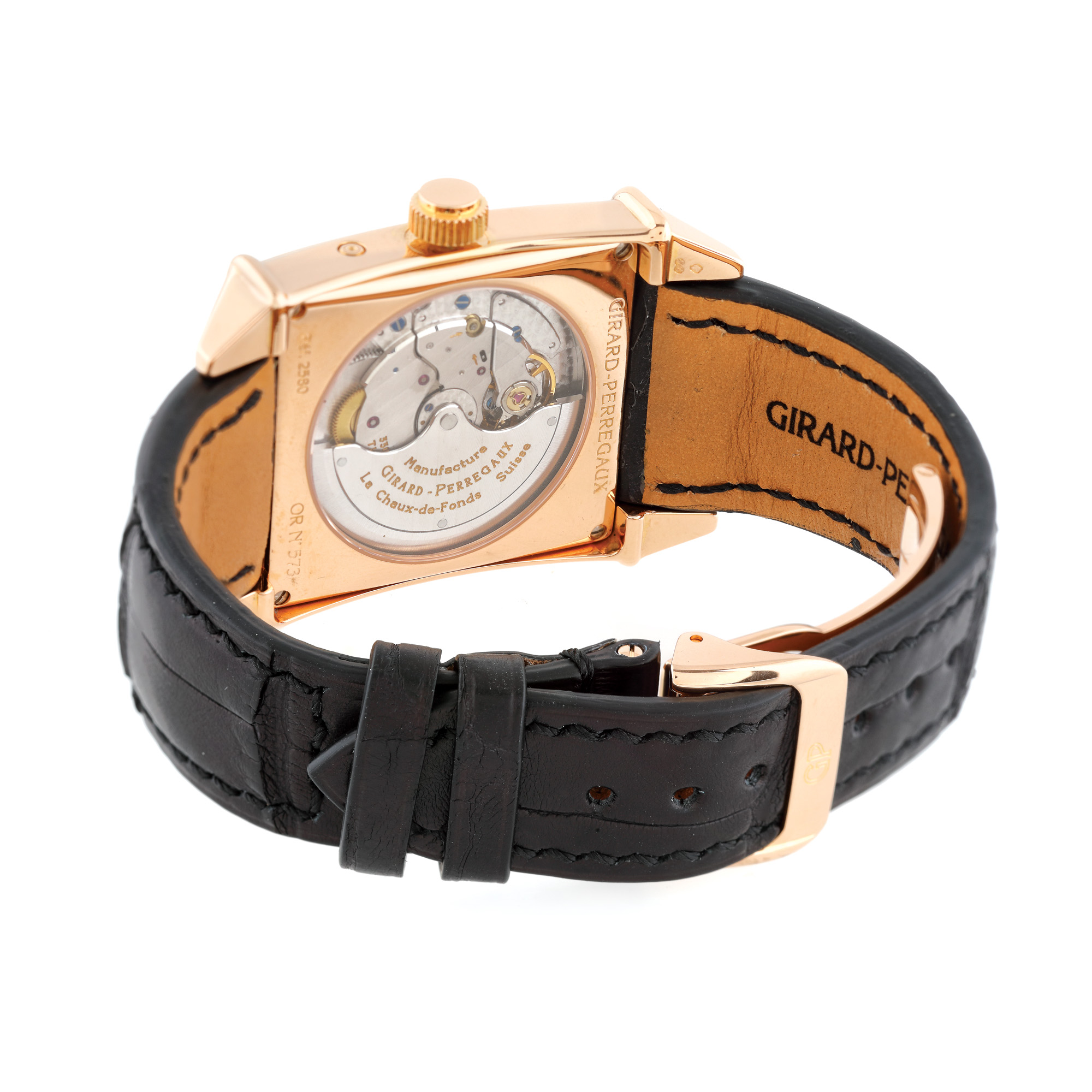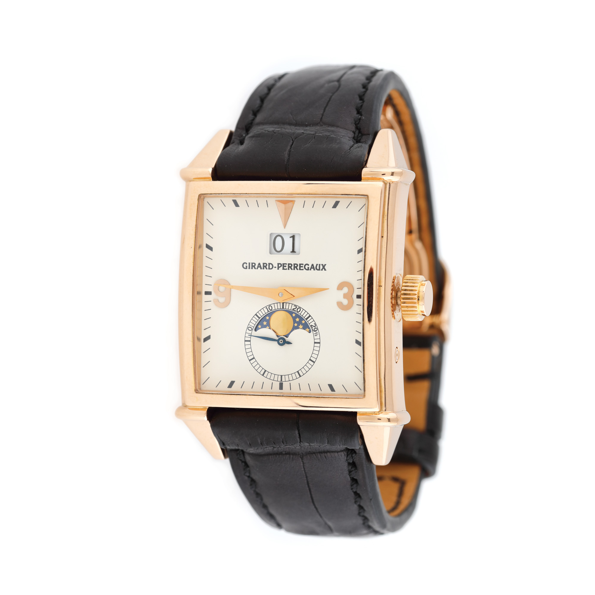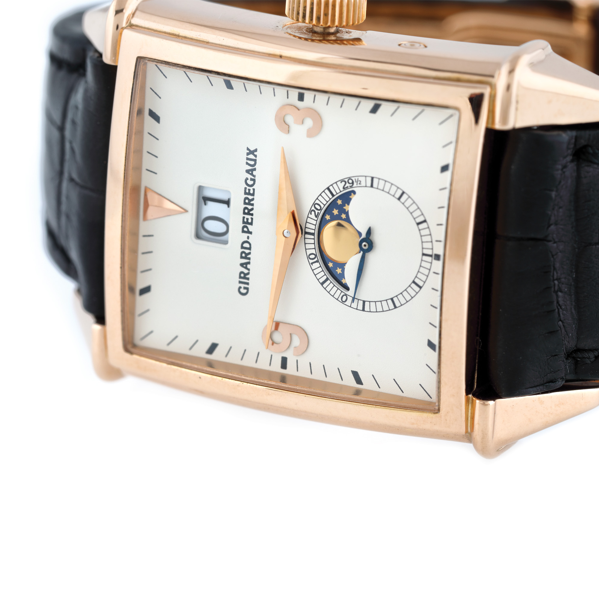 Ceas Girard Perregaux Vintage 1945 Moonphase, din aur roz, de mână, bărbătesc, referință 2580, mecanism automatic, vitrat anterior. Cadran cu dată în dreptul orei 12 și registru cu fazele lunii în dreptul orei 6. Curea neagră, din piele, cu cataramă originală deployant, din aur roz. Ceasul vine însoțit de actele de proveniență și de cutia originală.