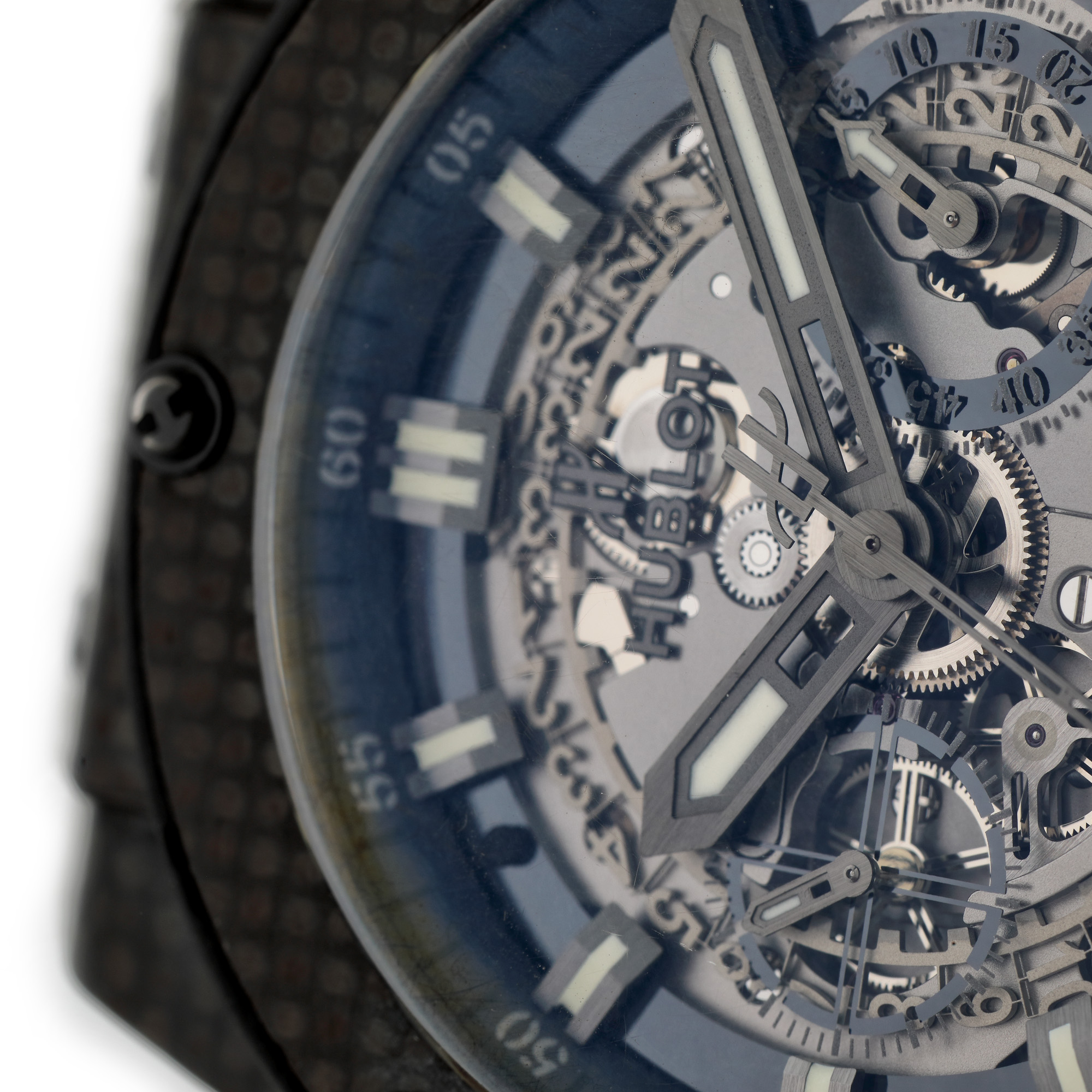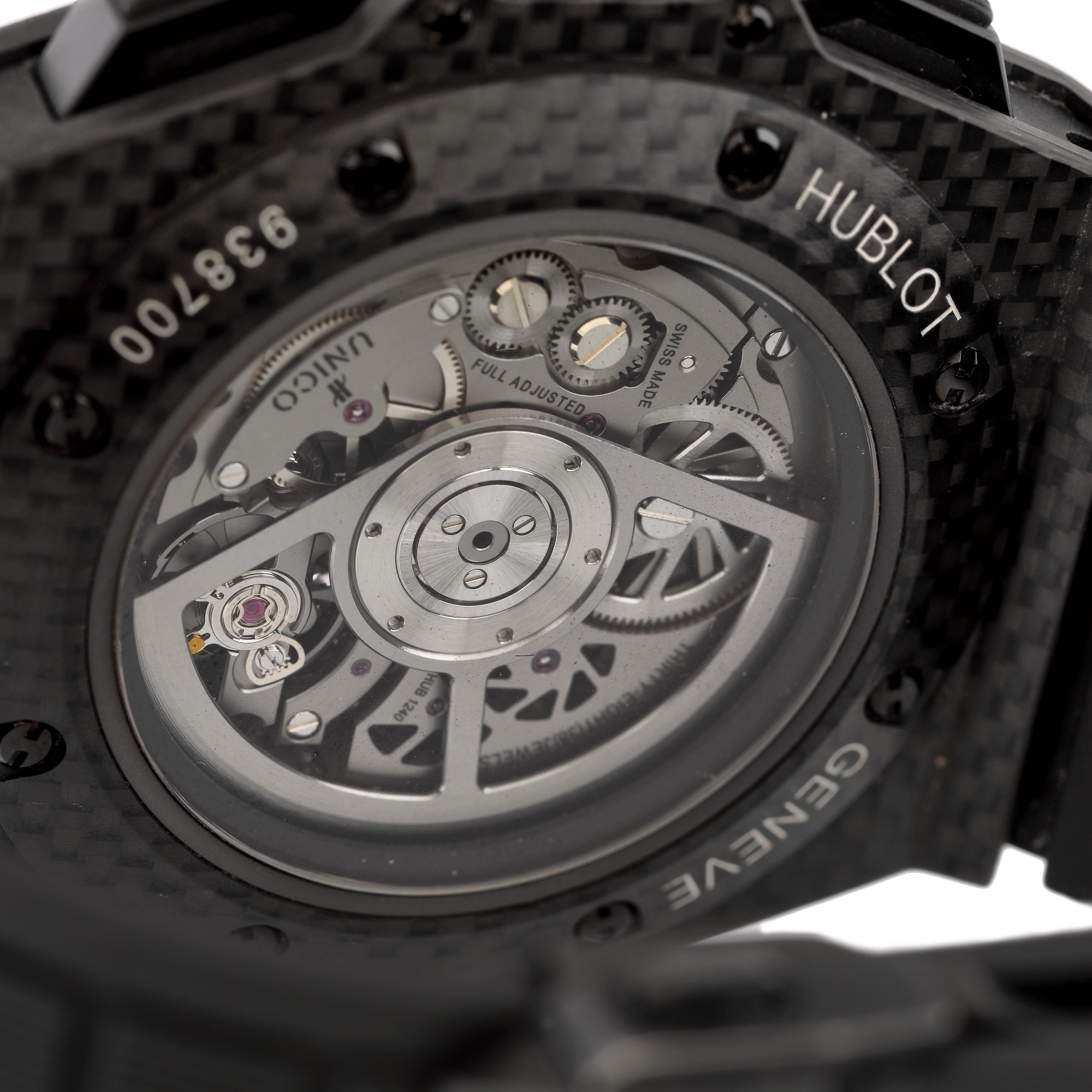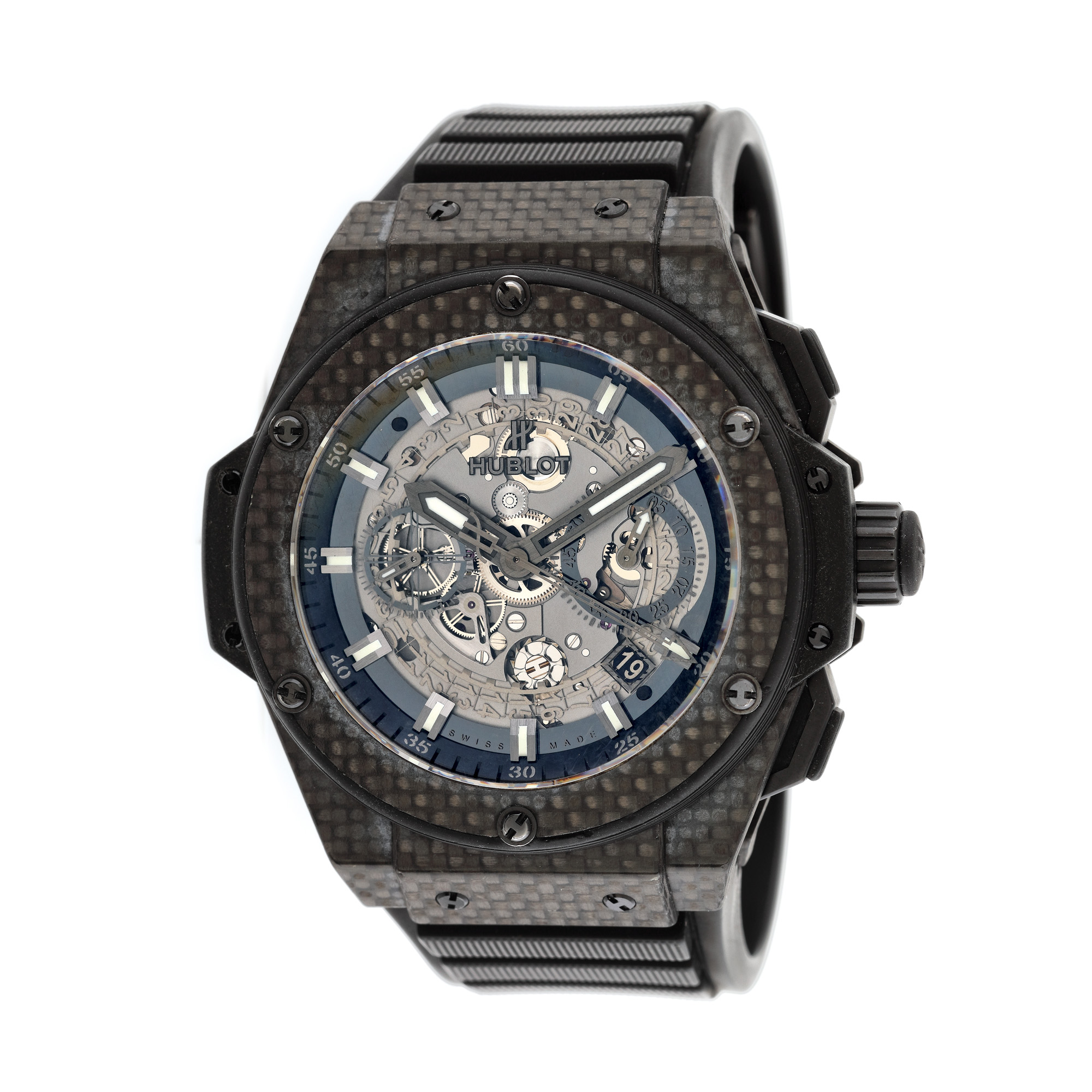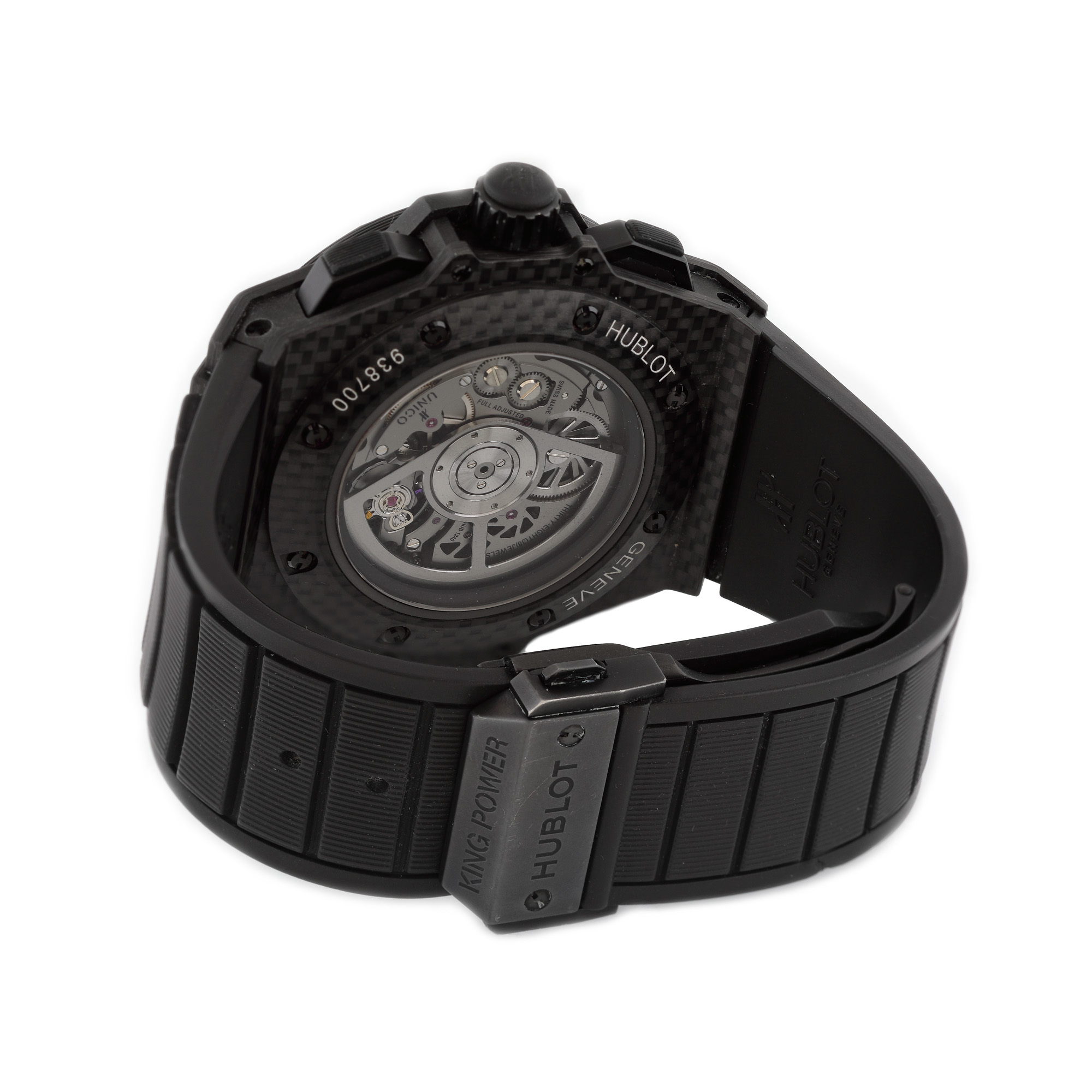 Ceas Hublot Big Bang King Power, de mână, bărbătesc, referință 701.qx.0140.rx, mecanism automatic, anterior vitrat. Cadran skeleton, de culoare gri, numerale arabe, două registre și dată între orele 4-5. Curea din cauciuc, de culoare neagră și sistem de închidere tip deployant, originale.
