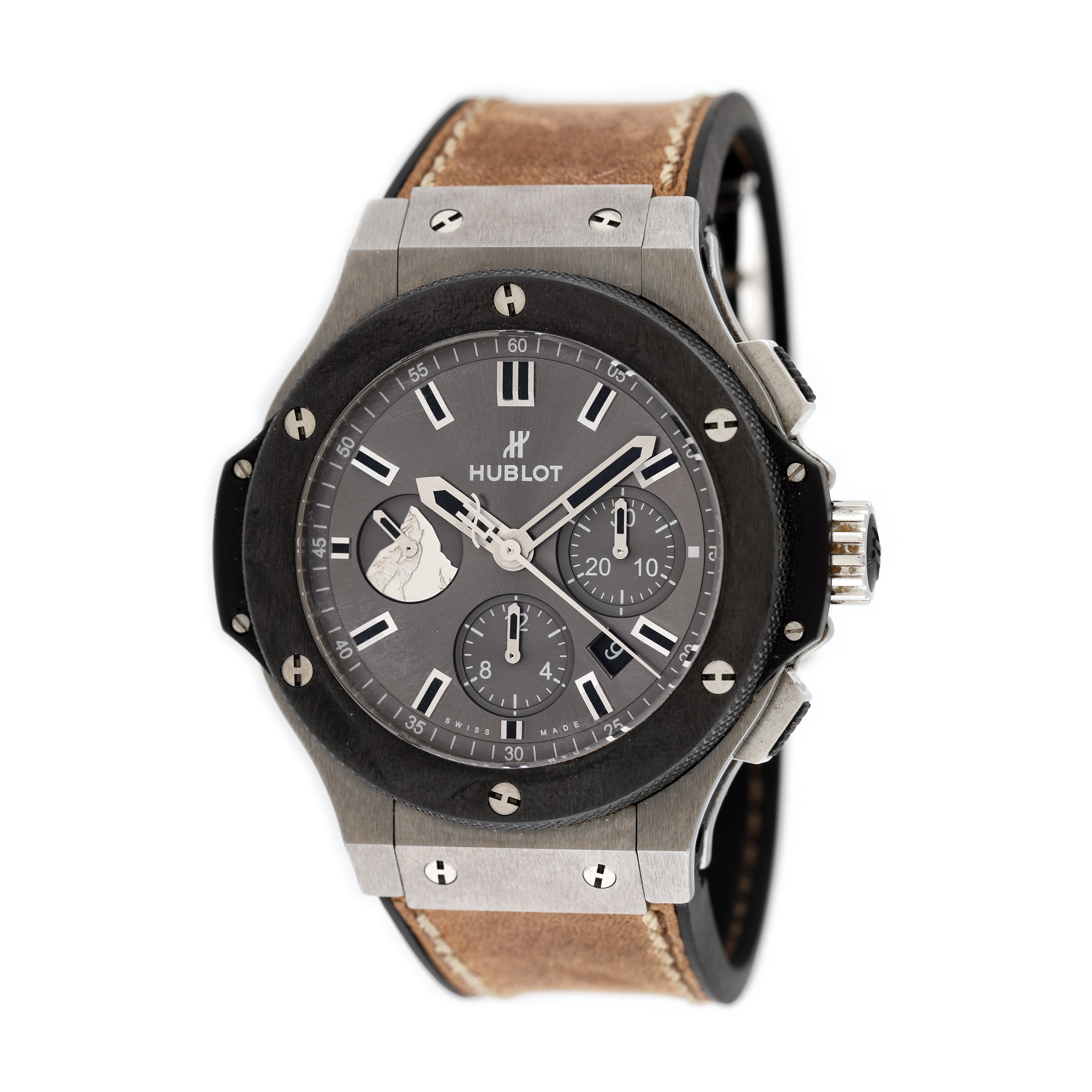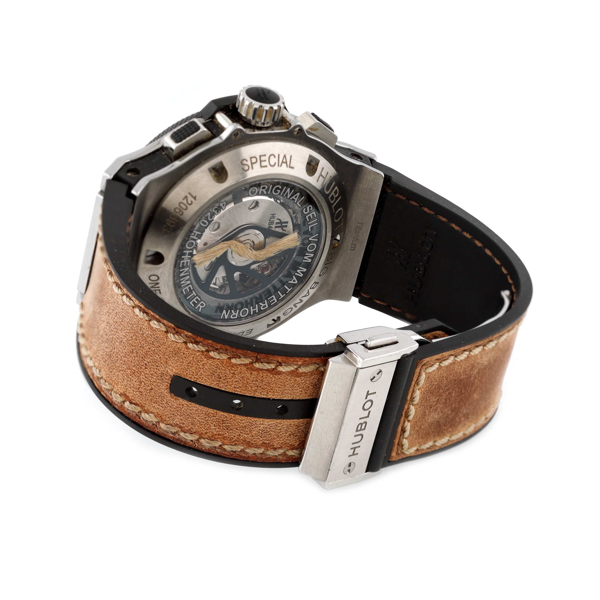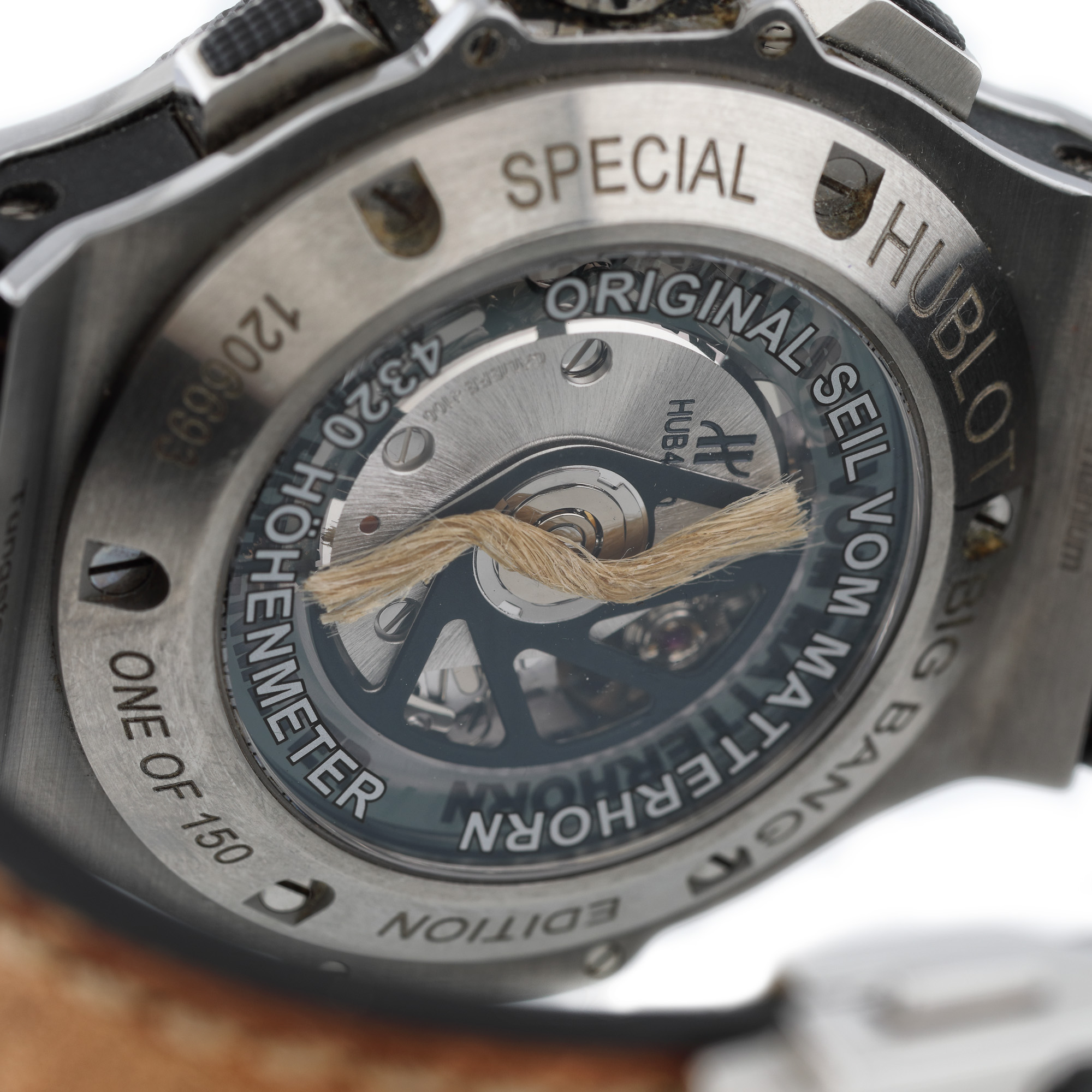 Ceas Hublot Big Bang Zermatt, de mână, bărbătesc, referință 301.KM.-7070.VR.ZTT15, mecanism automatic chronograph. Bezel ceramic, cadran cu trei registre, dintre care cel aflat în dreptul orei 9 este gravat cu silueta emblematică a muntelui Matterhorn și dată între orele 4 și 5. Exemplar dintr-o ediție specială de 150 piese.