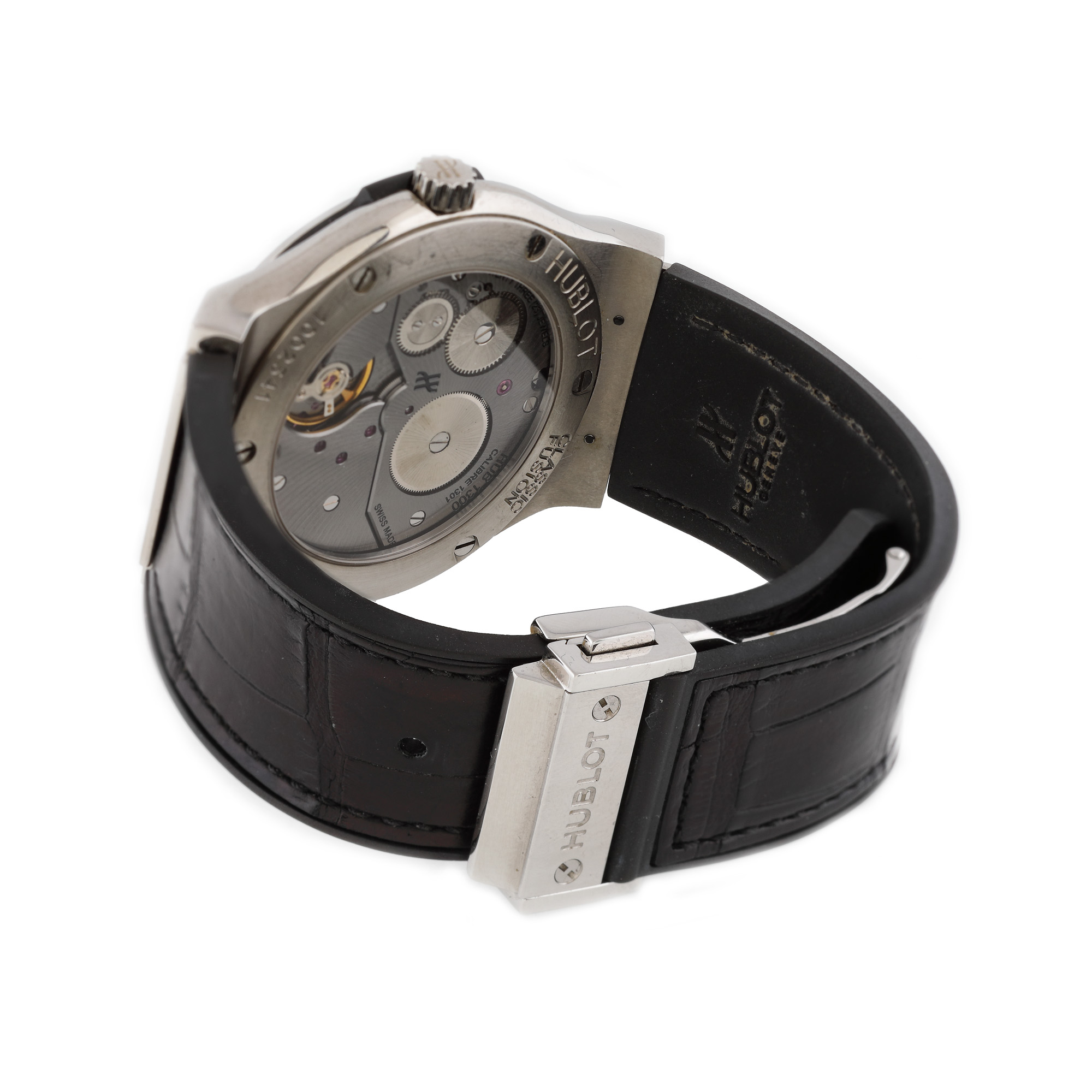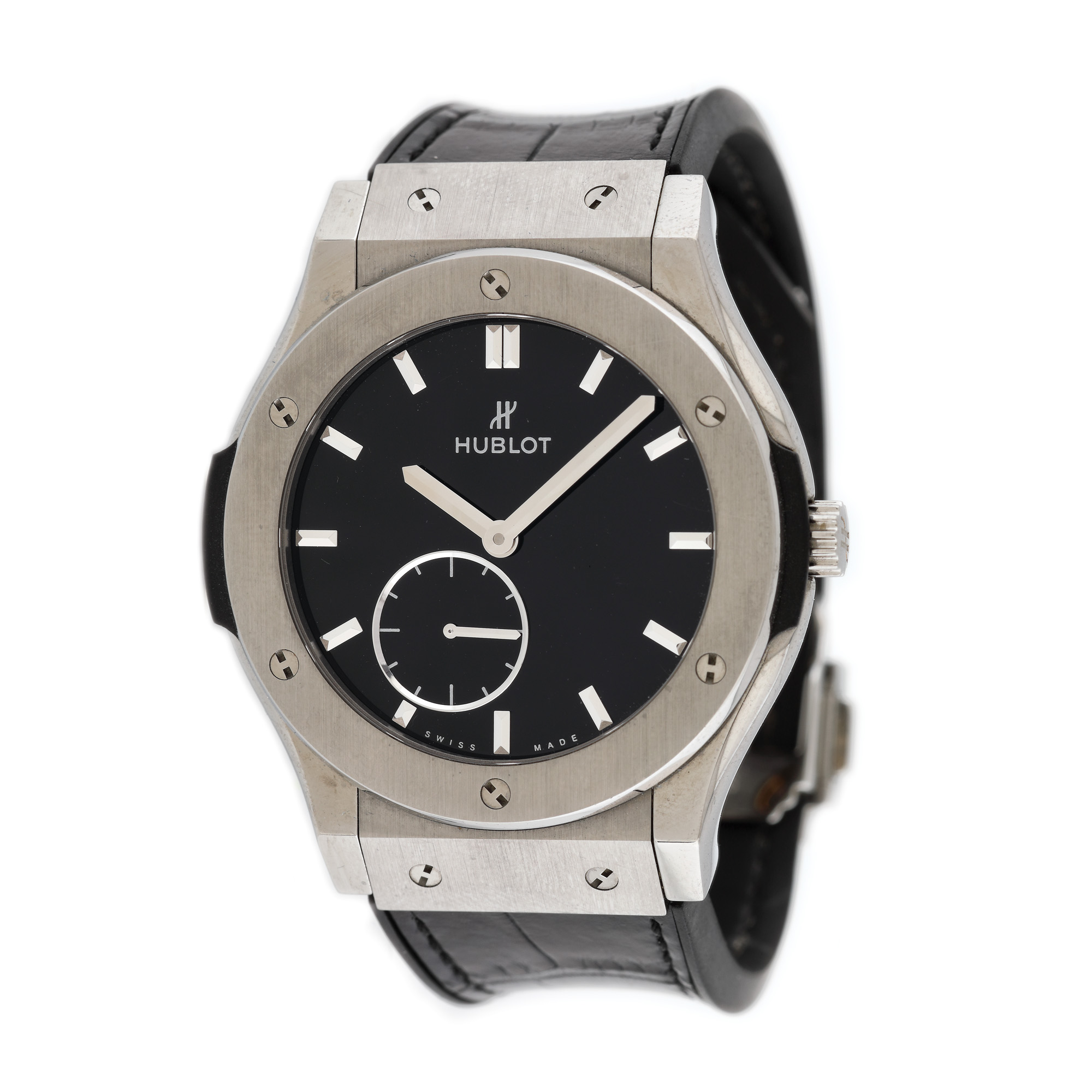 Ceas Hublot Classic Fusion, din titan, de mână, bărbătesc, referinţă 515.NX.1270.LR, mecanism manual, anterior vitrat. Cadran de culoare negru, cu un registru. Curea din piele de aligator și închizătoare tip deployant, originale.