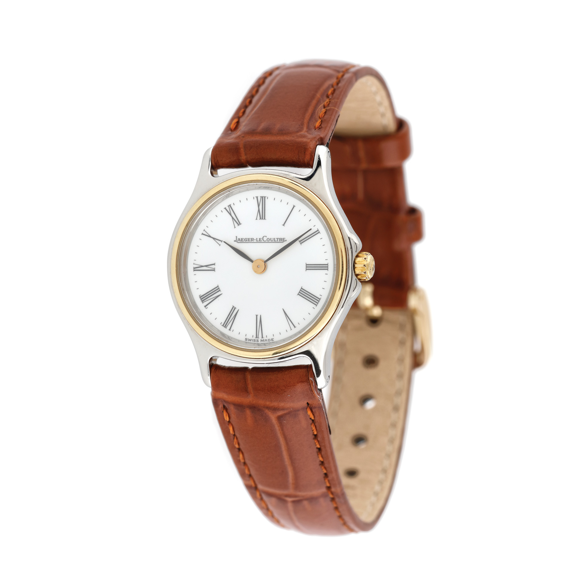 Ceas Jaeger-LeCoultre din aur și oțel, de mână, de damă, referința 132.5.09, mecanism quartz. Cadran de culoare alb, cu numerale romane. Curea din piele, de culoare maro și cataramă, adăugate aftermarket.