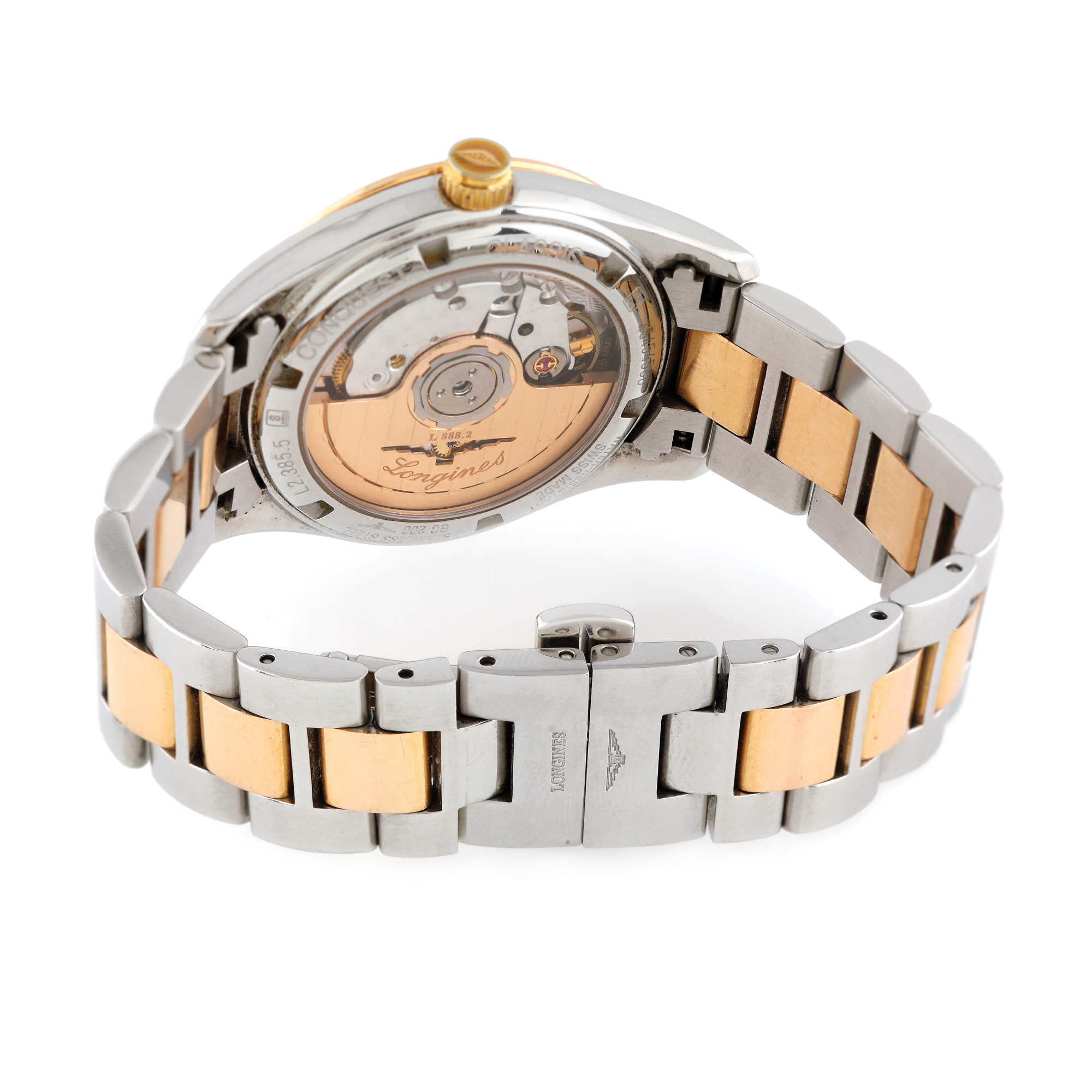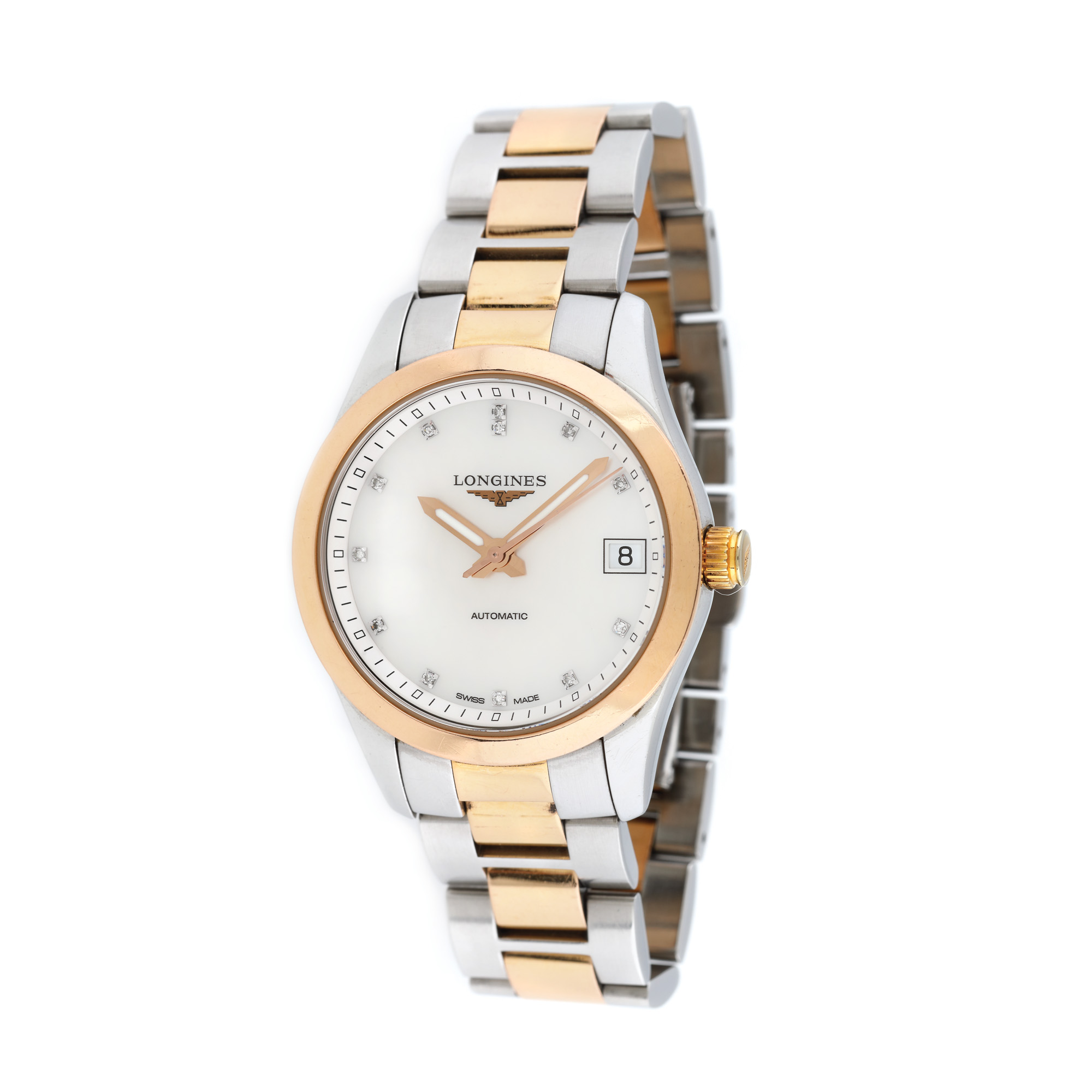 128. Ceas Longines Conquest Classic, din aur roz și oțel, ornat cu sidef și diamante, de mână, de damă, vine însoțit de actele de proveniență și zale de rezervă [2019]