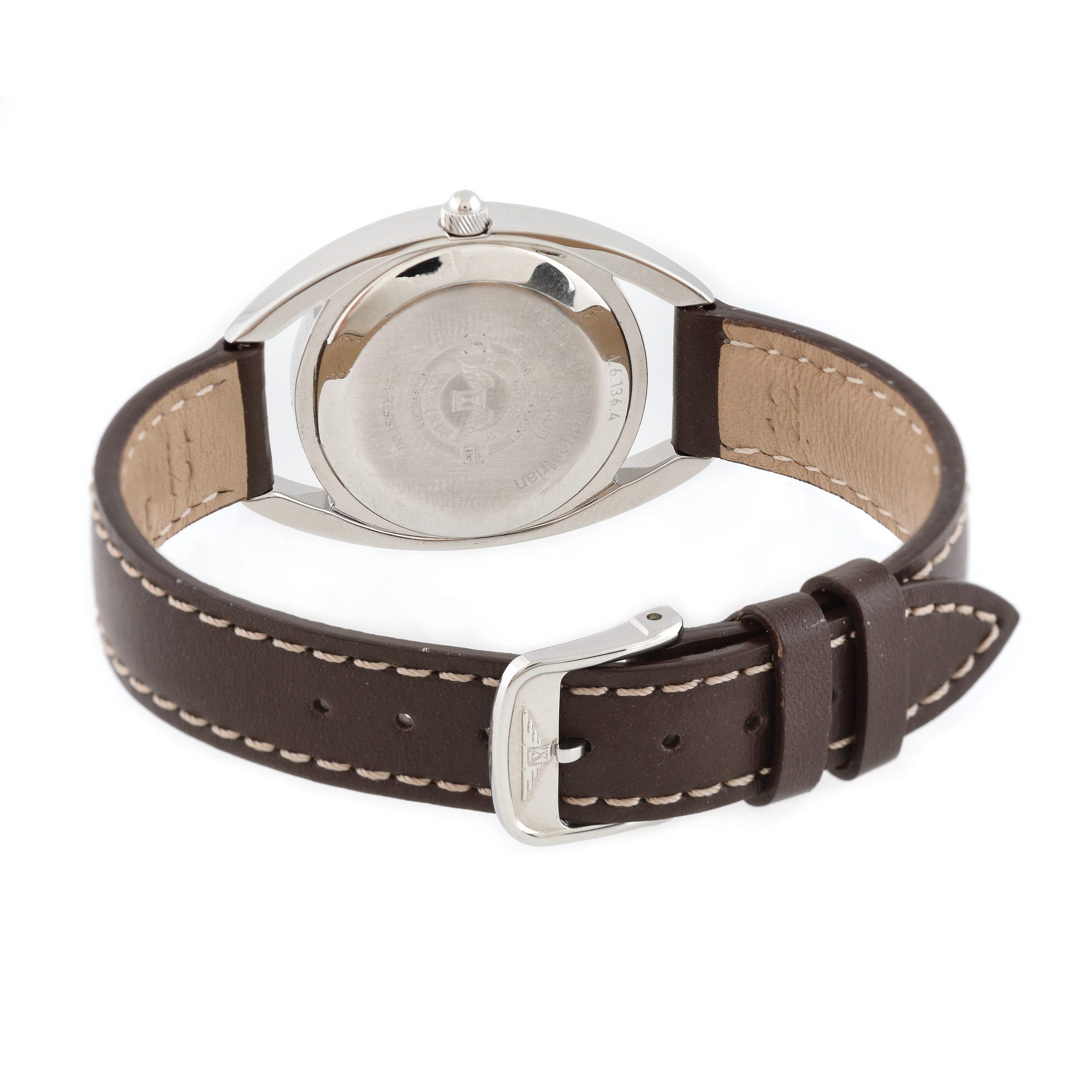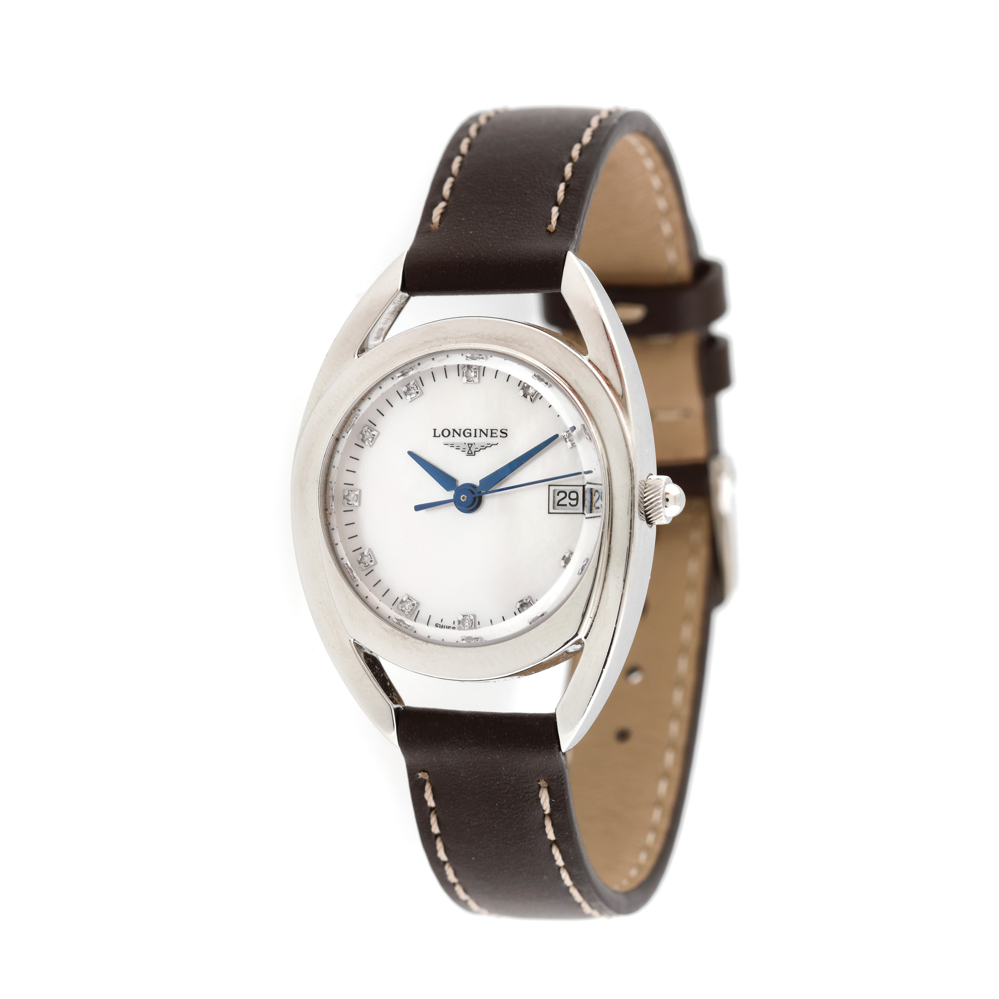 Ceas Longines Equestrian, de mână, de damă. Mecanism quartz, referință L6.136.4. Cadran din sidef, diamante în locul orelor și dată la ora 3. Curea din piele, de culoare brun și cataramă din oțel inoxidabil, originale.