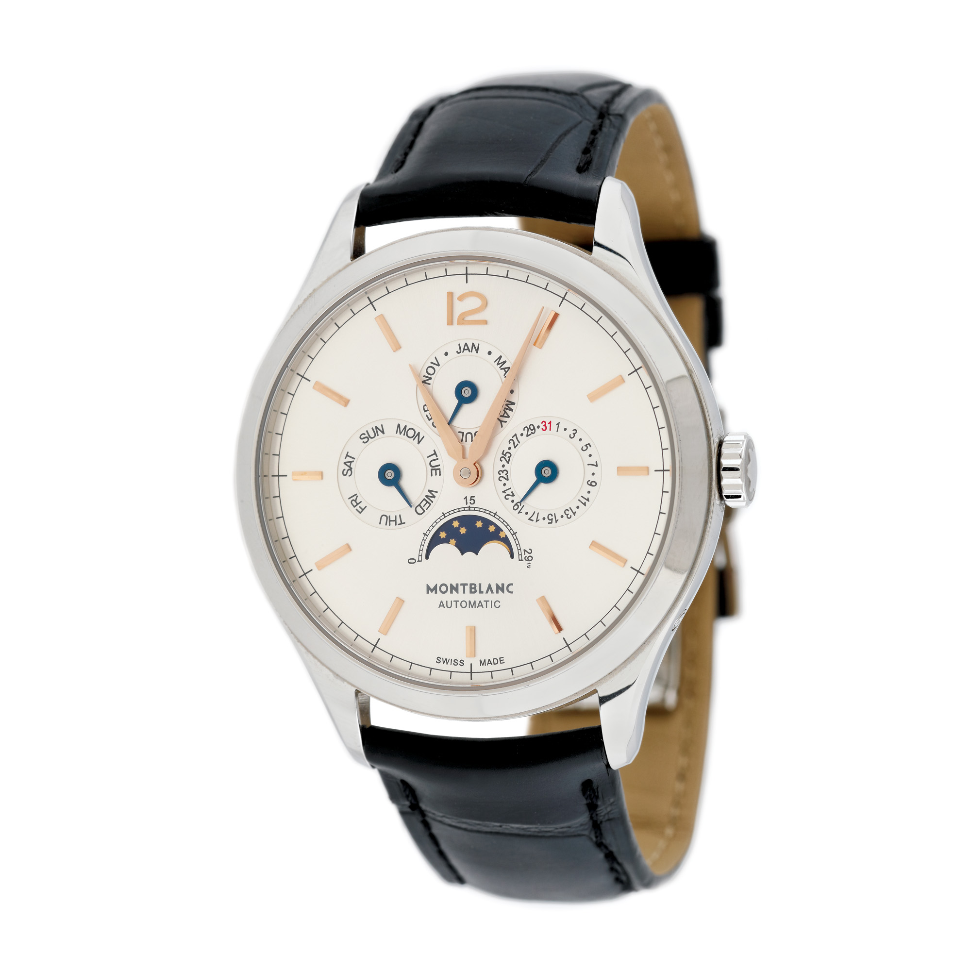 Ceas Montblanc Heritage Chronometrie Quantième Annuel, de mână, bărbătesc, referință 1125340, mecanism automatic, vitrat anterior. Cadranul argintiu cuprinde patru registre - dată, lună, zi a săptămânii, fazele lunii și indecși orari aurii. Curea neagră din piele de crocodil.