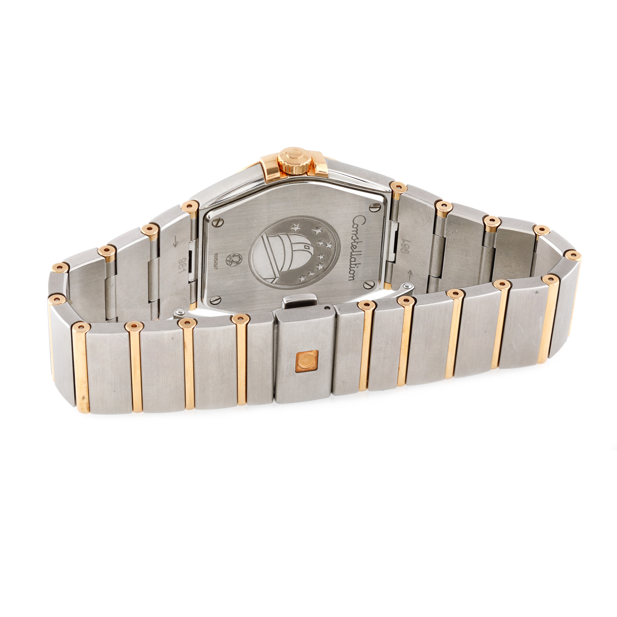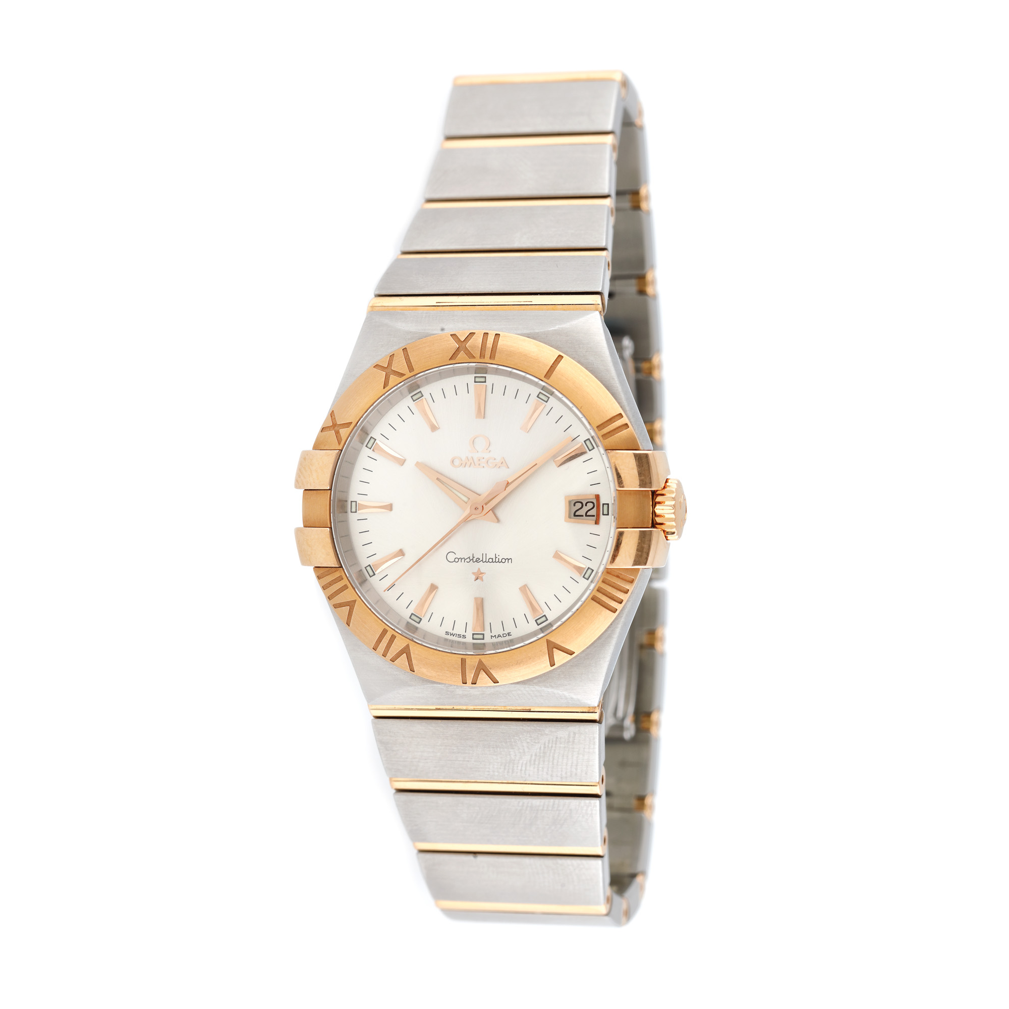 Ceas Omega Constellation, din aur roz și oțel, de mână, unisex, referință 123.20.35.60.02.001, mecanism quartz. Cadran argintiu, cu dată în dreptul orei 3. Brățară originală, din oțel și aur roz, cu închizătoare tip deployrant. Ceasul vine însoțit de actele de proveniență.