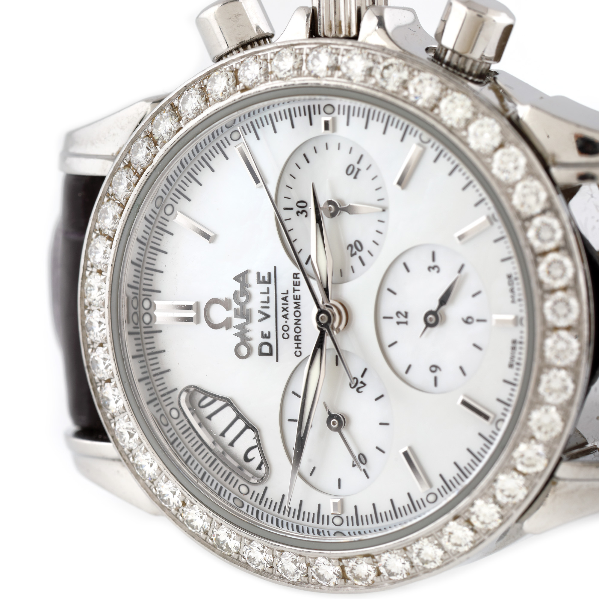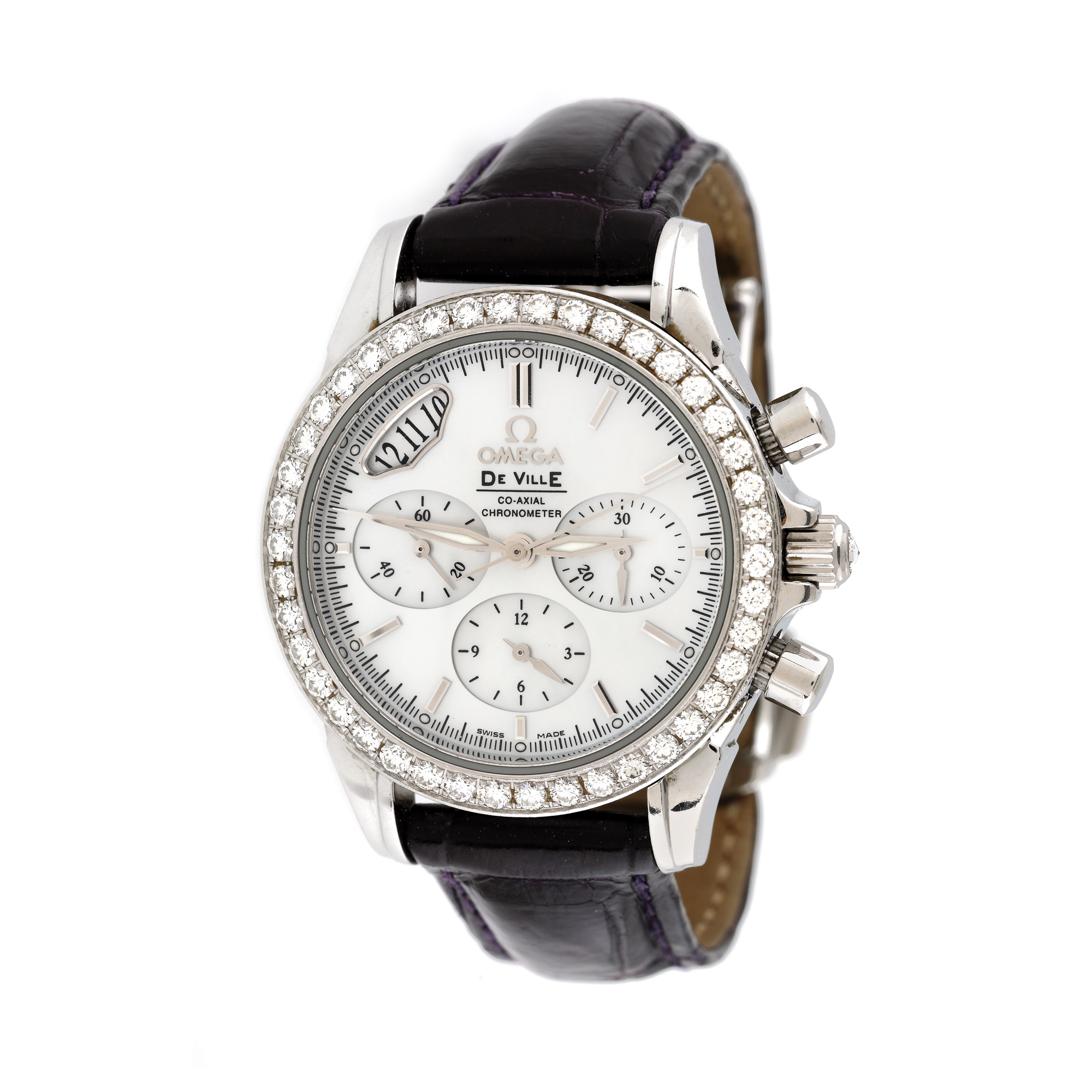 Ceas Omega De Ville, de mână, de damă, decorat cu diamante, referință 4877.70.36, mecanism automat, anterior vitrat. Cadran din sidef, cu trei registre și dată între orele 10-11 și bezel decorat cu diamante. Curea din piele de aligator, de culoare maro și închizătoare tip deployant, originale. Ceasul vine însoțit de actele de proveniență.