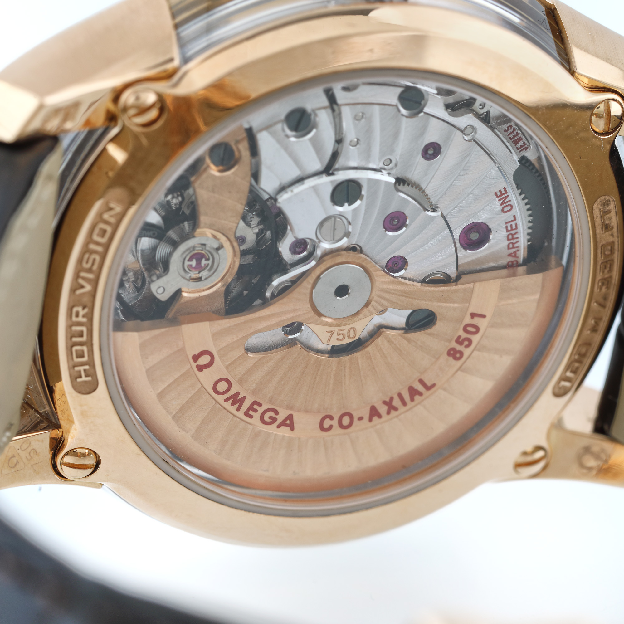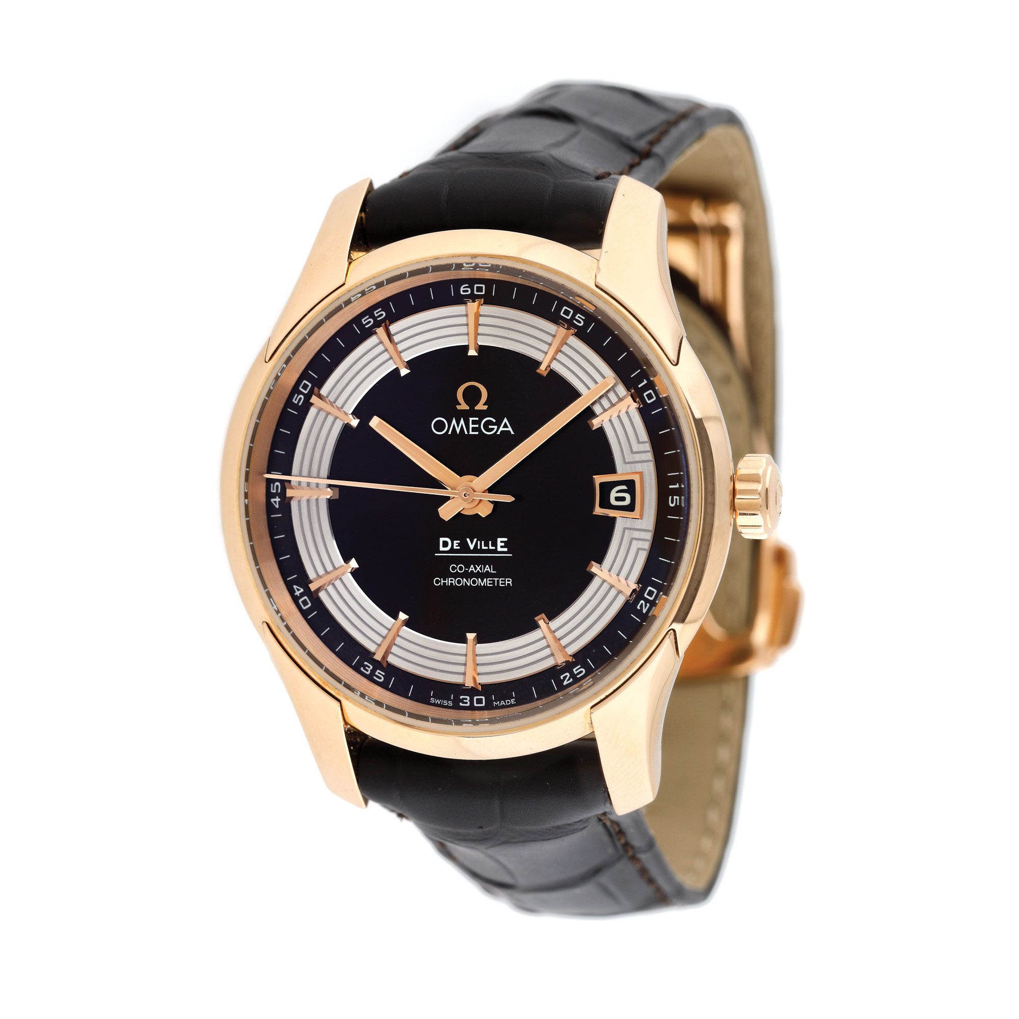 Ceas Omega De Ville, din aur roz, de mână, bărbătesc, referința 431.63.41.21.13.001, mecanism automatic, anterior vitrat. Cadran de culoare arămie și dată în dreptul orei 3. Curea din piele de aligator și închizătoare din aur roz, tip deployant, originale. Ceasul vine însoțit de actele de proveniență și de cutia originală.