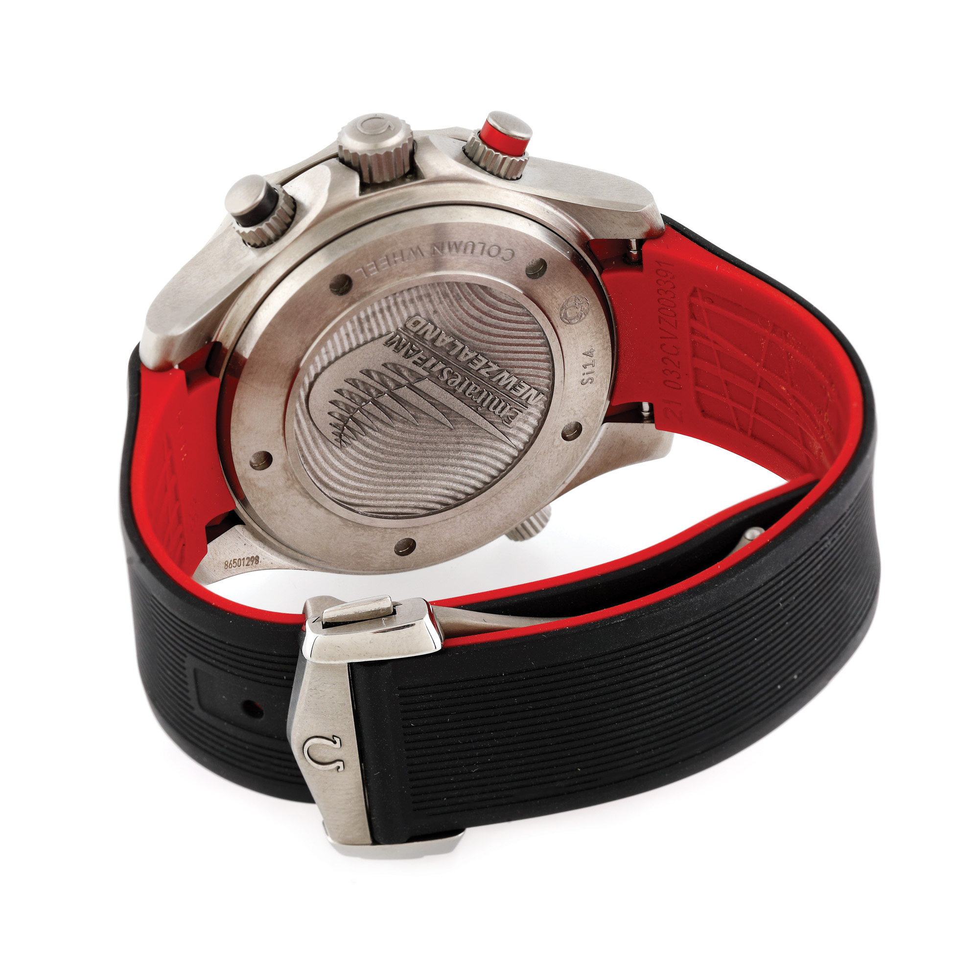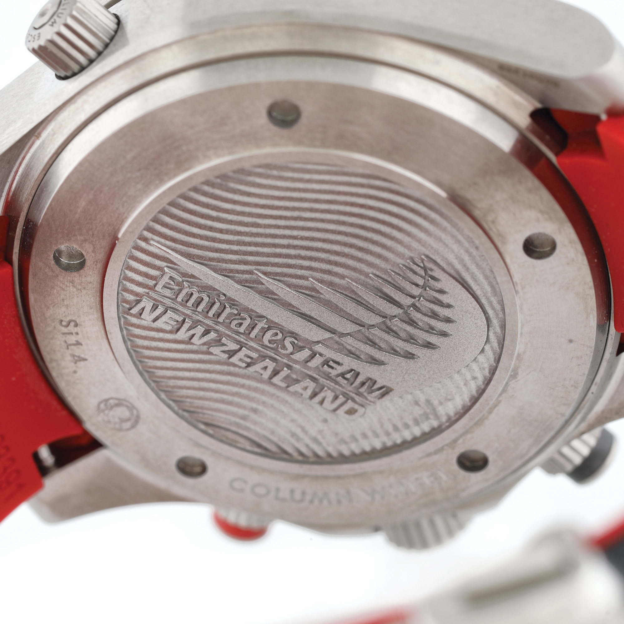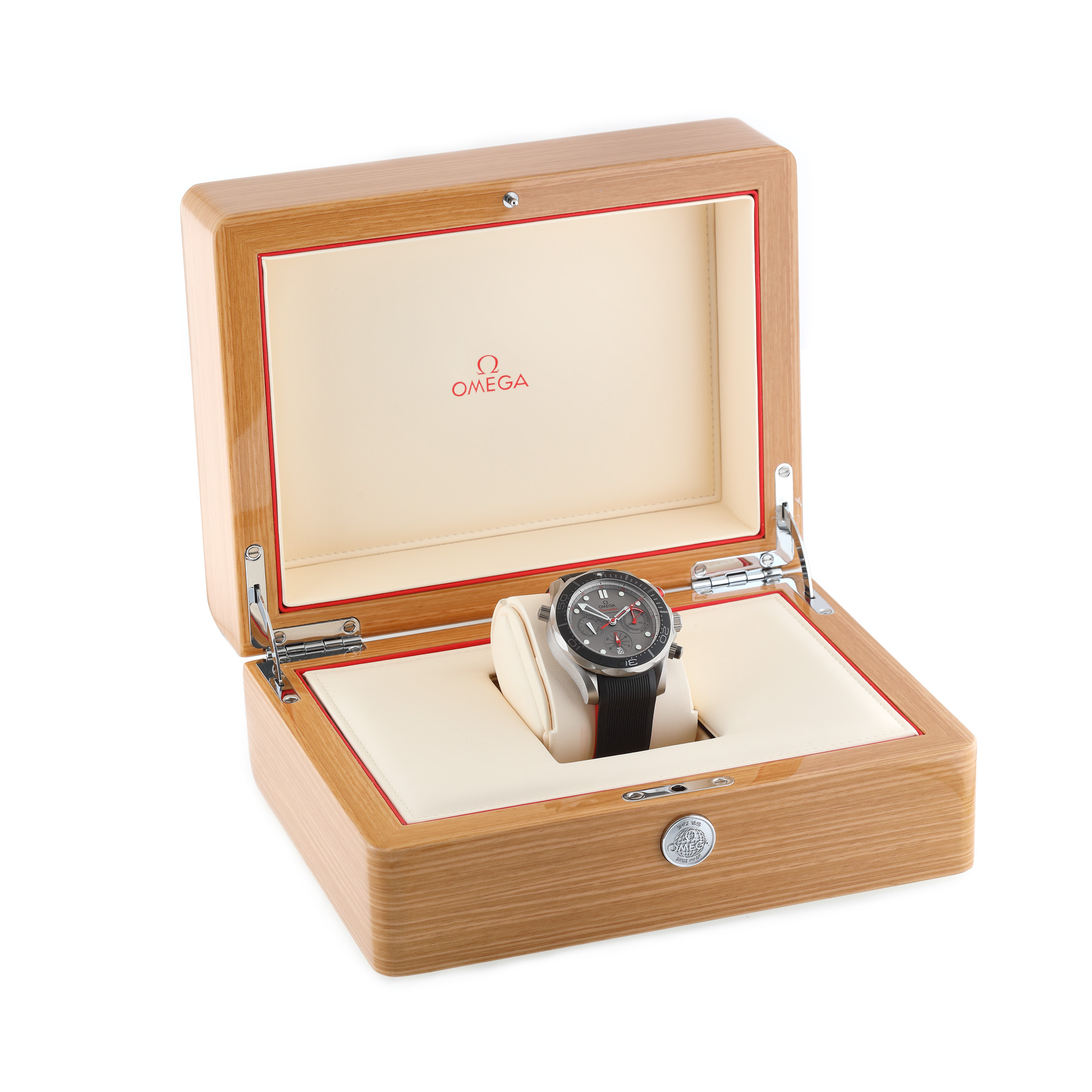 Ceas Omega Seamaster Diver, de mână, bărbătesc, referință 212.92.44.50.99.001, mecanism automatic chronograph, cu rezervă de timp de 52 h. Carcasă din titan, cadran gri, indecși orari luminiscenți, trei registre și dată în dreptul orei 6. Curea din cauciuc, cu cataramă tip deployant.
