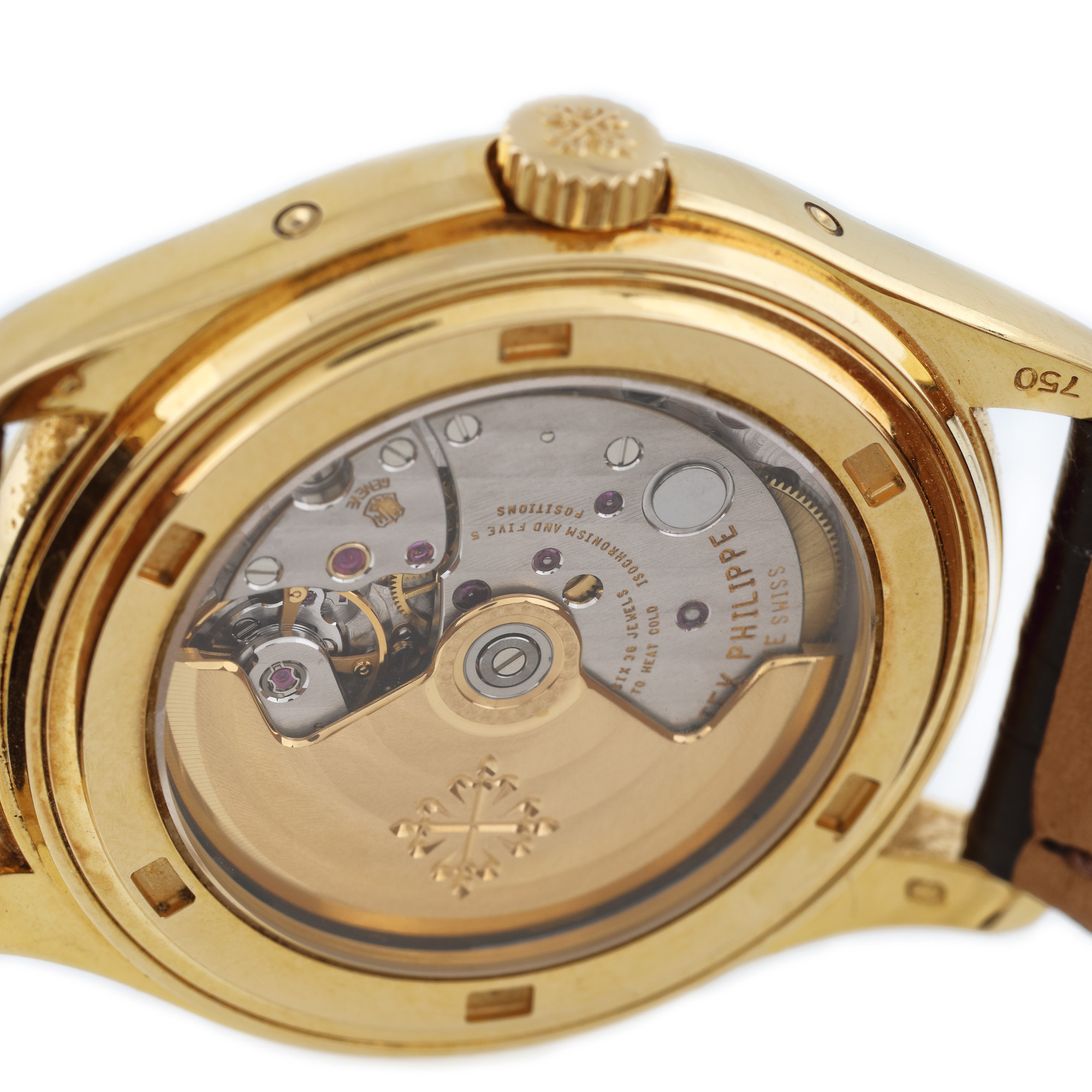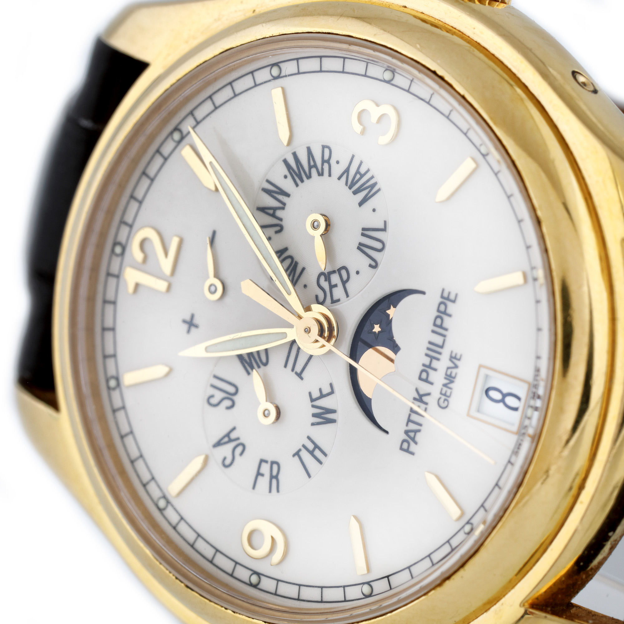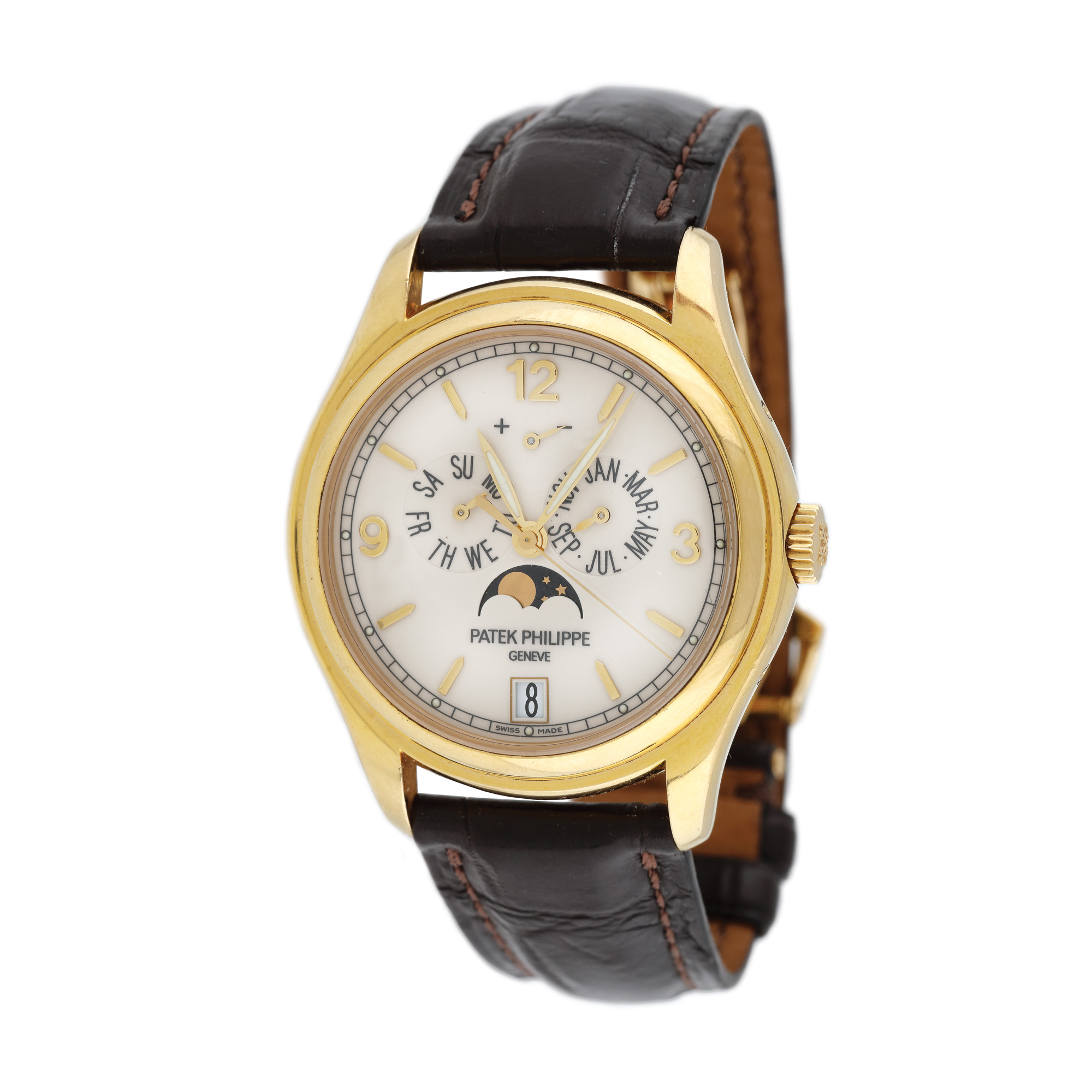 Ceas Patek Philippe Annual Calendar Moon Phase, din aur, de mână, bărbătesc, referință 5146J, mecanism automatic. Cadran de culoare alb, cu numerale arabe, trei registre și dată în dreptul orei 6. Calendarul anual brevetat a fost lansat în 1996 și a fost un produs de succes în ultimii 20 de ani. Indicând ziua săptămânii, data și luna, setările necesită corecție doar o dată pe an. Acest mecanism ingenios a fost declarat ca fiind unul dintre modelele emblematice ale brandului Patek Philippe. Modelul oferă o gamă de afișaje diferite și nuanțe de stil, combinând întotdeauna linii elegante, materiale nobile și o atenție fastuoasă la finisare. Ceasul vine însoțit de actele de proveniență și de cutia originală.