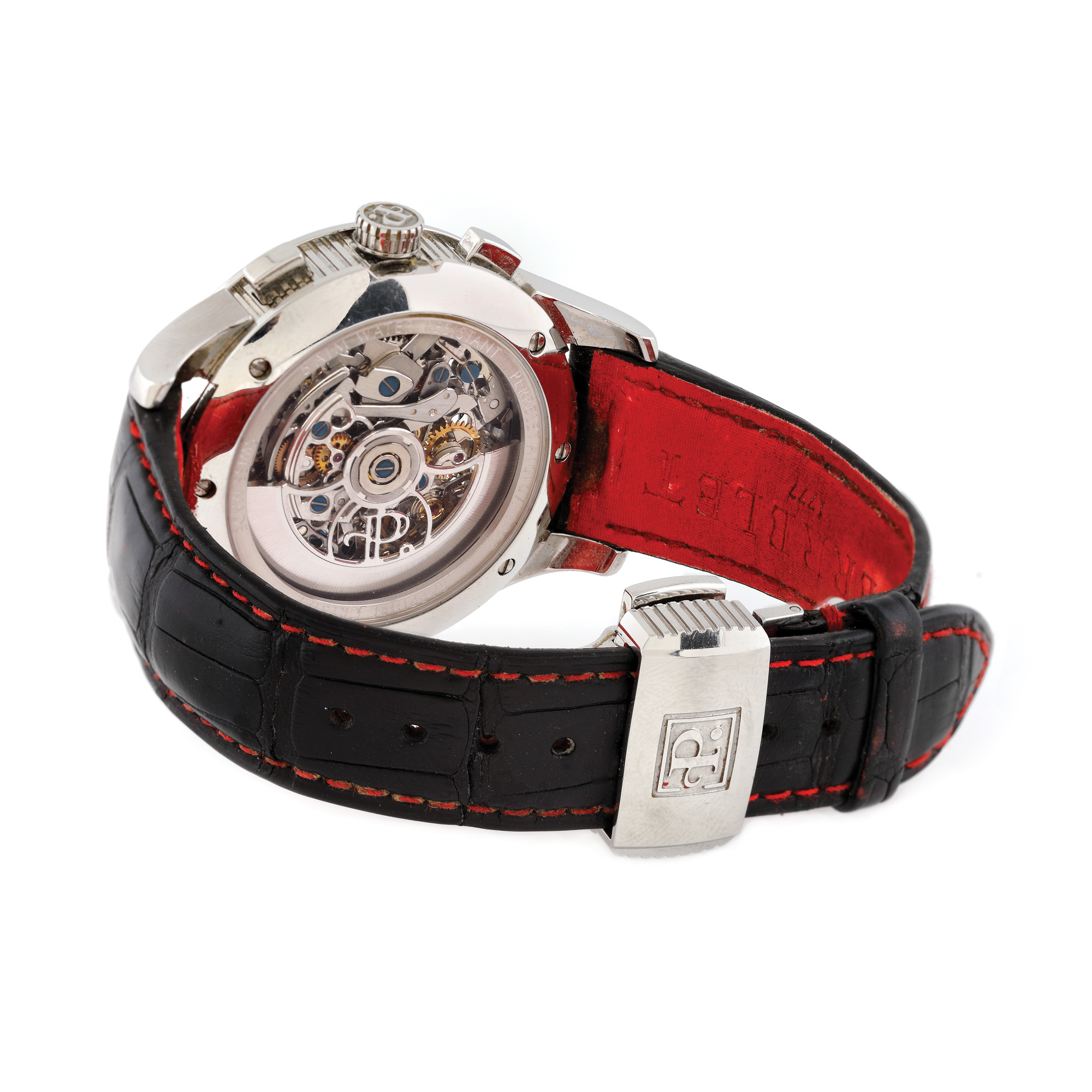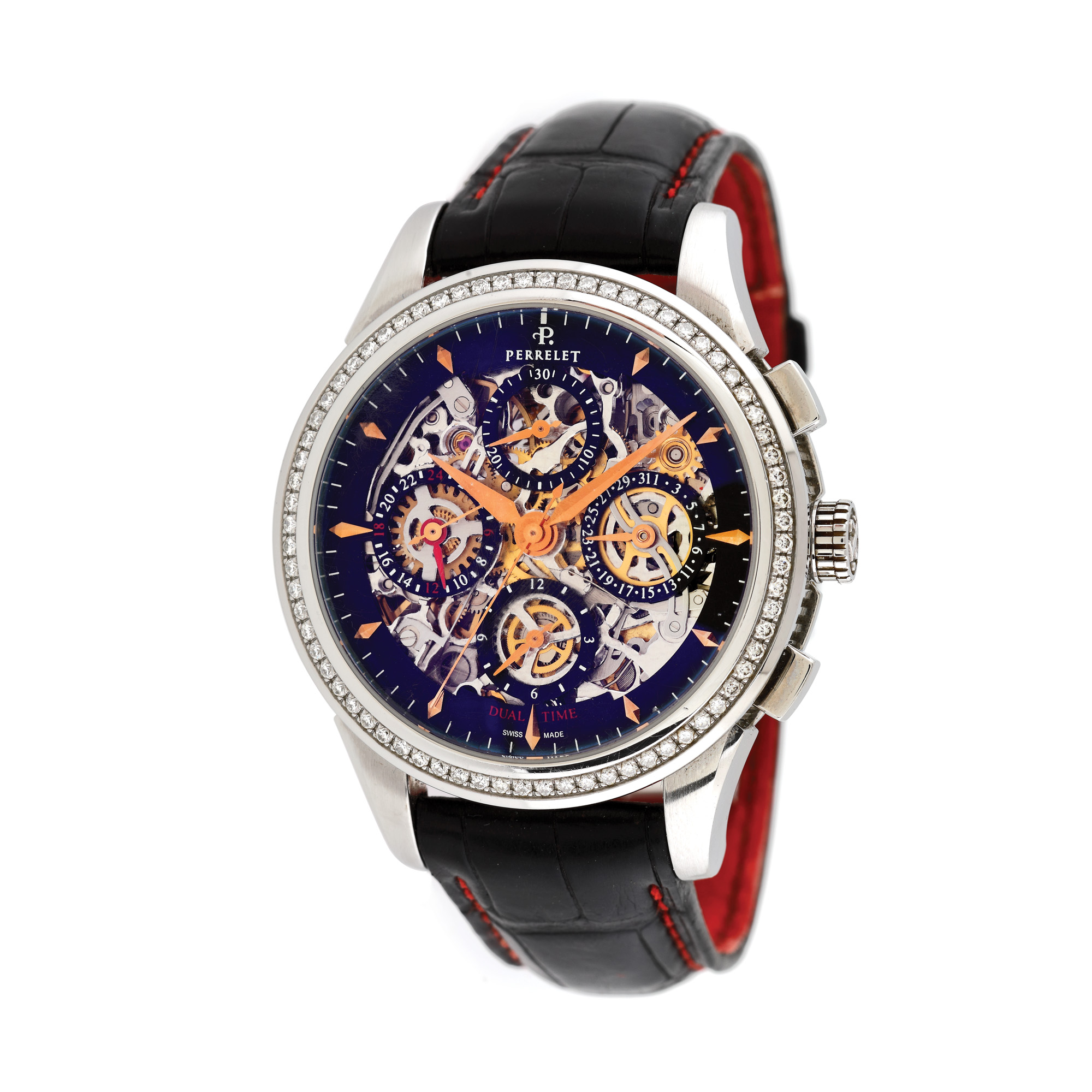 Ceas Perrelet Skeleton Chronograph, de mână, unisex, decorat cu diamante, referință a1010, mecanism automatic, anterior vitrat. Cadran skeleton și patru registre. Curea din piele de crocodil, de culoare neagră și închizătoare tip deployant, originale.