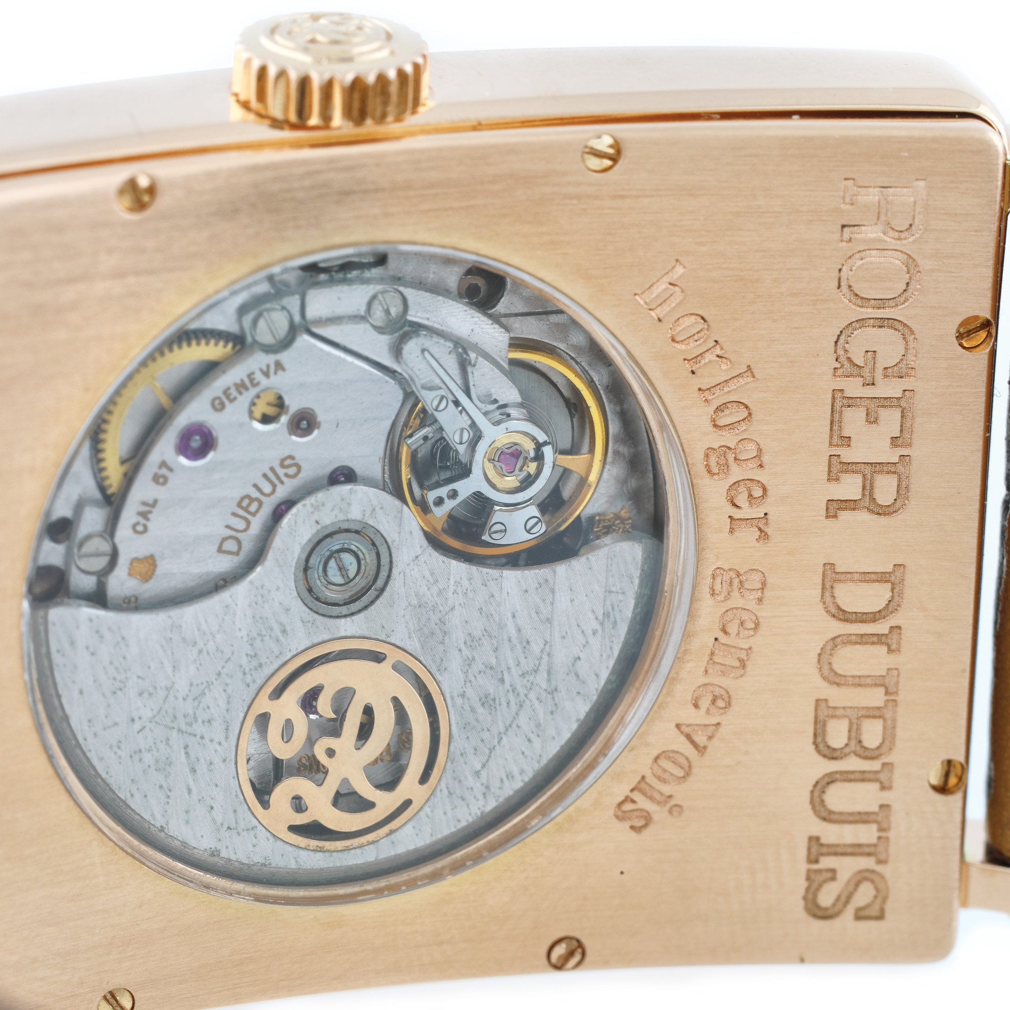 Ceas Roger Dubuis, de mână, bărbătesc, referință M345751.62/17 HEPW63, mecanism automatic, vitrat anterior. Carcasă rectangulară din aur roz, cadran crem cu numerale arabe aurii, curea neagră din piele de crocodil.