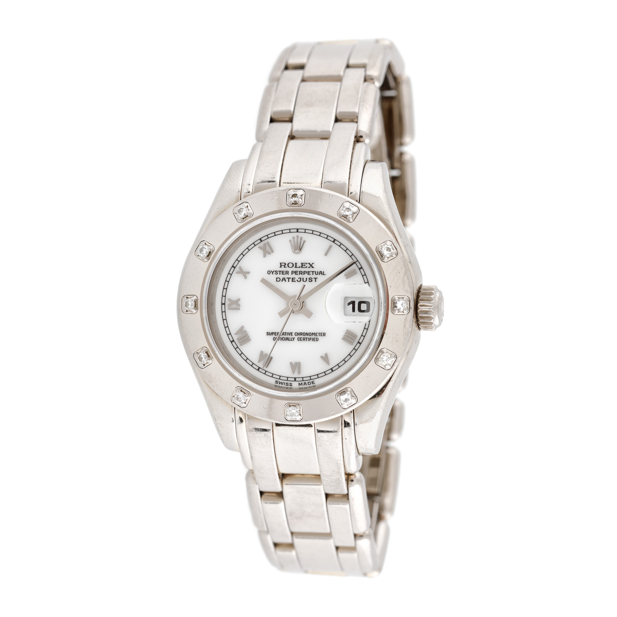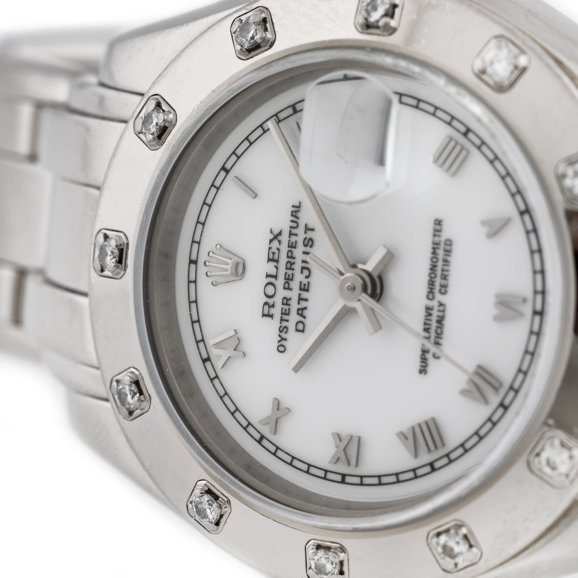 108. Ceas Rolex DateJust, din aur alb, de mână, de damă, decorat cu diamante, vine însoțit de cutia originală [Cca. 2000]