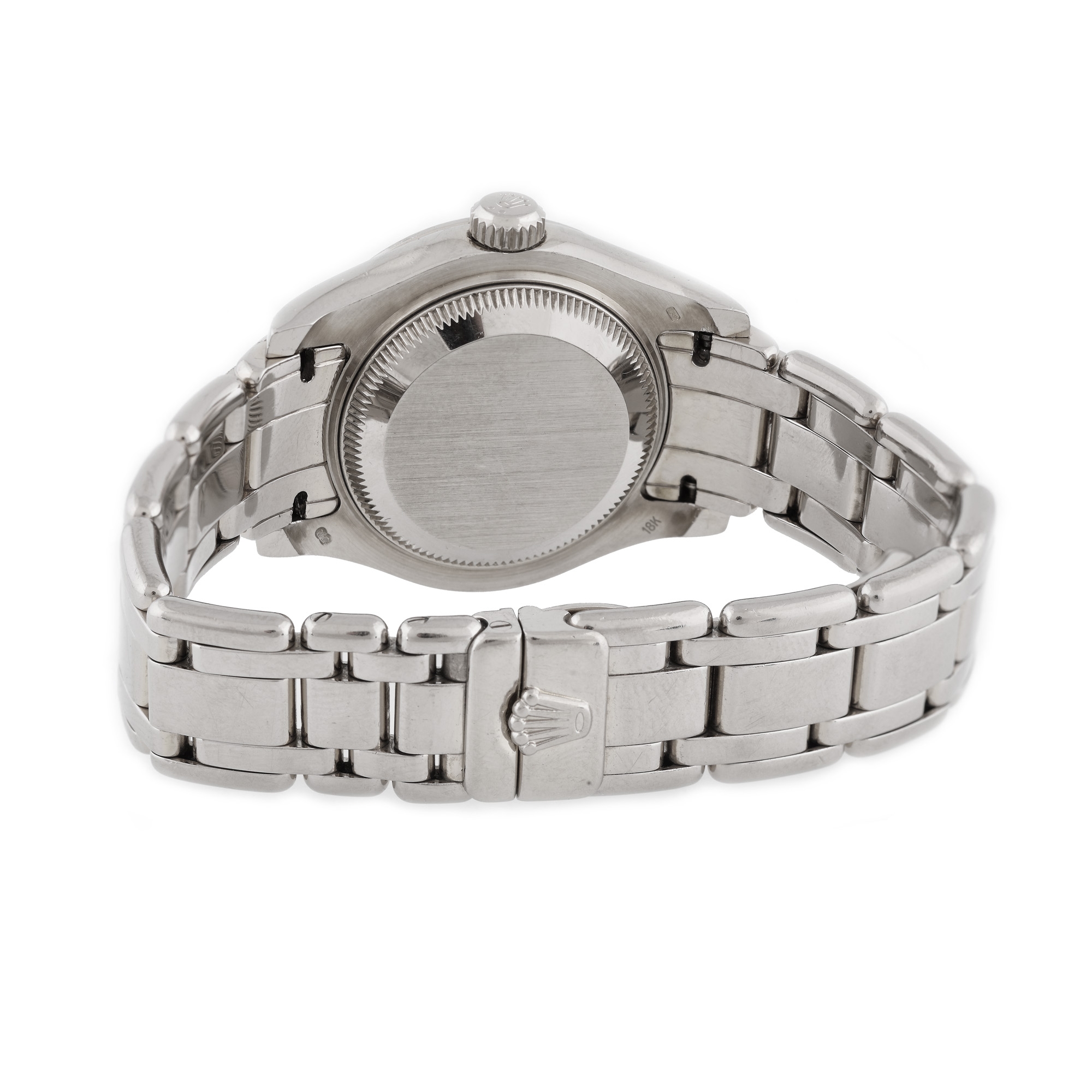 Ceas Rolex DateJust, din aur alb, de mână, de damă, decorat cu diamante, referință 69319, mecanism automatic. Cadran de culoare alb, numerale romane și dată cu lupă în dreptul orei 3. Brățară și sistem de închidere deployant, originale. Ceasul vine însoțit de cutia originală.