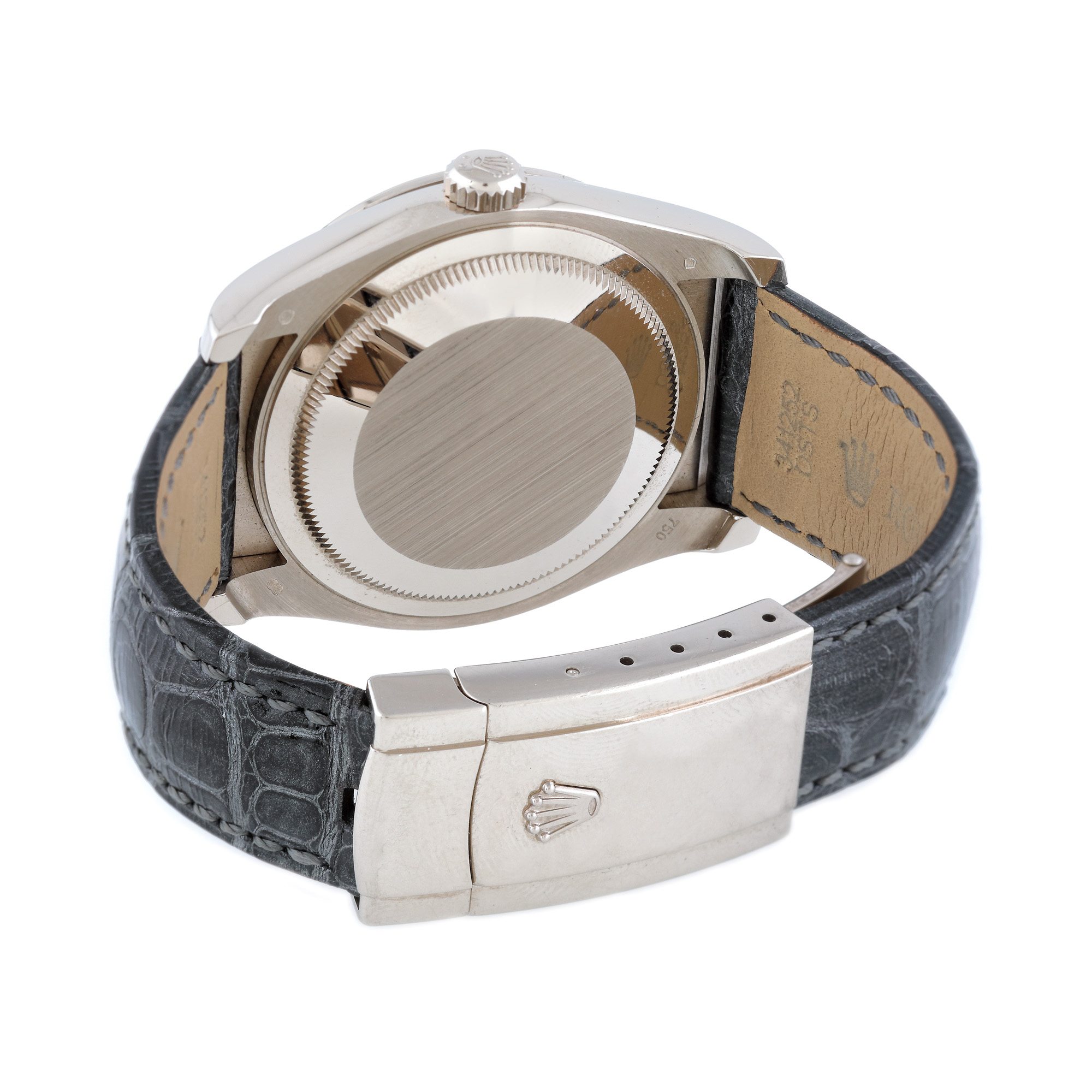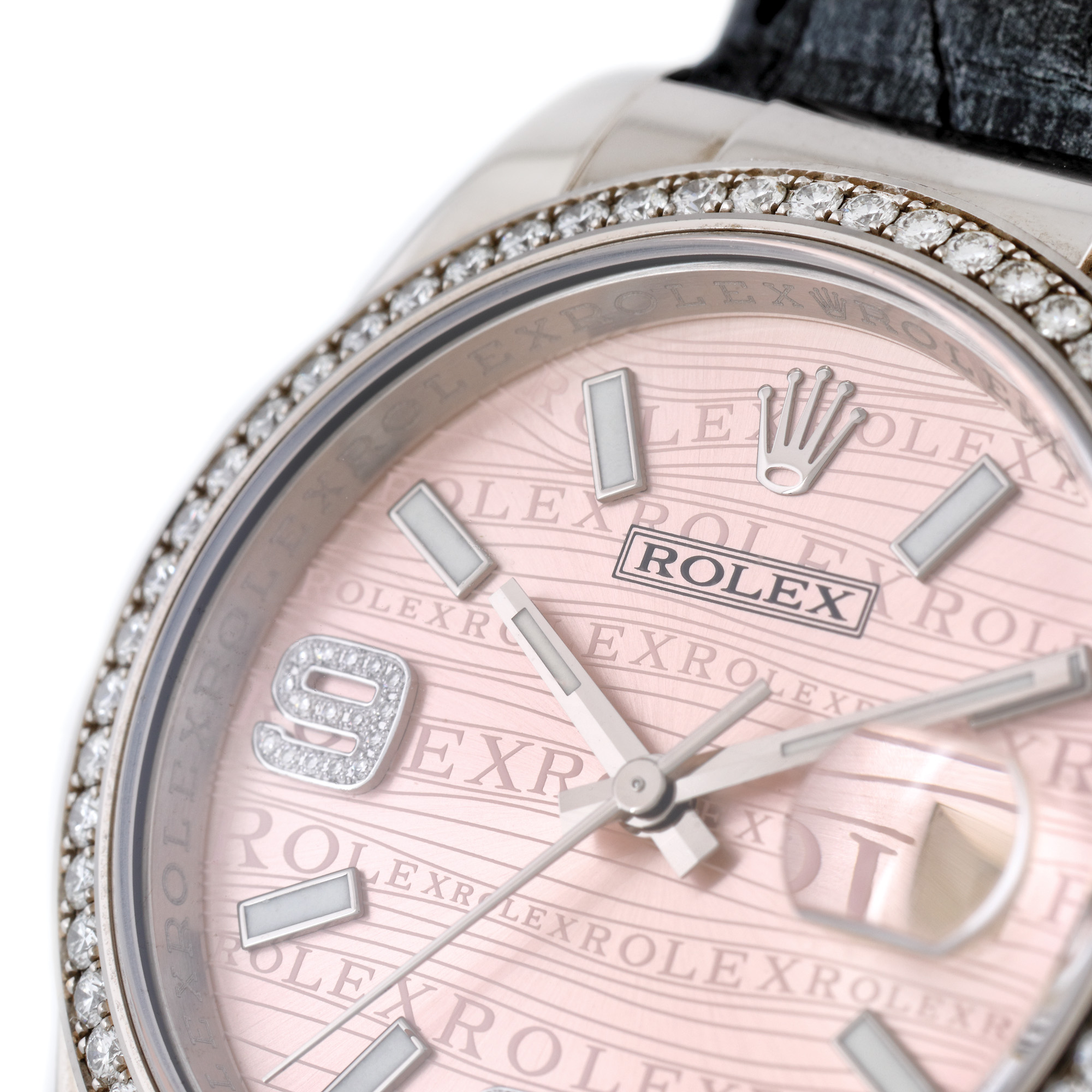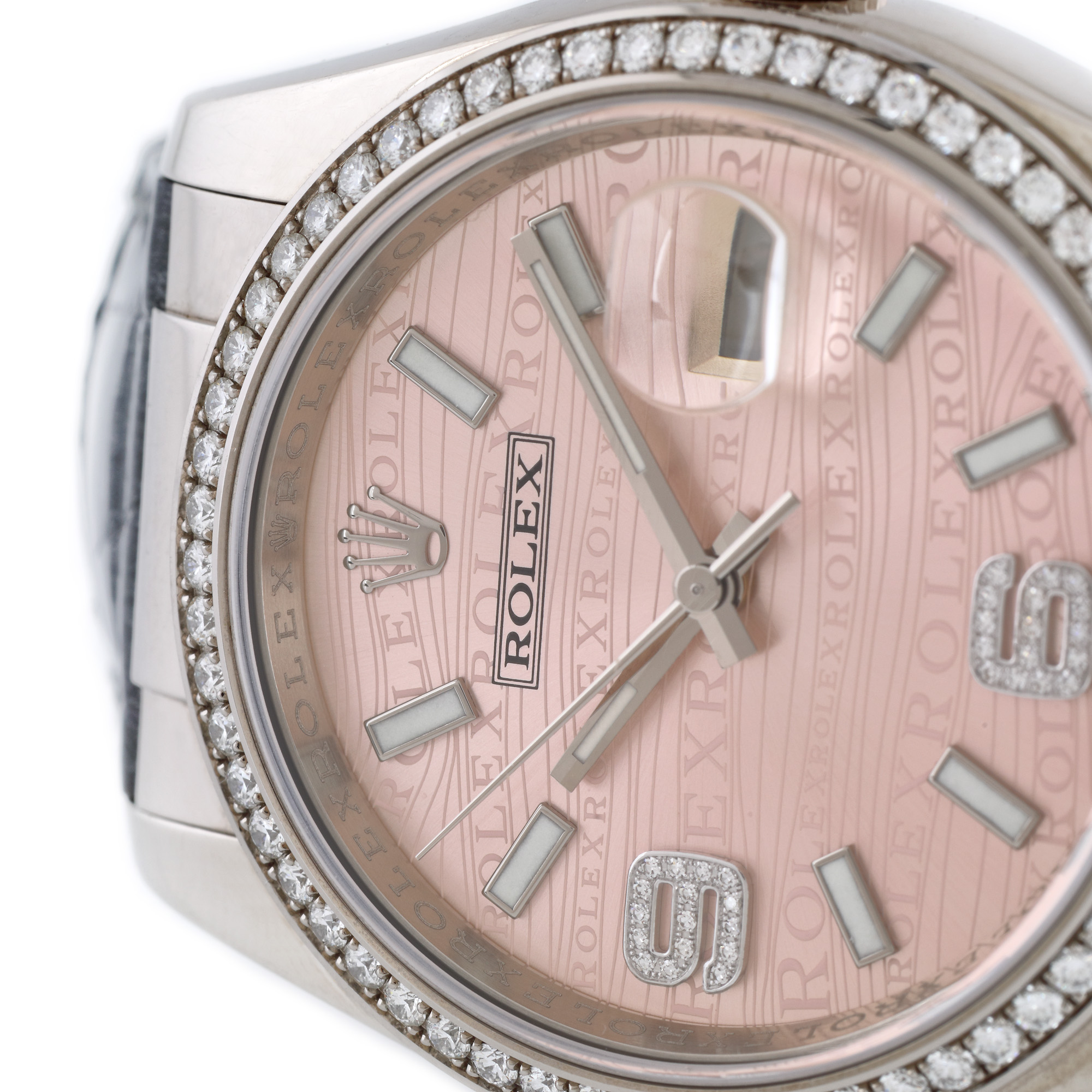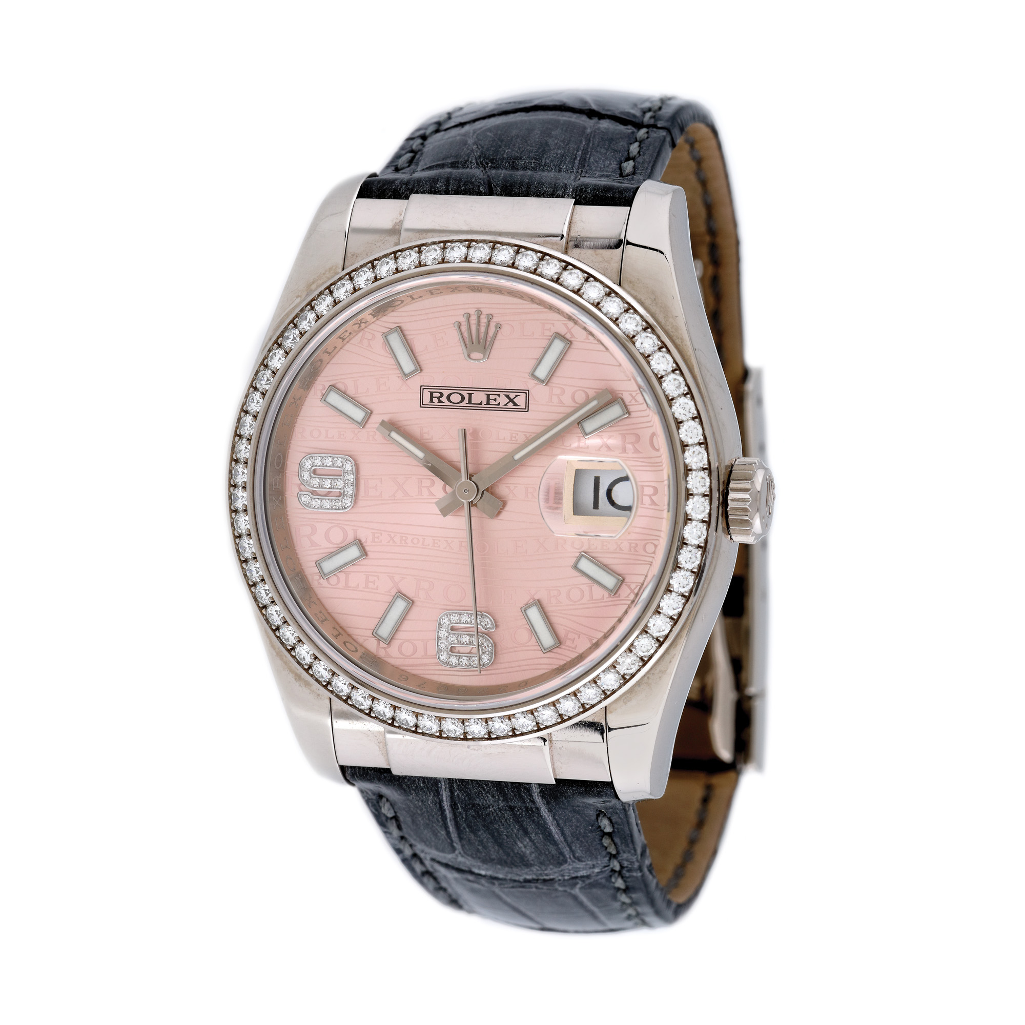 Ceas Rolex Datejust, din aur alb, de mână, de damă, cu referința 116189, mecanism automatic. Cadranul de culoare roz, decorat cu ”rolex pattern”, numerale arabe, dată cu lupă în dreptul orei 3 și bezel decorat cu diamante. Curea din piele de aligator și sistem de închidere tip deployant, originale. Ceasul vine însoțit de actele de proveniență și de cutia originală.