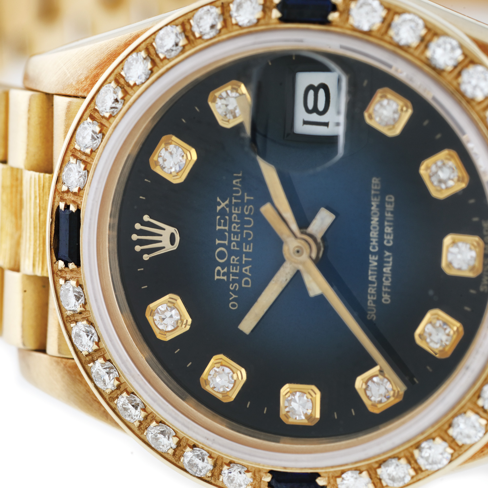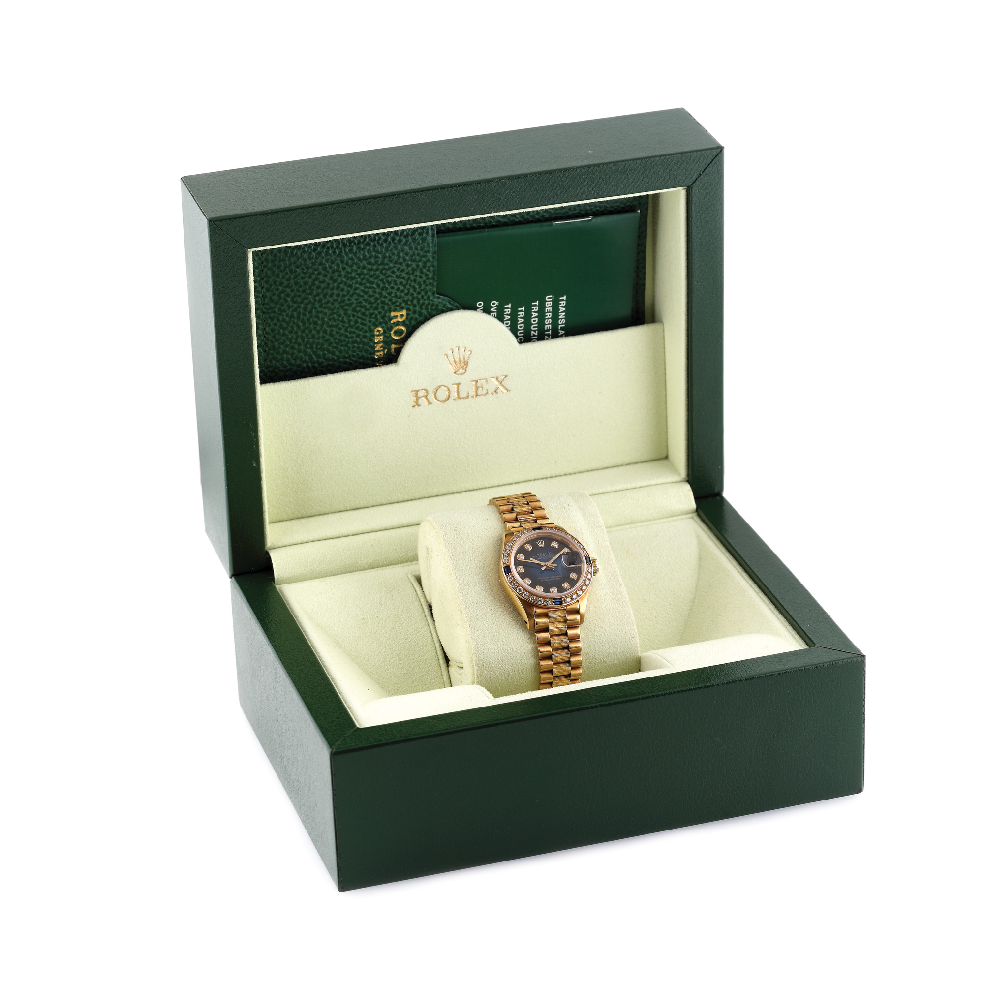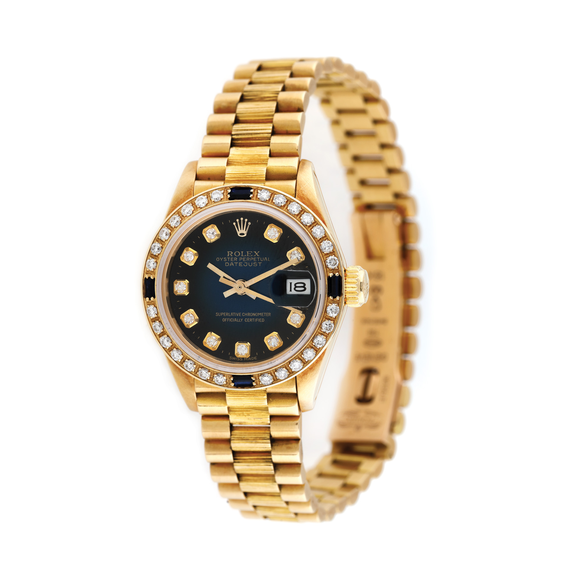 79. Ceas Rolex Datejust, din aur, de damă, decorat cu diamante și safire, vine însoțit de actele de proveniență, manualul de utilizare și cutia originală [Cca. 1984]