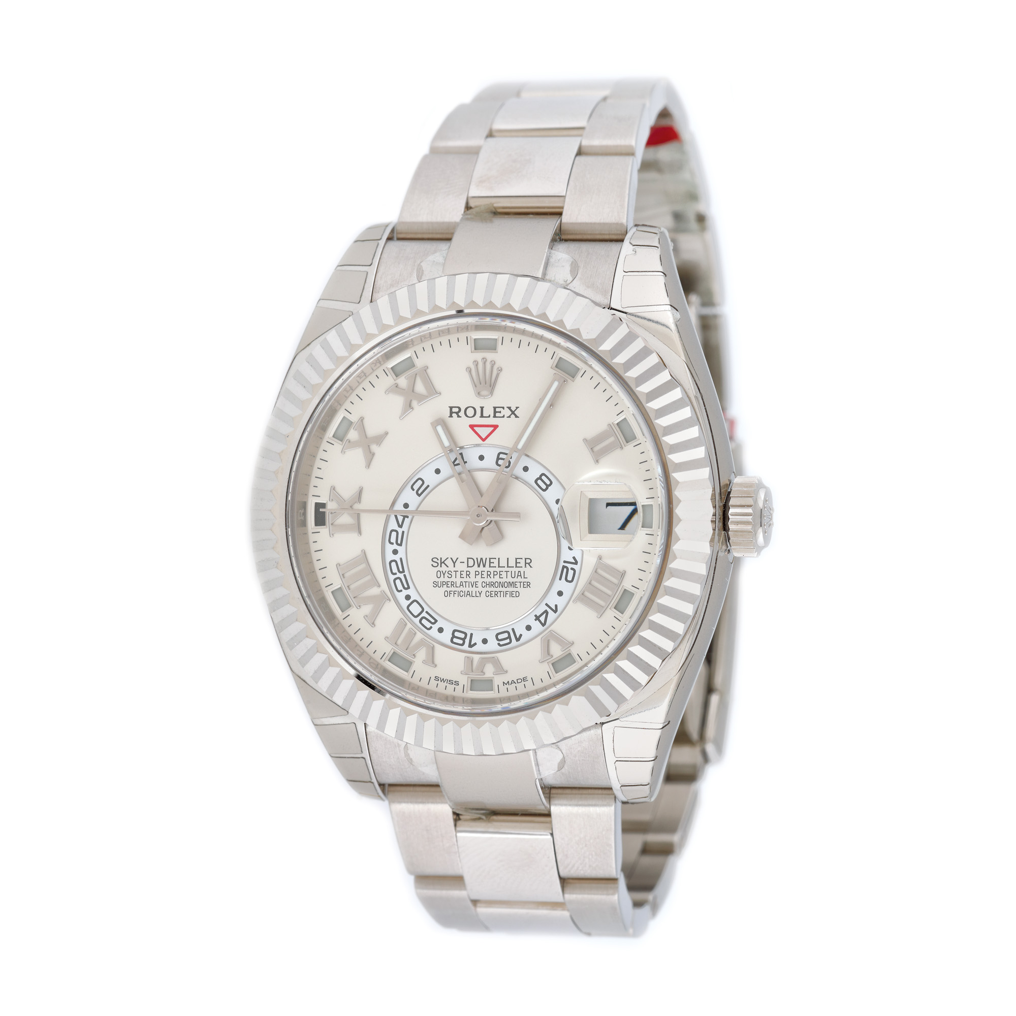 Ceas Rolex Sky-Dweller, din aur alb, de mână, bărbătesc, referință 326939, mecanism automatic, calibru 9001, rezervă de timp de 72 h, calendar anual. Cadran ivory, numerale romane, dată cu lupă în dreptul orei 3, bezel rotativ și geam din safir. Acest model este unul dintre cele mai noi apărute din gama propusă de Rolex. Mecanismul acestuia fiind cel mai complicat în producție, având calendar complet și dual time zone. Ceasul vine însoțit de actele de proveniență și de cutia originală.