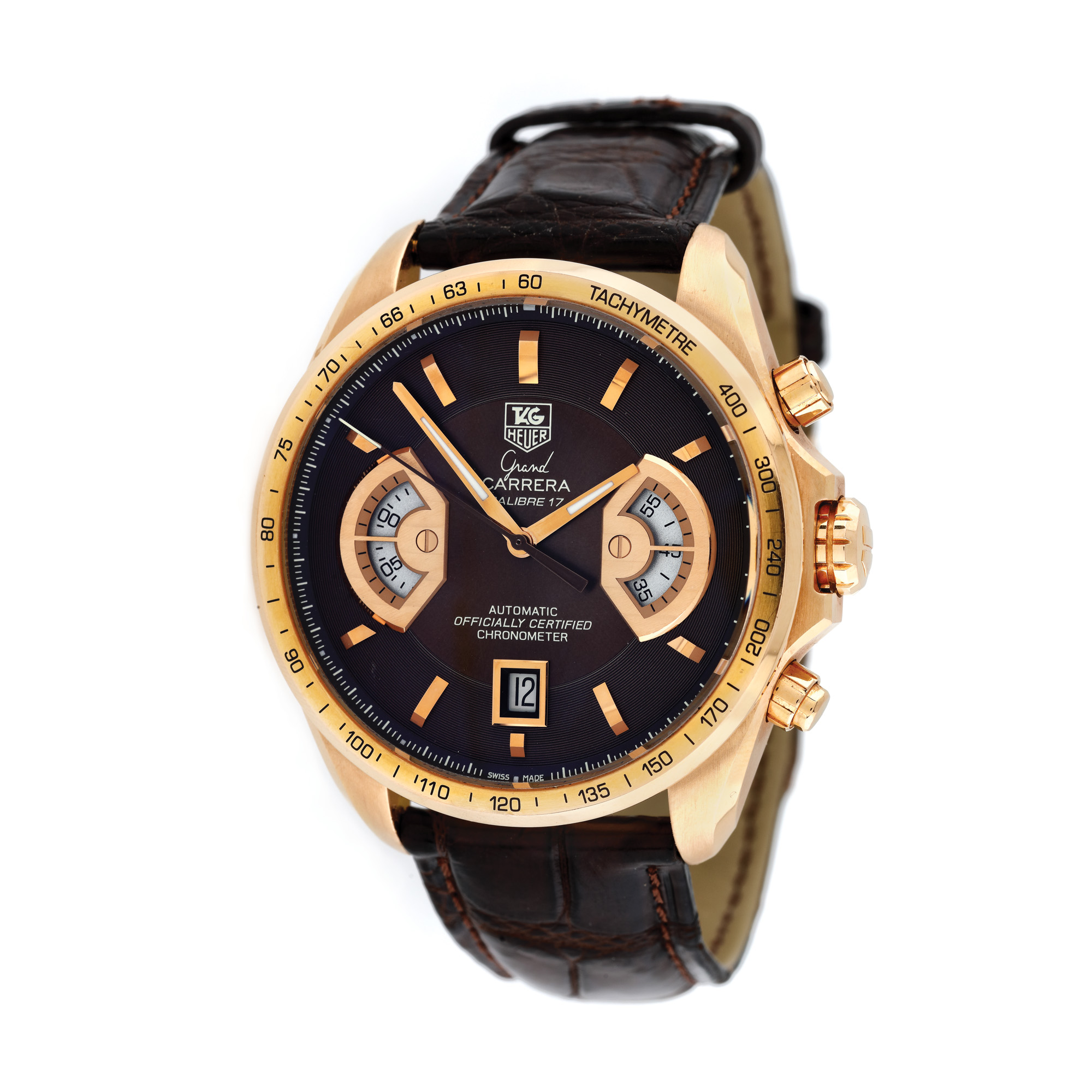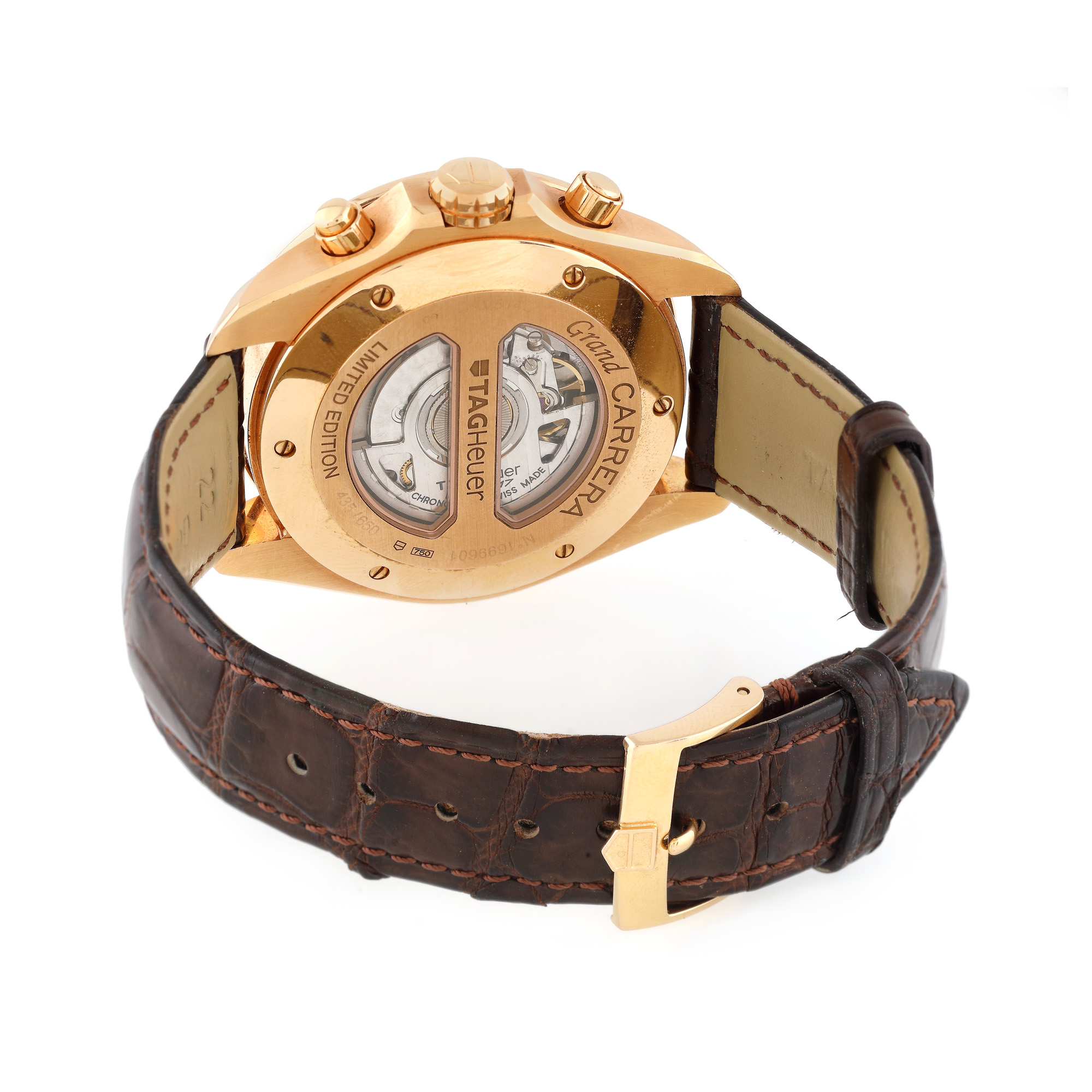 Ceas Tag Heuer Grand Carrera din aur roz, de mână, bărbătesc, ediție limitată 435/650, referința CAV514C, mecanism automatic, anterior vitrat. Cadran de culoare maro, cu două registre și dată în dreptul orei 6. Curea din piele de aligator, de culoare maro și cataramă din aur, originale. Ceasul vine însoțit de actele de proveniență și de cutia originală.