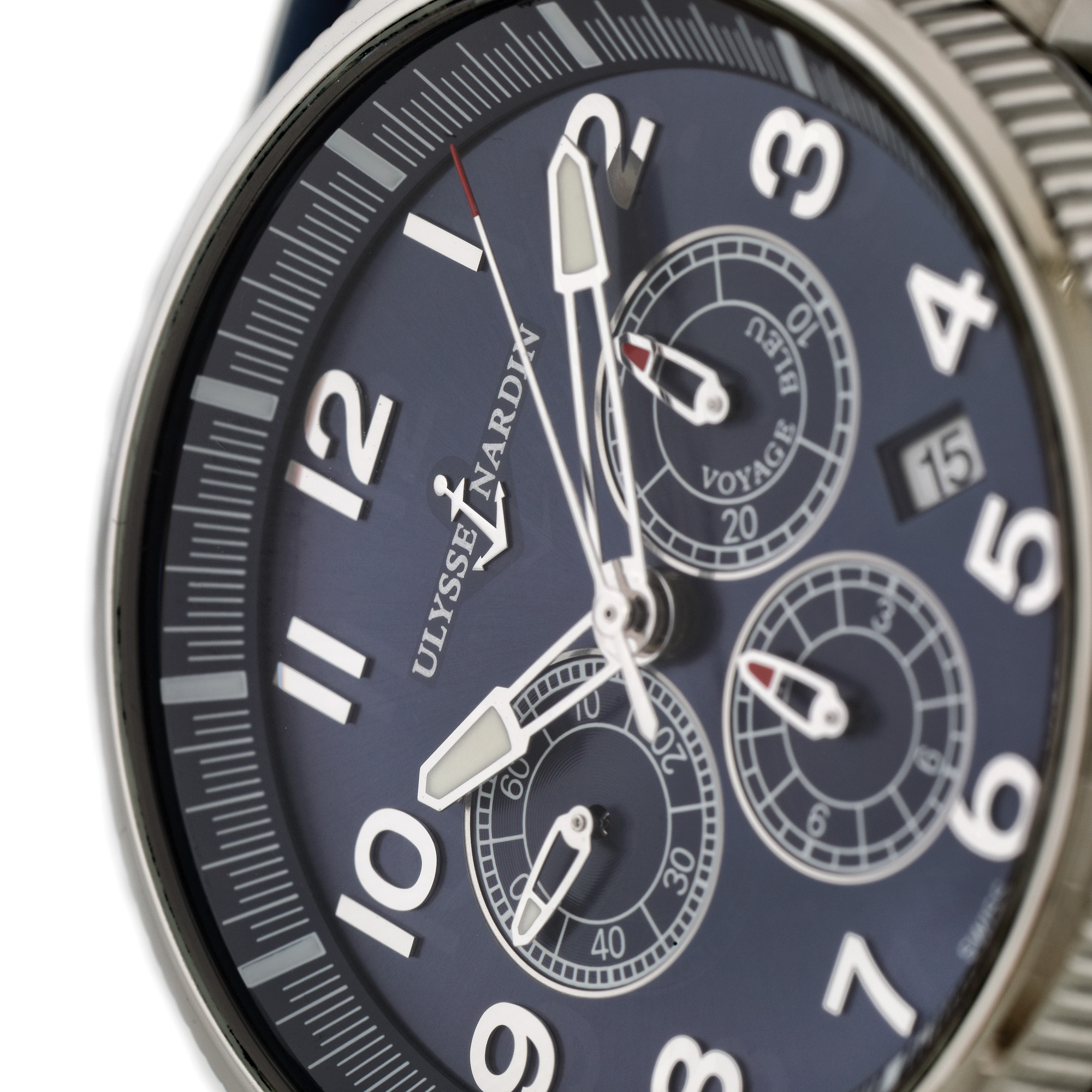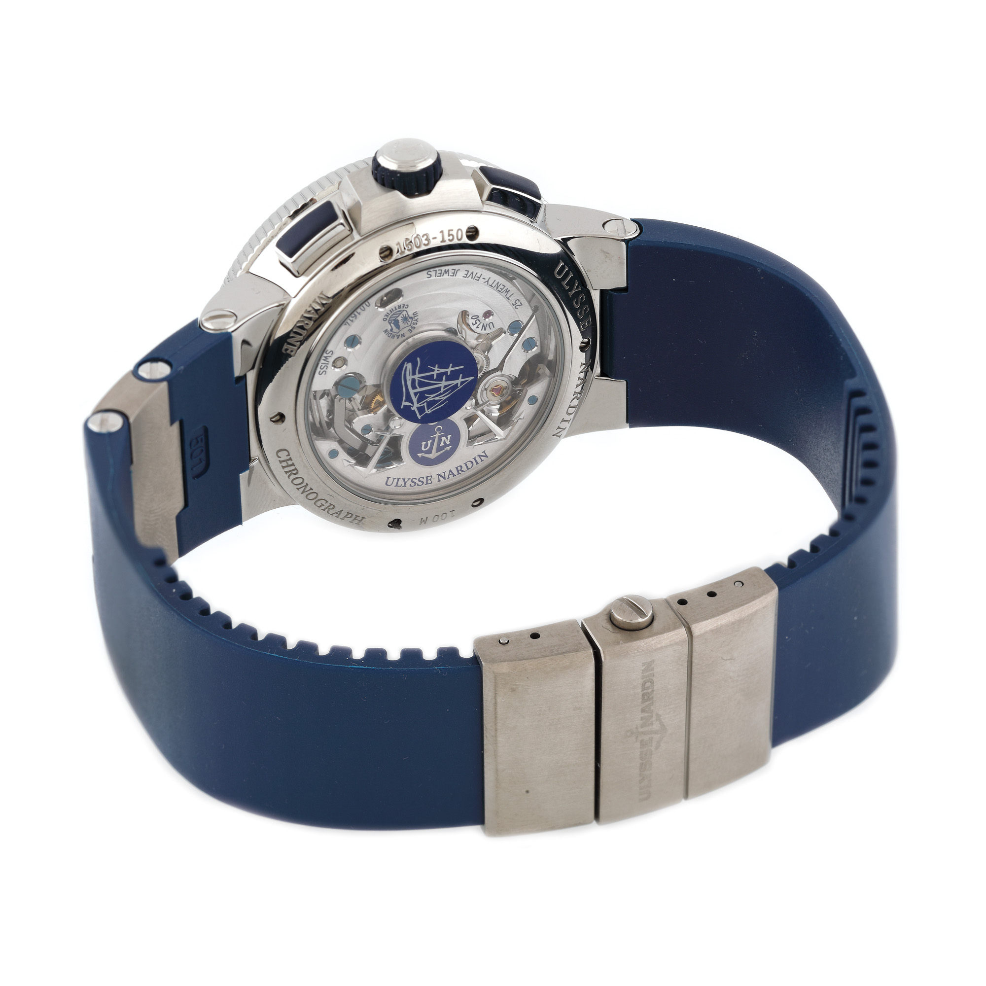 Ceas Ulysse Nardin Marine Chronograph, de mână, bărbătesc, referință 1503-150, mecanism automatic, anterior vitrat. Cadran de culoare bleumarin, cu numerale arabe, trei registre și dată între orele 4-5. Curea din cauciuc, de culoare bleumarin și sistem de închidere tip deployant, originale. Ceasul vine însoțit de actele de proveniență.