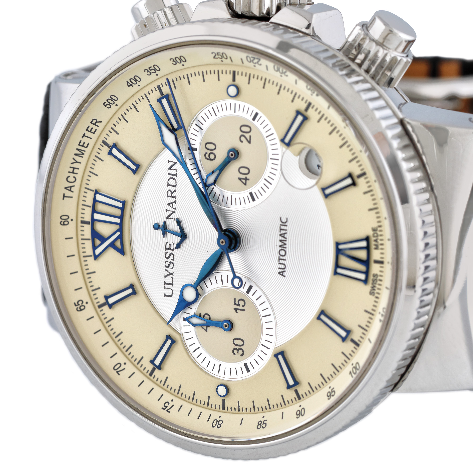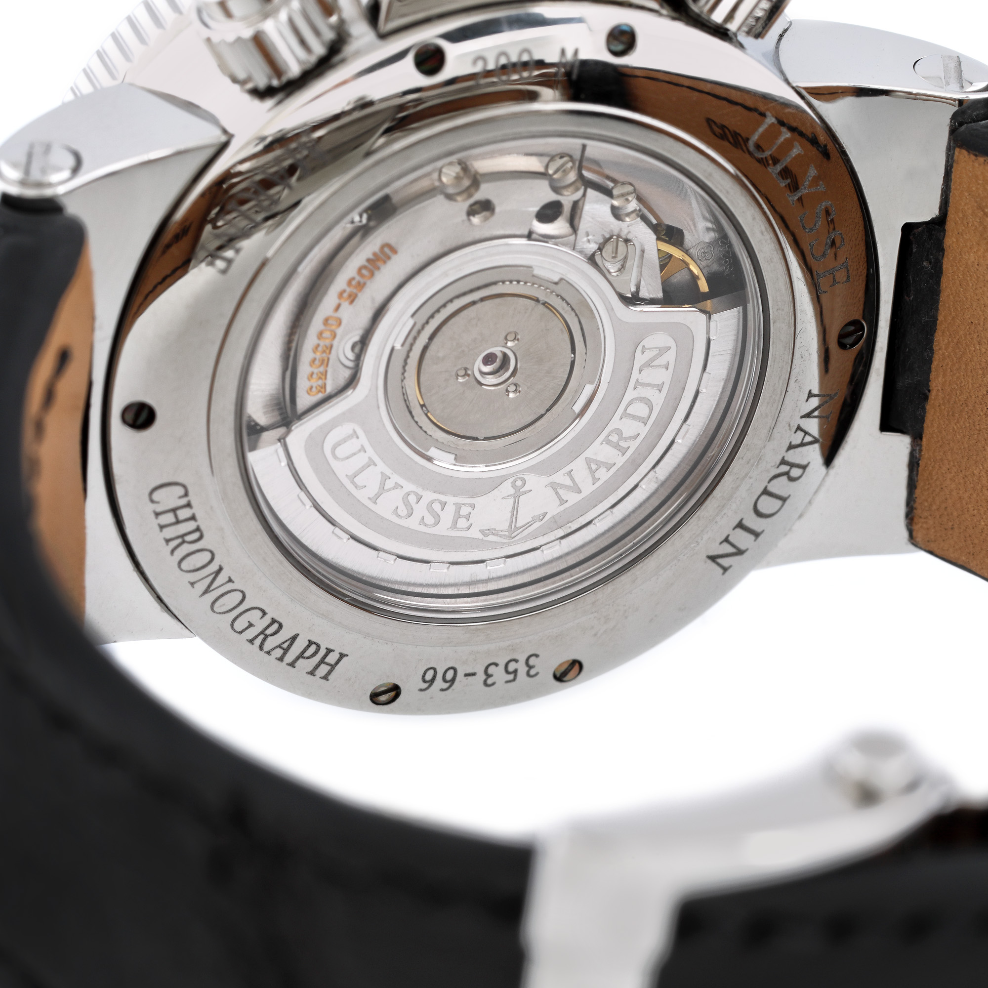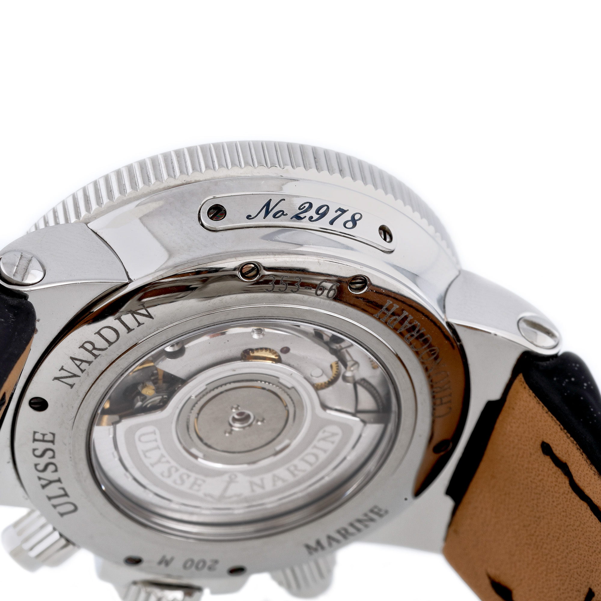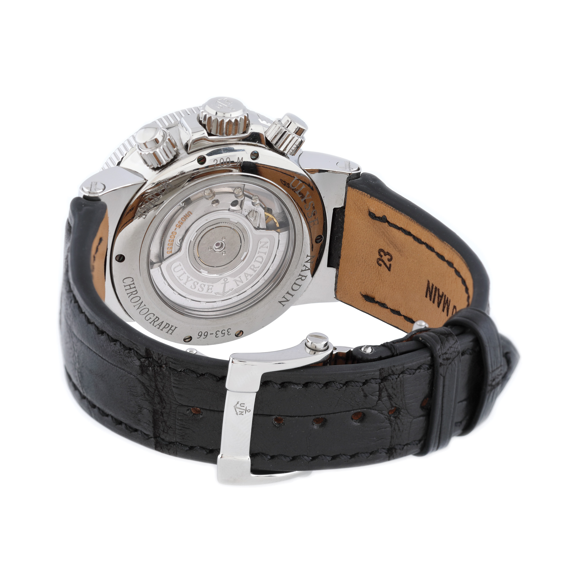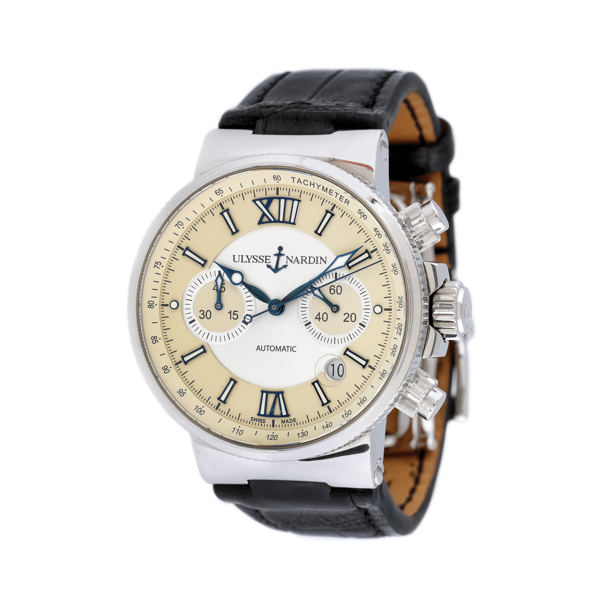 Ceas Ulysse Nardin Marine Chronograph, de mână, bărbătesc, cu referință 353-66, calibru UN-35, mecanism automatic cronograf, vitrat anterior. Cadranul argintiu și ivoriu, decorat central în tehnica guilloché cuprinde două registre cronograf, numerale romane și dată cu lupă între orele 4 și 5. Curea din piele de crocodil de culoare neagră și sistem de închidere deployant, originale. Ceasul vine însoțit de actele de proveniență.