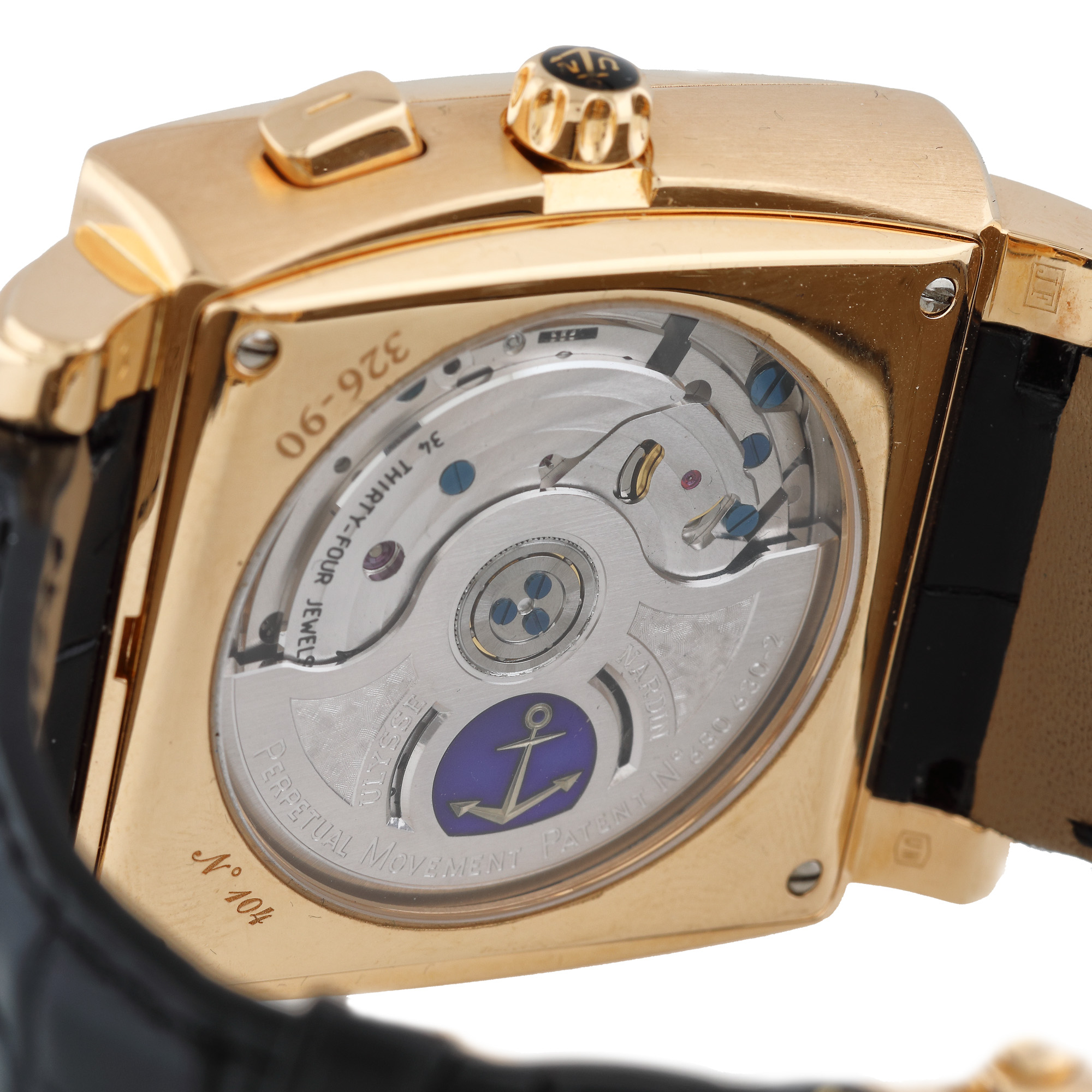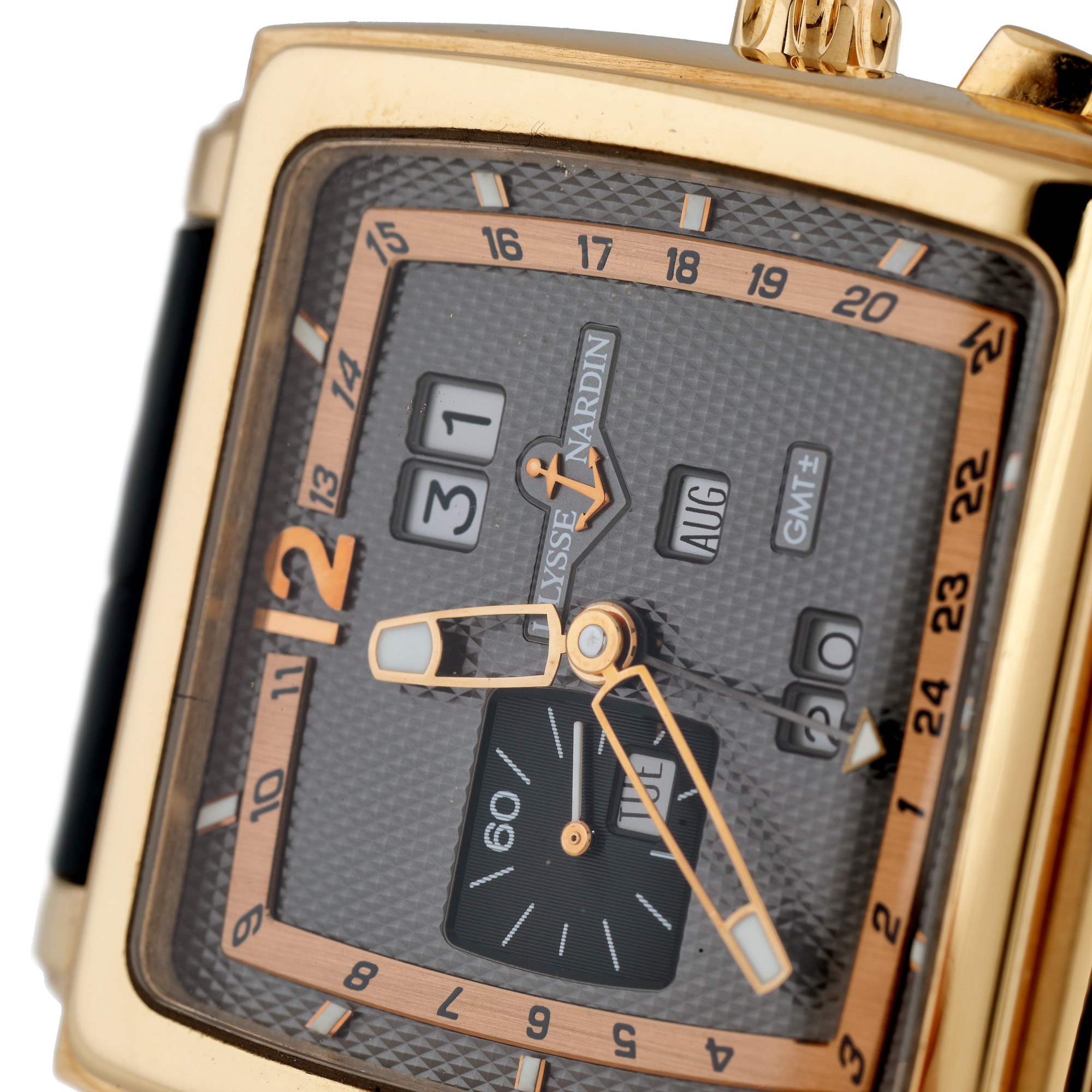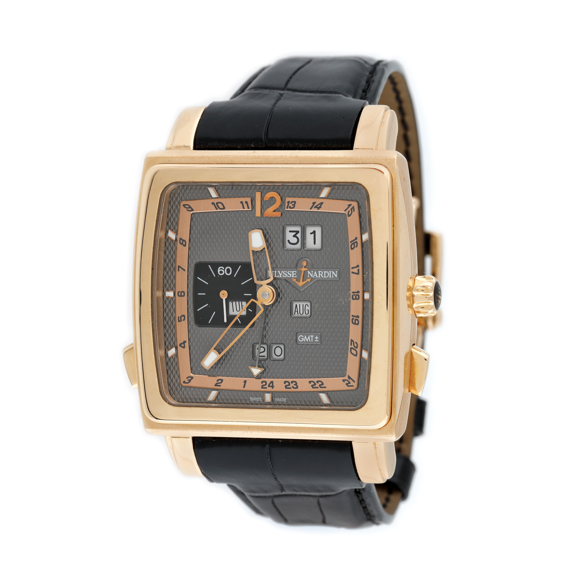 Ceas Ulysse Nardin Quadrato Dual Time Perpetual, de mână, bărbătesc, referinţă 326-90, mecanism automatic. Cadran de culoare gri, cu elemente arămii, numerale arabe, un registru, dată între orele 12 şi 1, afișaj pentru: dată între orele 8 şi 9; luna între orele 3 şi 4 şi oră în alt fus orar în dreptul orei 6. Curea din piele cusută manual si închizătoare din aur, de tip deployant, originale.
