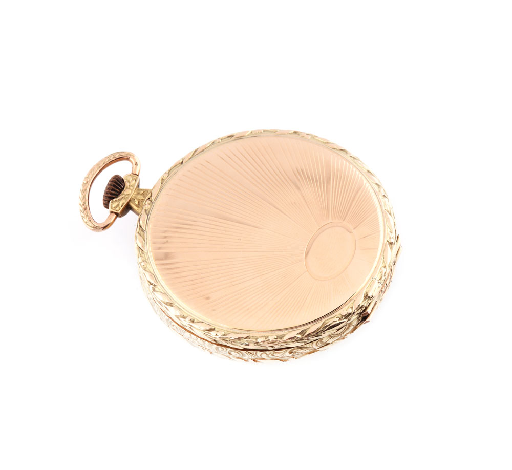 Ceas Patek Philippe, din aur, de buzunar, ce cuprinde un mecanism marcat Patek Philippe, cu armare manuală, având seria 17323. Carcasă din aur de 14 k, decorată cu motive florale, înseriată 860 8052.