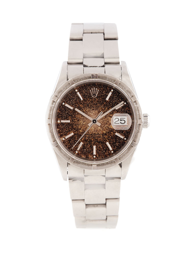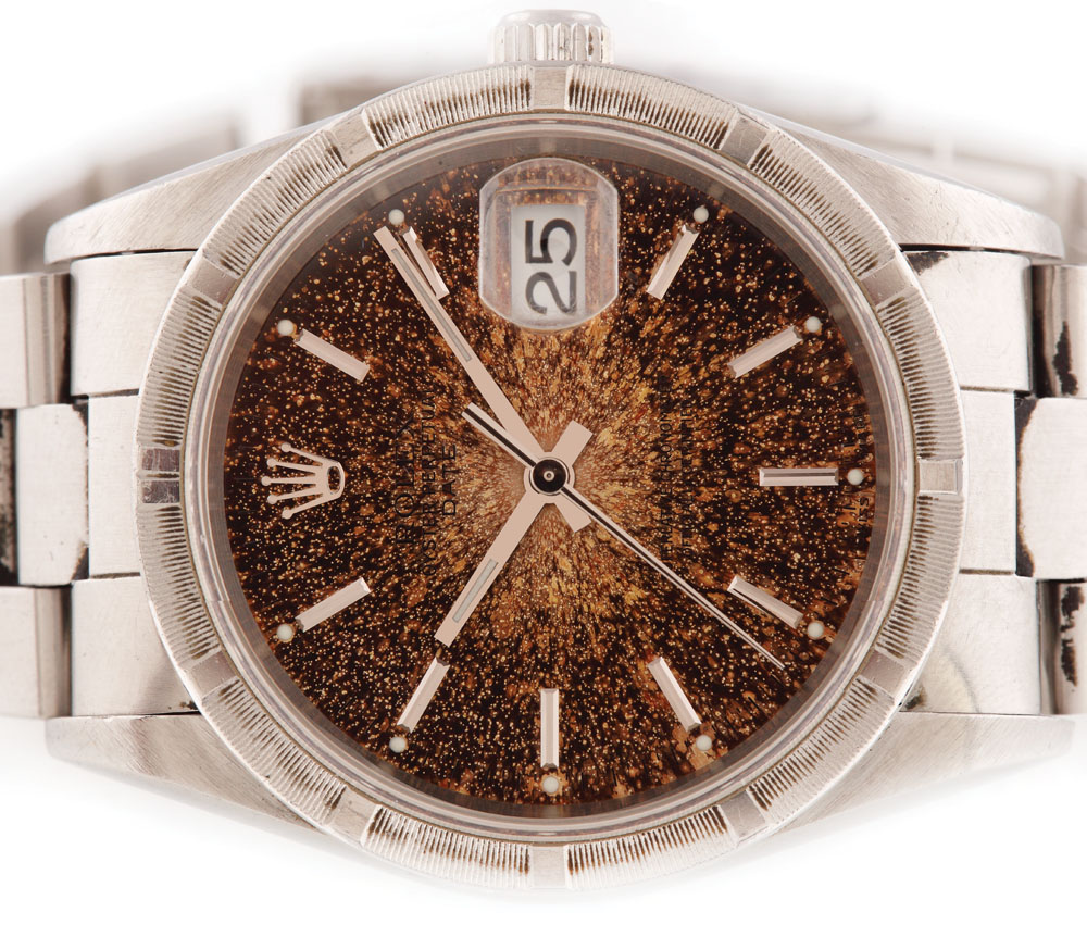 Ceas Rolex Oyster Perpetual Date, de mână, bărbătesc. Mecanism automatic, calibru 3135. Cadran spectacular unic, fenomen datorat unei expuneri îndelungate la soare. Cadranul are lupă, data la ora 3 și geam de safir.