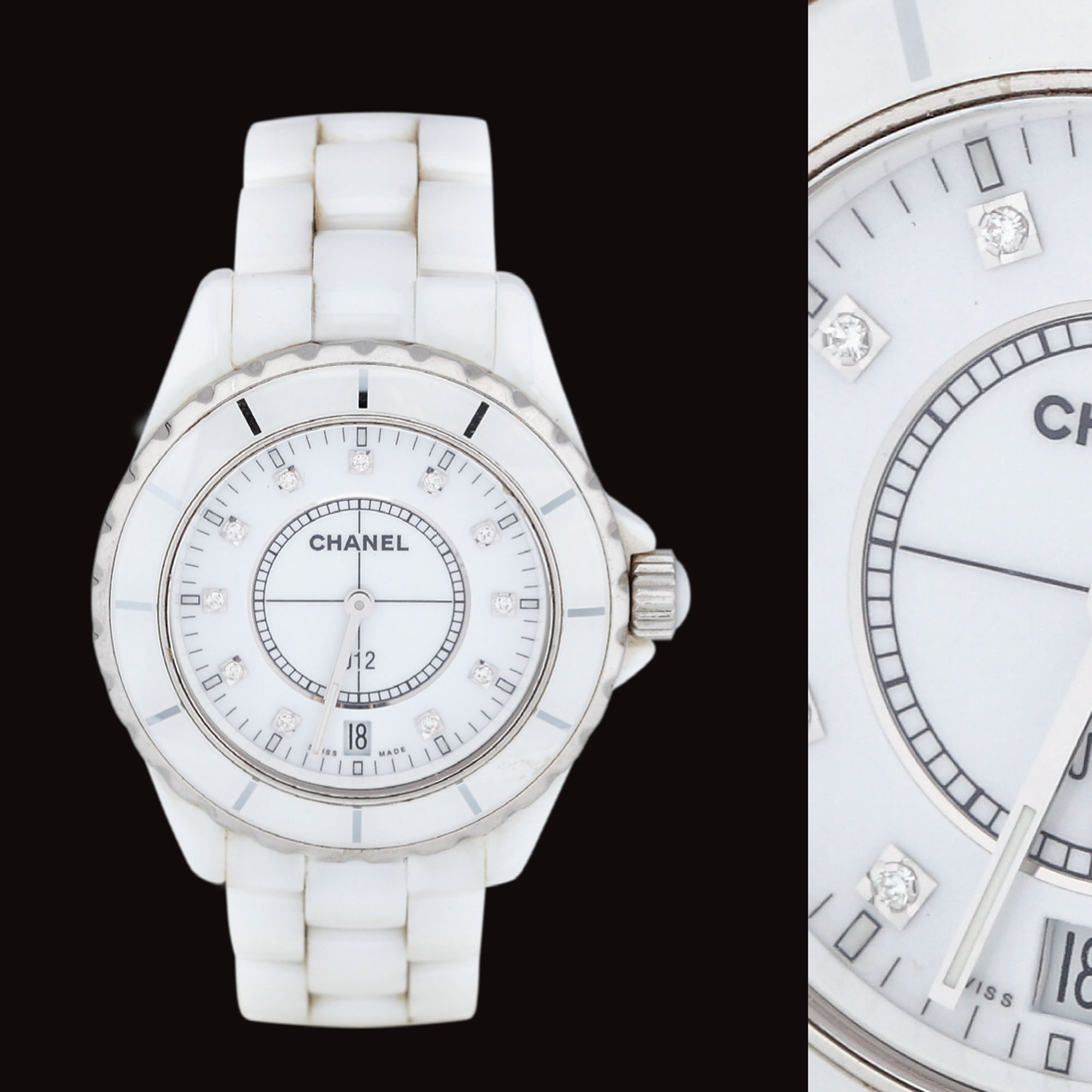 Ceas de damă Chanel în carcasă și brățară din ceramică. Cadran alb decorat cu diamante la fiecare oră, mecanism cu sistem de quartz și calendar în fereastră la ora 6.