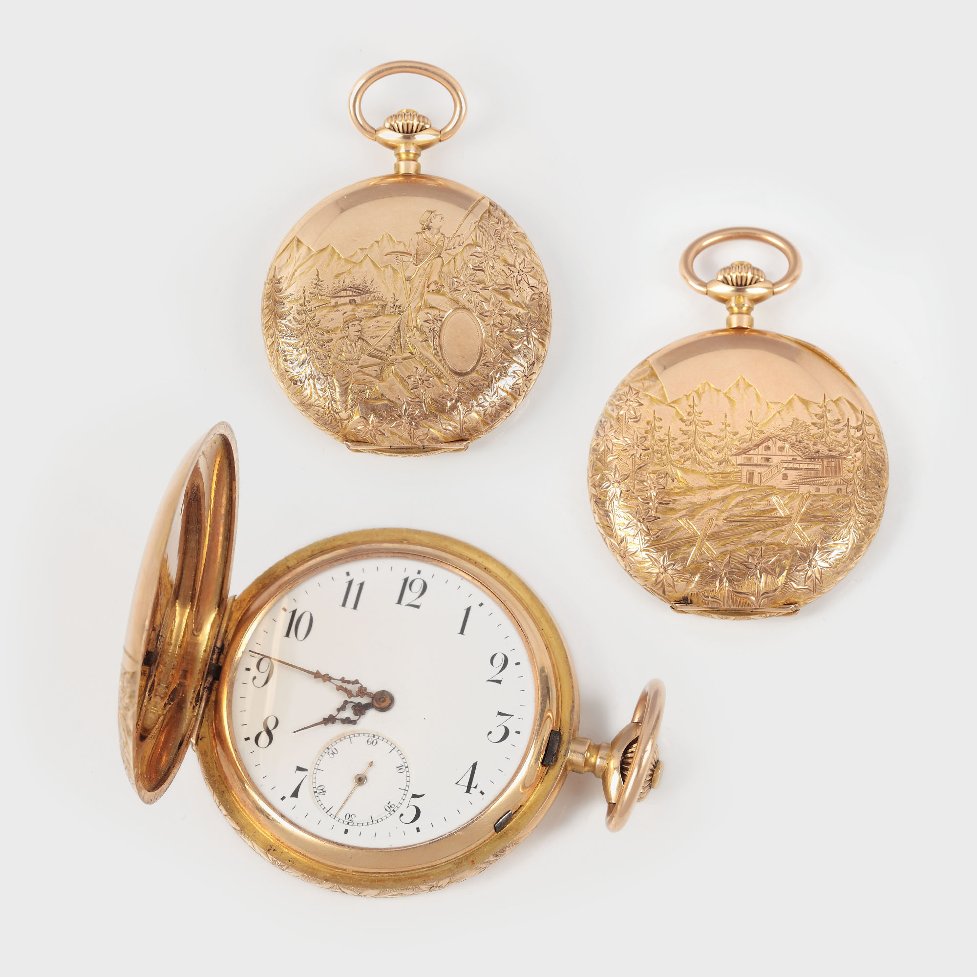 Ceas de buzunar din aur cu trei capace, cu cadran email, gravat, cifre arabe, secundar mic, capace gravate cu decor de pădure, cabane și două personaje urcând pe pantă înconjurate de flori de colț și loc pentru monogramă. Mecanism cu 15 rubine și clemă pentru potrivit.