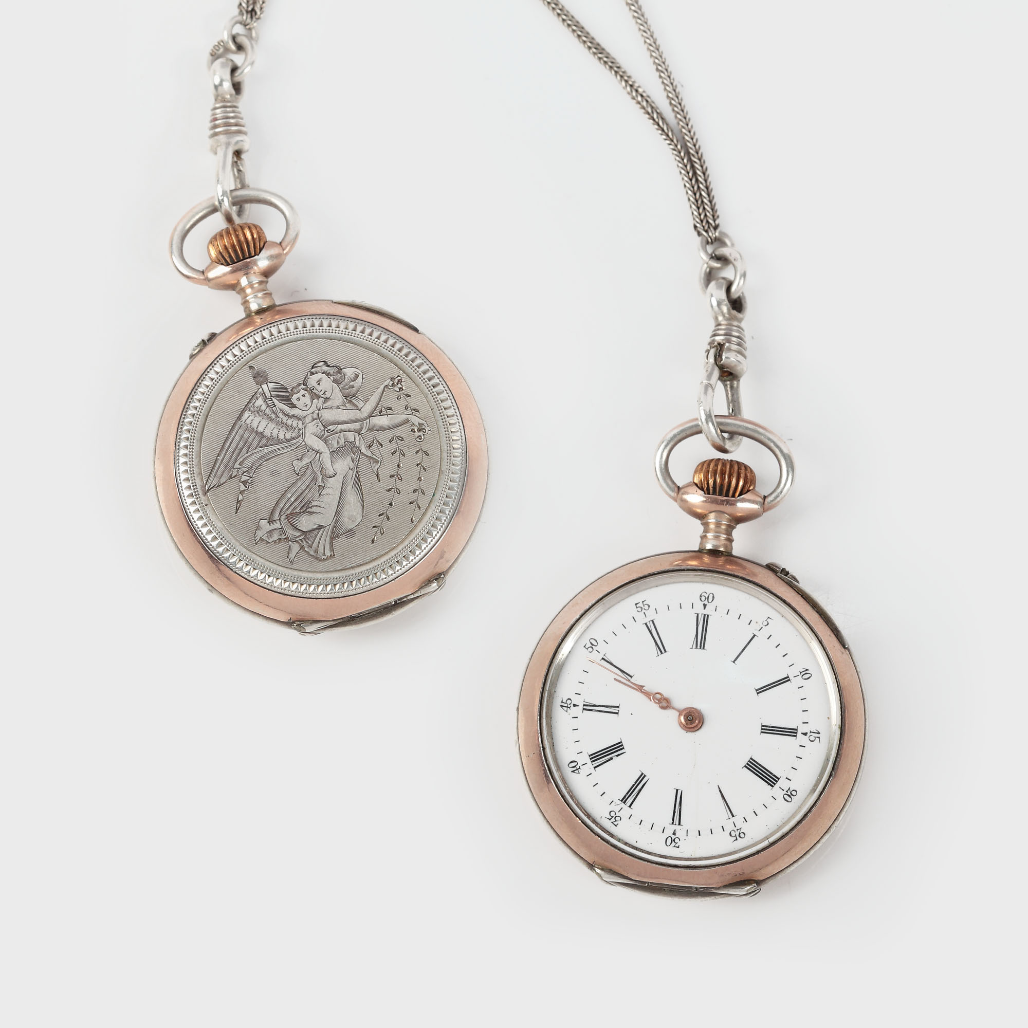 Ceas-pandantiv cu carcasă din argint, având cadran alb emailat, cifre romane și minute figurate din cinci în cinci cu cifre arabe. Ceasul este aurit parțial, un capac din aramă, lanț lung din argint, mecanism cu sistem cilindru, buton lateral pentru potrivit. Necesită revizie.
